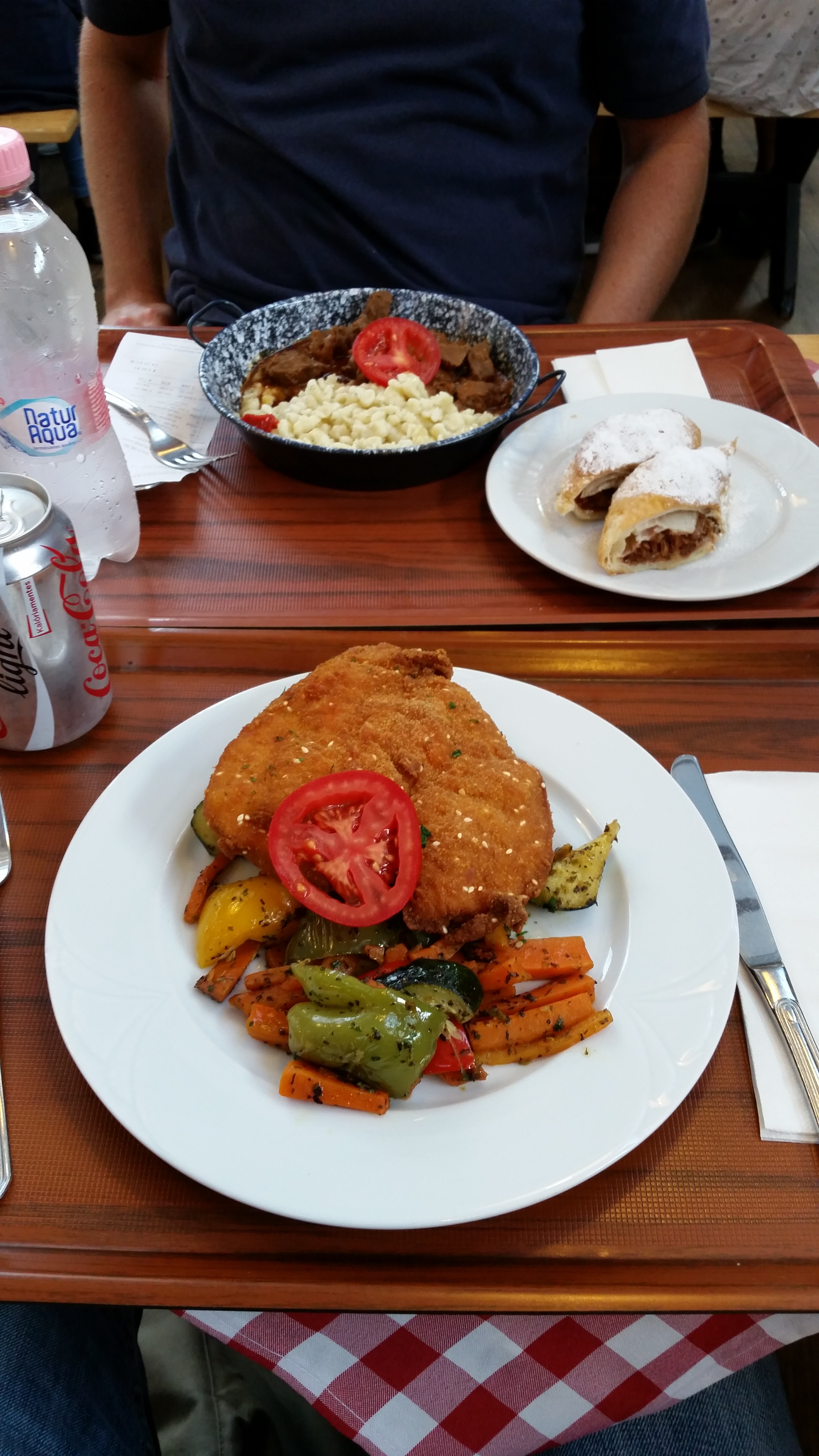 We were a little limited in what we would see today because of the opening/closing times of some of the sites we had planned. We stayed in Pest again today (don’t worry about Buda – we’ll be there tomorrow!), but walked further, heading towards the river and walking roughly along it for part of the day. We started at the Great Market Hall, which is sort of like a massive indoor farmers’ market. Tons of stands/storefronts selling fresh meat and produce, baked goods, souvenirs, and lots more. We debated buying food to make while we’re here, but instead settled on a couple of bakery treats for later. Oops. 🙂 There’s a restaurant called Fakanál Étterem on the second level of the market, so we went there to try some more traditional Hungarian food. It was great! Goulash stew for Scott and Hungarian-style chicken with some amazing roasted vegetables for me. Since the market is such a busy place, I’m sure the restaurant can be pretty touristy, but we enjoyed it and I would highly recommend it. The staff were all friendly and spoke English, so it was easy for us to ask for some recommendations. Pay it a visit! The rest of the day was spent visiting a few other locations, like House of the National Assembly (parliament), St. Stephen’s Basilica, and the Dohány Street Synagogue. I’d love to see the inside of at least some of these buildings, so that’s on the agenda for tomorrow, amongst other things. We won’t make it to everything, but that just gives us a reason to come back here someday, right?