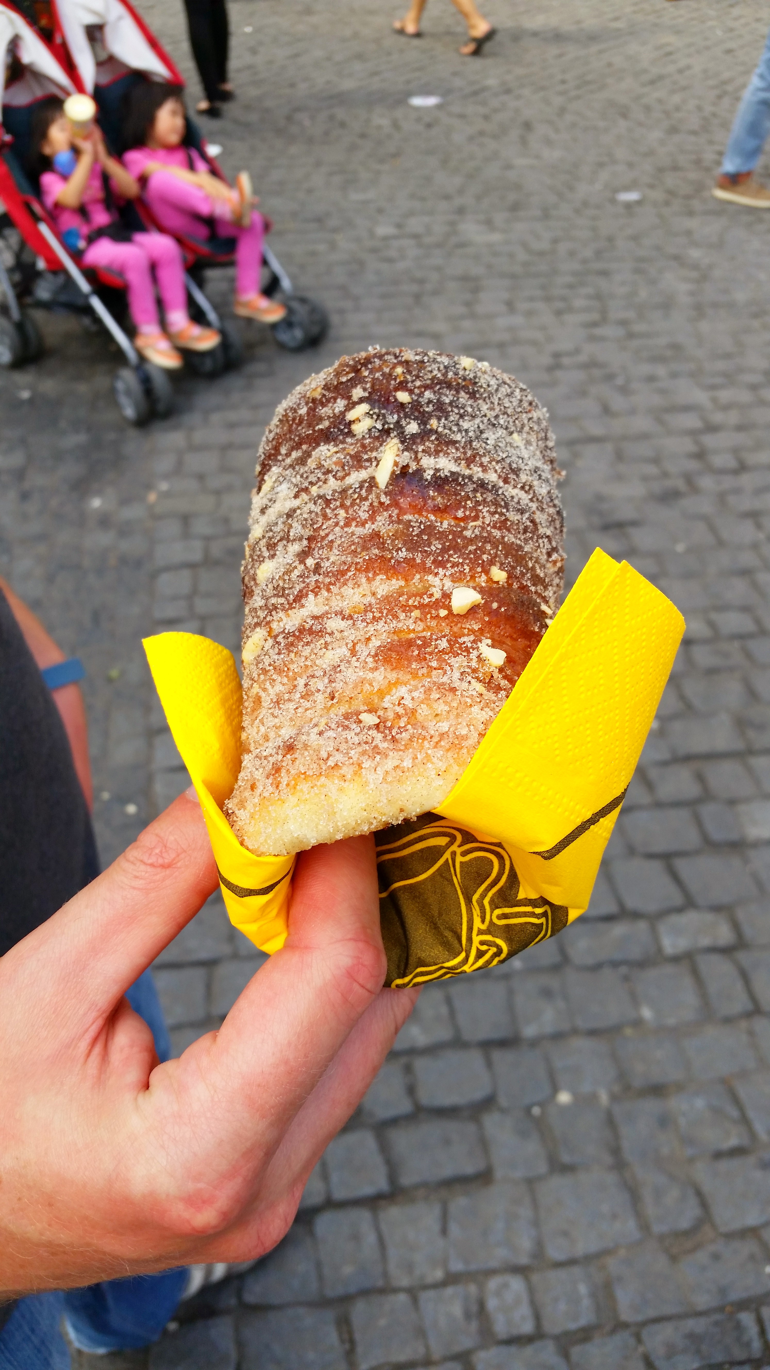 Since today and tomorrow are our only full days here, we’re making the most of them by seeing as much as we can each day. We started today with a return to Wenceslas Square so we could see it during the day rather than early evening. The sun was shining brightly and it definitely felt like summer from the moment we got there, but I won’t complain about getting so much sun! Making our way back down the square was a bit of a hassle though, as there was a large setup happening for some kind of event, so the throngs of people milling around were forced to walk through narrow paths. To ease that annoyance, we treated ourselves to a trdelník, a cake/pastry shaped like a hollow cylinder covered in cinnamon, sugar, and bits of almond. So good! Wikipedia tells me that, although the treat is popular in the Czech Republic, it actually originated in Transylvania. Wherever it came from, it’s delicious, so make sure you pick one up from one of the many stands you’ll see dotted around the streets of Prague.