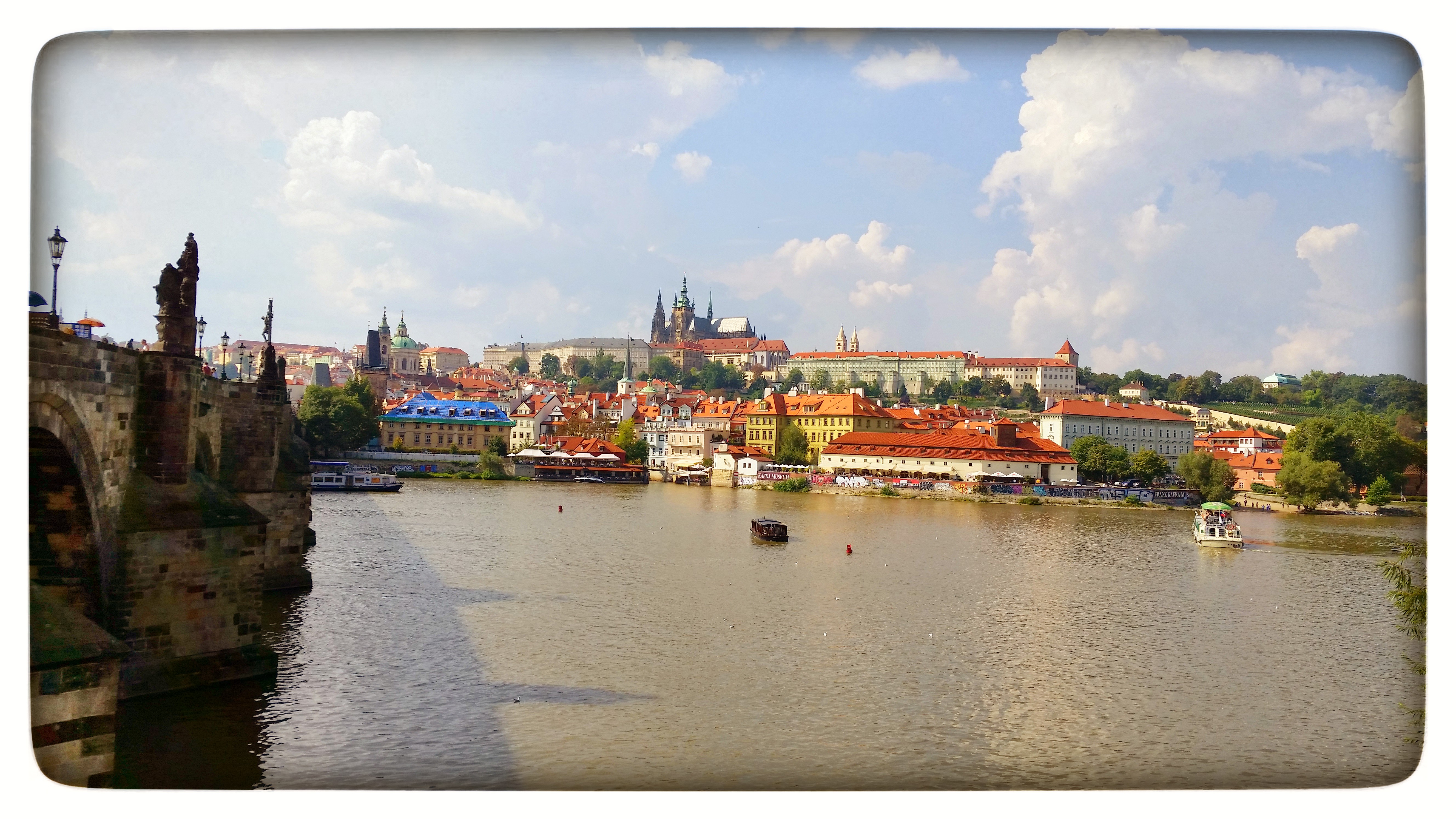 The final stop for the main part of our day was Charles Bridge. Remember how I said there are big crowds around the astronomical clock? Well, there are even BIGGER crowds in, on, and around Charles Bridge! I’ve been told that, to avoid them, the best time to visit the bridge is around sunrise. I bet the views are amazing then, too! We were there around mid-afternoon though and still got great views, especially with the sunny weather. I don’t think it matters when you go though, just go at some point! You get great views of Prague Castle (which we’re planning to see tomorrow) and the area around it. Definitely some postcard-quality views. There are also all kinds of performers, artists, street vendors, and musicians on the bridge, so you get a pretty full experience all in one bridge. Don’t miss it!