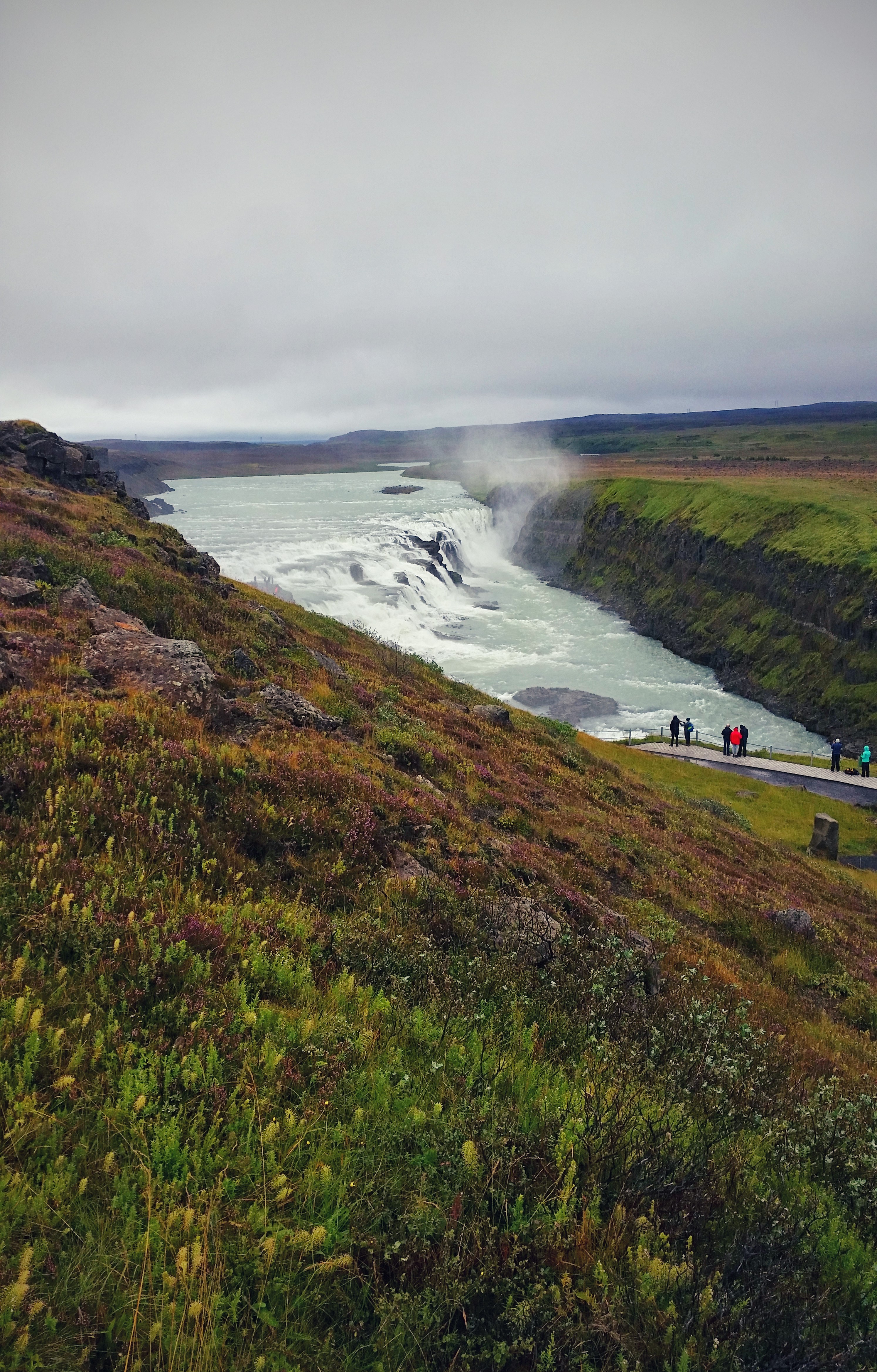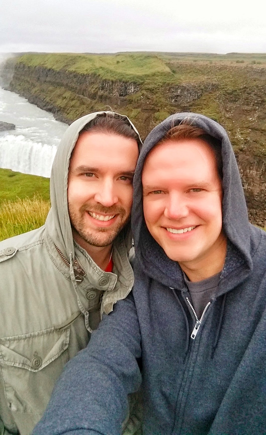 - Gullfoss – okay, this place is gorgeous! Is it another Iguazu Falls? Not at all! But it’s still amazing to see! The thing I love about waterfalls is the rush of water you can hear getting louder and louder as you approach them and then the big reveal when you actually see them. The cool thing about Gullfoss is that you have to walk close enough to see the second, lower set of falls – otherwise it looks like the higher set just flows off the earth! We had an hour here, which included time to eat, and I could have easily spent more time here. The rain had stopped, but the sun hadn’t quite started to break through yet, so our pictures probably aren’t as amazing as they could have been. You also have the opportunity to walk to a few different vantage points (some of which look like they’ll soak you, so be warned!) and I would love to have been able to explore them more. Either way, this was the highlight of the day and I suspect it will be a highlight of this whole trip. Don’t miss them!