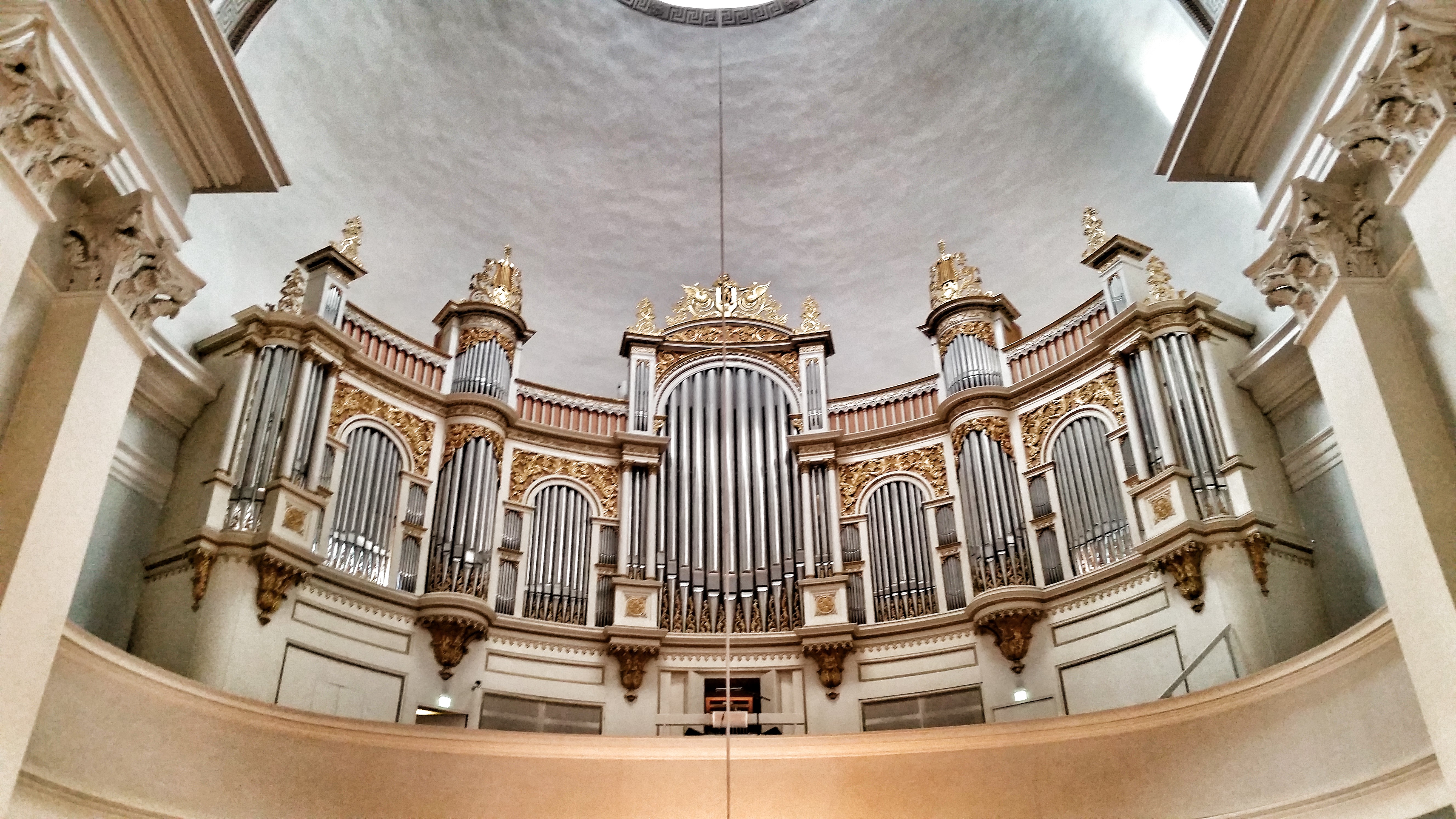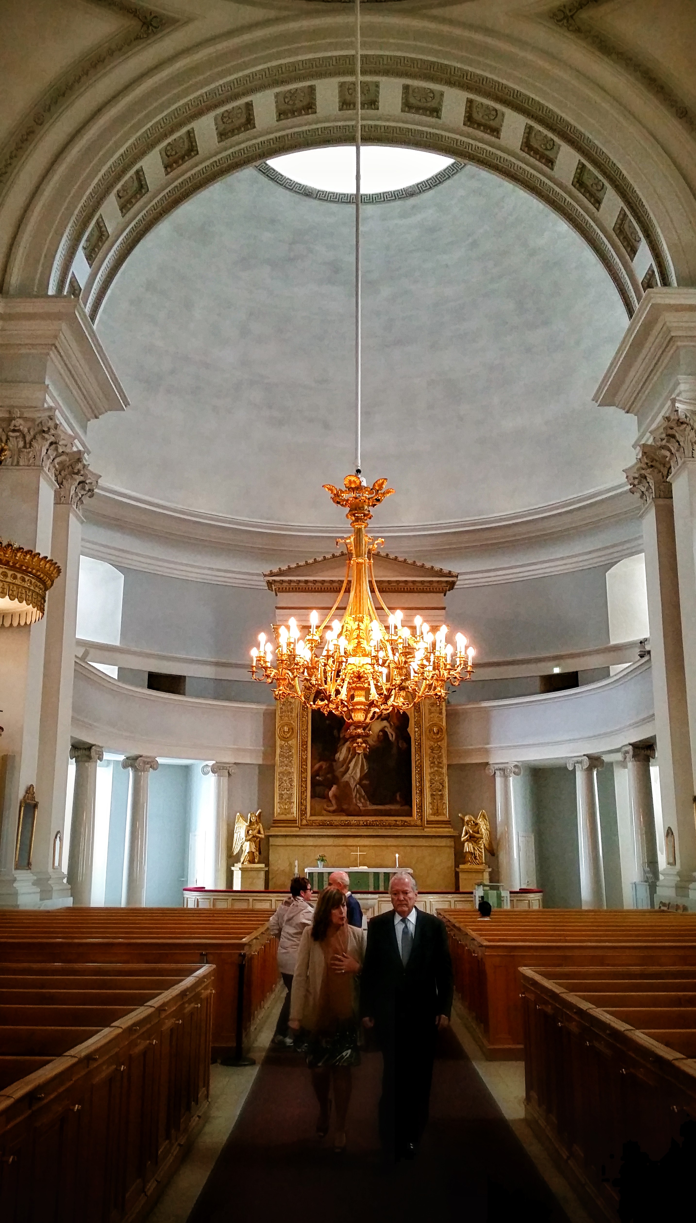 - Helsinki Cathedral – our first problem-free stop of the day! A bit of the cathedral is unfortunately also covered in scaffolding, but that didn’t impact the views of it too much. This cathedral doesn’t look too much like a church and it also looks far newer than something that was completed in 1852 (to me, anyway). It sits atop a tall flight of steps in Senate Square, so you definitely won’t miss it as you approach! It’s free to enter and certainly makes a worthwhile addition to your Helsinki itinerary. The domed ceilings and pipe organ are highlights!