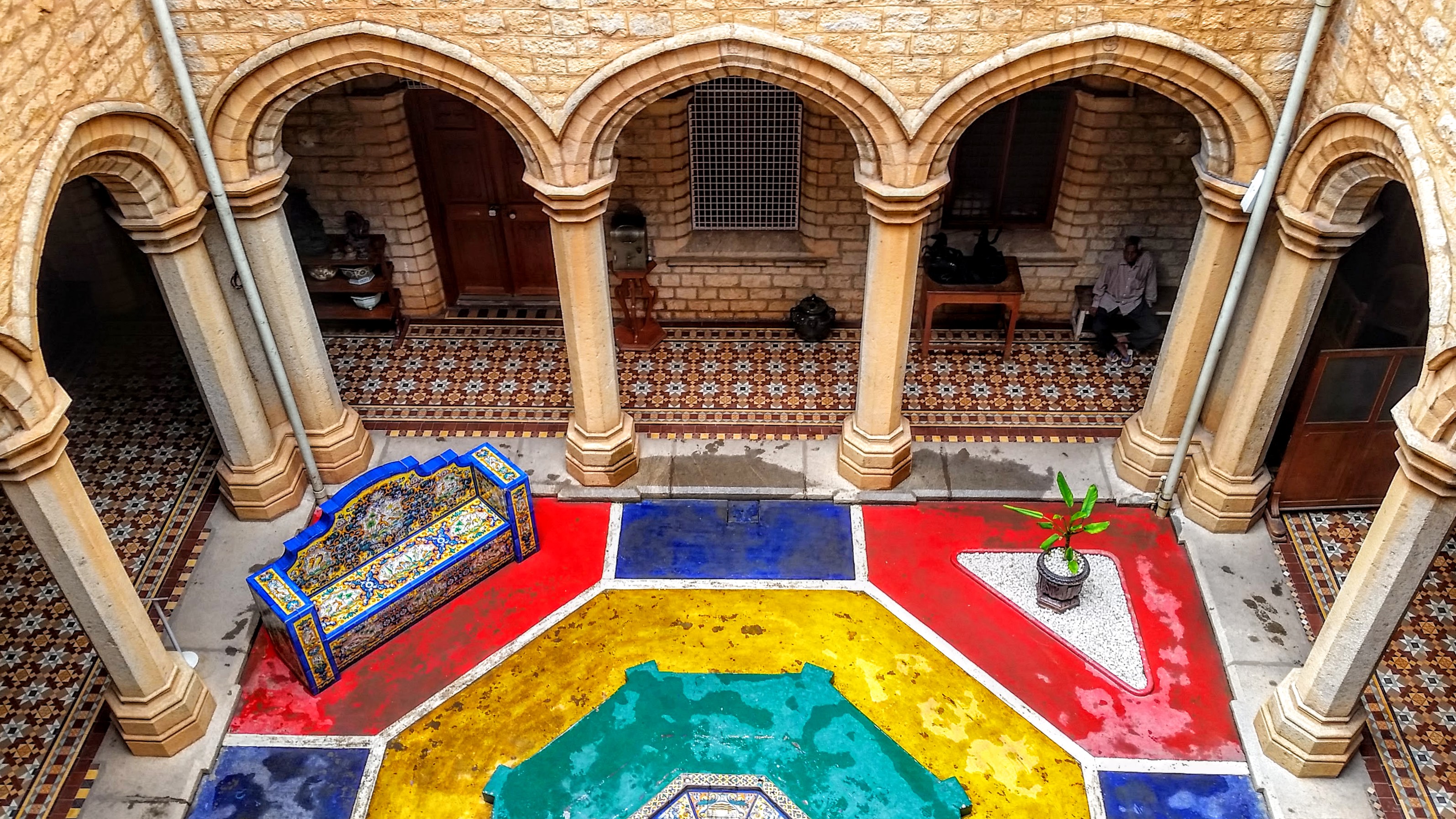 Looking down into a colorful courtyard at the palace.