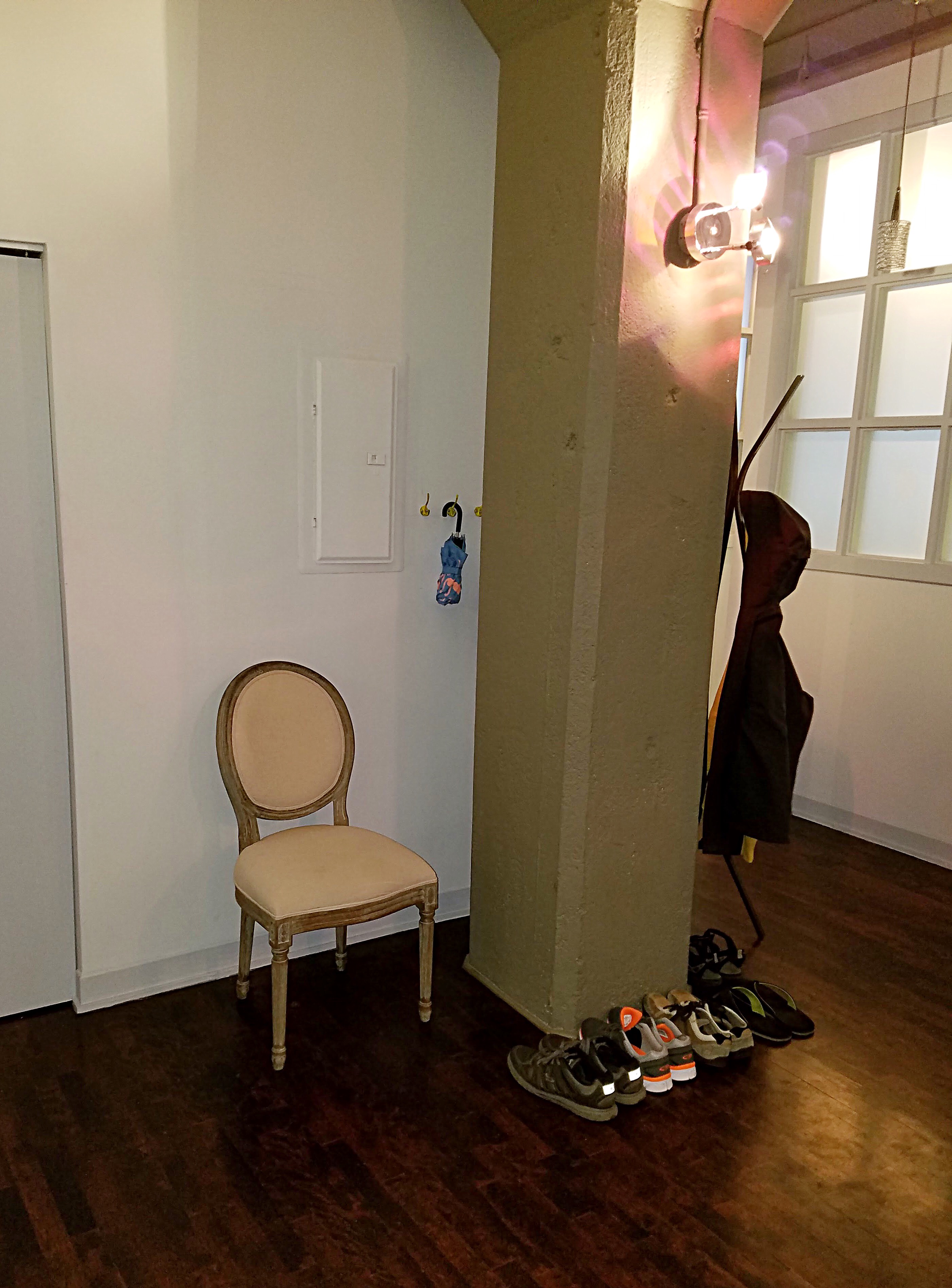 The area just inside the front door, which includes two pretty big (and tall) closets (to the left and right) and a laundry closet, which you can see the edge of here.