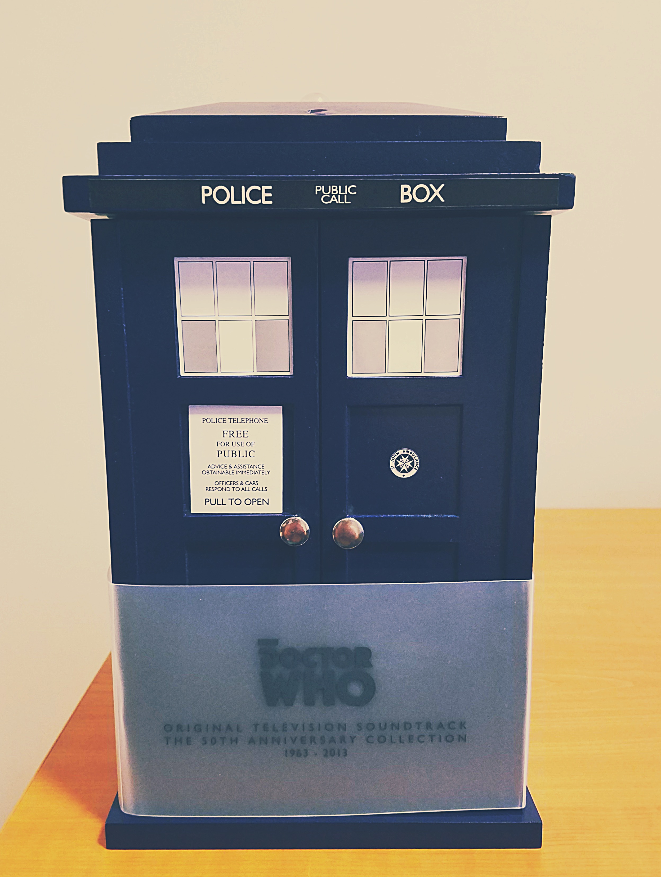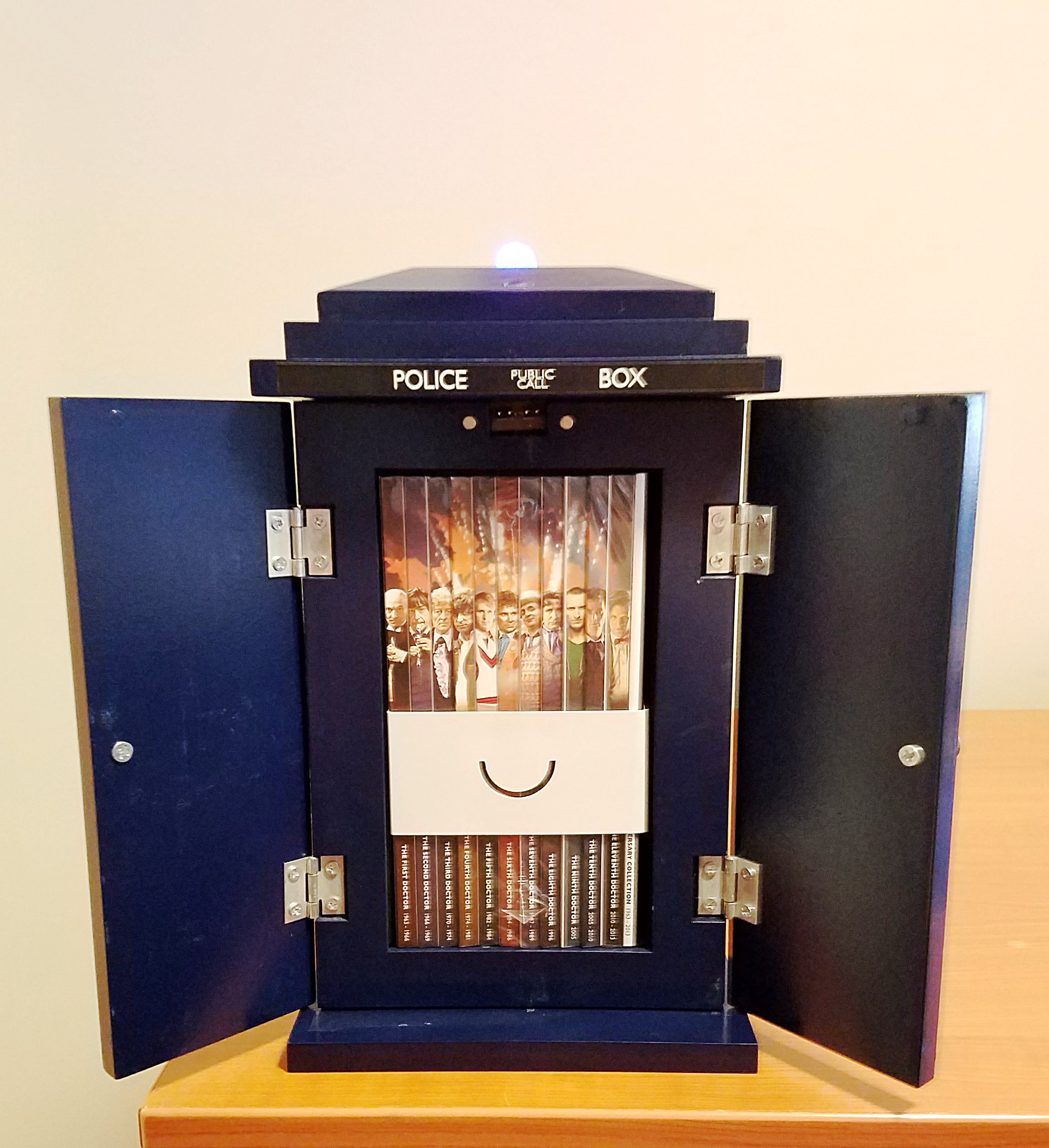 When you flip the switch on the back and open the doors, the box plays the TARDIS landing sound and the light on top flashes.