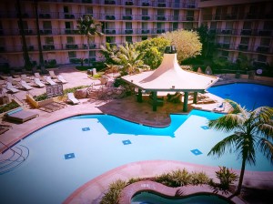 How did it get to be mid-August already?!? Or perhaps, more accurately, how have I managed to not blog about the LA trip I took months ago?? Time to fix that! Regular readers won’t be surprised to learn that I made another return trip to Los Angeles (my 16th consecutive trip!) for my favorite Doctor Who convention, Gallifrey One. I SO look forward to it every year, mostly for a long weekend in (usually) good weather with friends – the Doctor Who stuff is just the icing on the cake. πŸ™‚ This year, I was particularly excited for the fact that Lalla Ward, an actress from the Fourth Doctor’s era of the original run of the show, would be making her first appearance. There aren’t many people from the classic series (who are alive) that I haven’t met before, so it’s always fun when I’m able to meet a new-to-me guest. Sadly, the weather didn’t look like it was going to cooperate as nicely as it had the past several years, which was a bit of a bummer. There have certainly been years where the weather was in the 50s and rainy (we are always there in February, after all), but at least the last four years have been sunny, warm, and basically perfect, so any weather that broke the streak was always going to feel extra icky. Upon my arrival on Wednesday and through Thursday, we did have the gorgeous, sunny weather we’d gotten used to and the actual weekend weather, while rainy and cloudy at times and cooler overall, didn’t end up being too terrible. Of course, we always spend most of the weekend (Fri-Sun) in the hotel doing convention stuff, but my friends and I always get rooms with balconies overlooking the pool (we even managed to snag adjoining rooms for the second year in a row!), so it’s nice to be able to relax, drink, and talk on them throughout the weekend.
