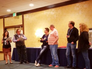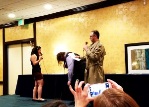 Convention guests Richard Dinnick, Naoko Mori, and Gareth David-Lloyd helping to bring the convention auction to a close on the Sunday afternoon.