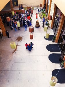 Peering down to the convention level from outside the hotel lobby at some point during the weekend (no rain!).