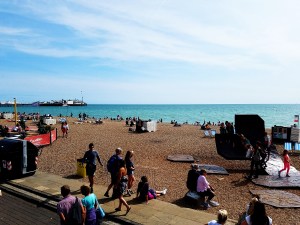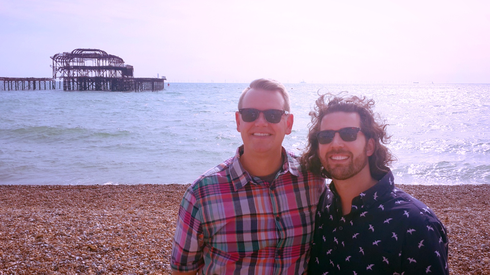 It’s already Friday! The sun is shining and there’s a nice breeze coming in from our patio as I write today’s blog from our London flat. Of course, London isn’t where we spent our time yesterday as we went spent the day in Brighton. And what a great day it was! For the uninitiated, Brighton is a seaside resort town on the south coast of England, about an hour’s train ride from London. Because I have friends there, I’ve been there several times over the years, but Scott had never been before, so I knew we had to make it part of this trip. I took a bit of a gamble and booked train tickets a few weeks ago (a gamble only because you never know what the weather may do in England), but it paid off because the weather couldn’t have been more perfect (sunny, warm, and a bit of a breeze) and we had a lot of fun spending the day with my friend Matt and later my friend Steve (he joined us after he finished his day at work).