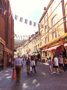 A street on the edge of Chinatown, complete with rainbow flags (presumably for Pride) at the top.