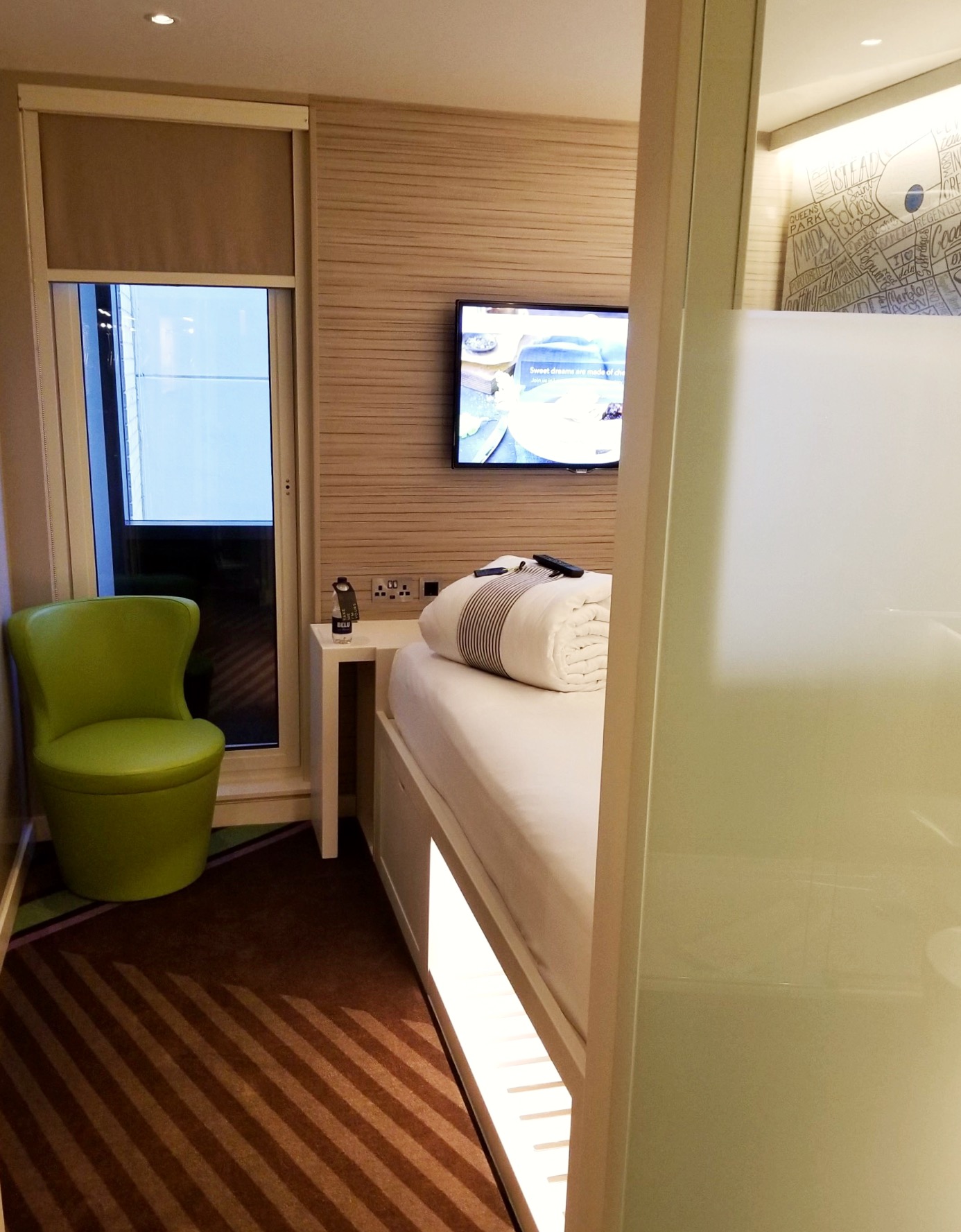 Although I did consider an Uber (as Scott and I did in August), I decided to stick with my standard transport of taking the Underground into central London. It seemed to fly by pretty quickly this time (perhaps because I spent most of the train ride trying to figure out why my phone wouldn’t connect to a network, which I eventually got sorted), with just one station change at Gloucester Road to hop onto the Circle & District to St. James’s Park, which is about a two-minute walk to my hotel. I’m staying at the hub by Premier Inn – London Westminster Abbey, where I’m just down the street from Westminster Abbey, Big Ben, and lots of other London sights. It really is a perfect location! Since I’ve actually only stayed in a London hotel once, I did a lot of research to find a good option and this one hasn’t disappointed. The reviews are all really positive, both about the staff and the hotel itself, and I found that to be true as soon as I checked in! Ava at the front desk was very bubbly and helpful and made sure I got a room early, since I arrived an hour before check-in time. She even made sure I got a room with a window (since not all the rooms have them in this hotel), which I appreciated. I did run into a minor problem when I got in the room and the AC seemed to not be working (and before you ask, it’s not hot outside by any means, but I can’t stand to be in a still room with no air circulation and I hate being hot, so AC is a must when there’s no window that opens). The staff were helpful again though, saying that they’d actually been having problems with the whole building for the past couple of days (eek!), but that it was nearly fixed. Within about 20 minutes, it was working fine and it was perfect through the night last night – I was cold when I woke up! I sleep best when I’m cold, so that was perfect. 🙂 Here’s what the space looks like: