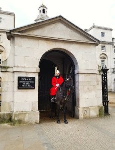 Outside the Horse Guards. Note the sign next to the horse.