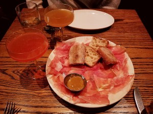 And compose we did! They have a whole section of the menu called Country Hams, which I thought had some deeper meaning (as if “country ham” was a reference to a type of food), but it wasn’t that deep – it was literally ham. They had several options and we went for Benton’s, which was described as “silky, with high salinity.” Those were very accurate as this ham was VERY salty, but also super delicious. It’s not a lot of food as the ham is sliced very thin, almost like prosciutto, and it’s served with a few small pieces of crusty bread and a spread that was flavored intensely like coffee (the only thing I didn’t like as I don’t like coffee).