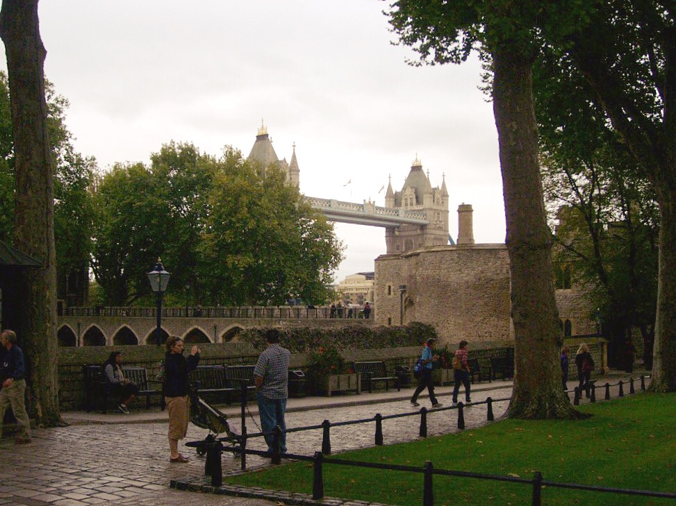 The grounds of the Tower, with Tower Bridge peeking through the trees.