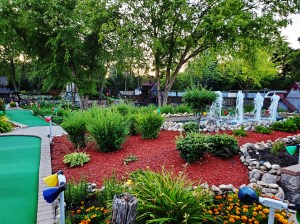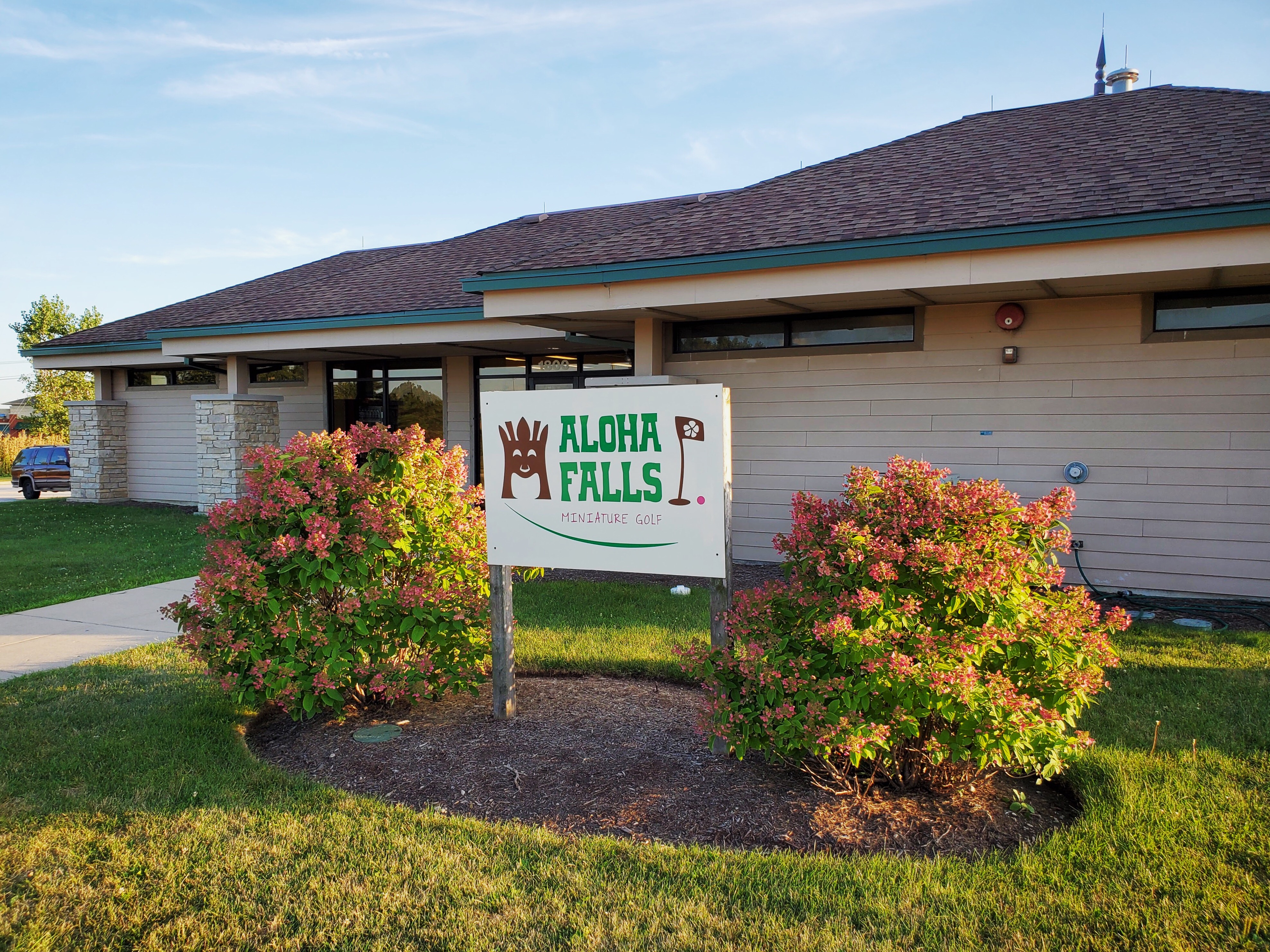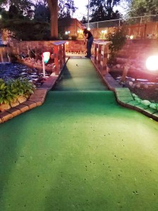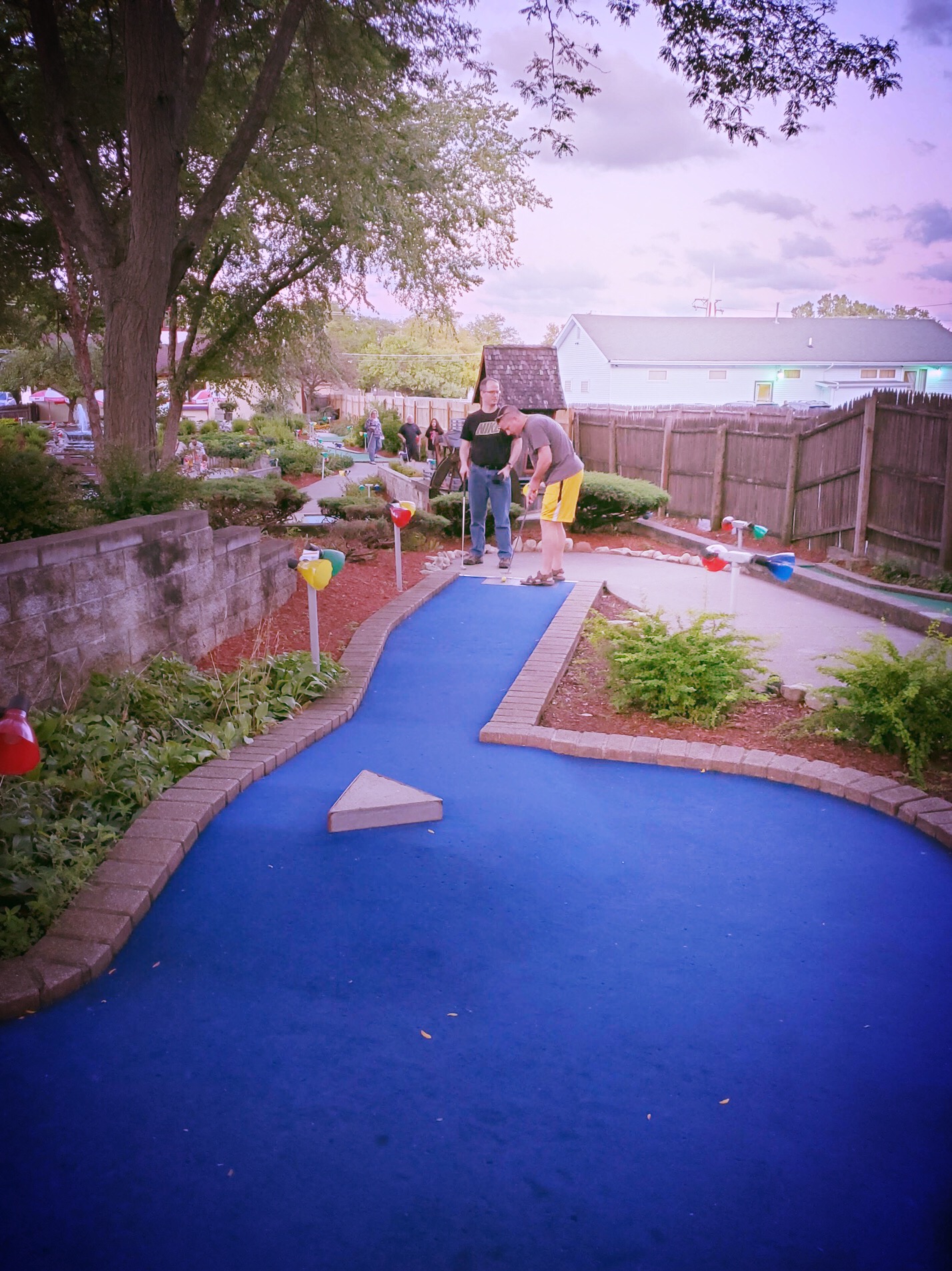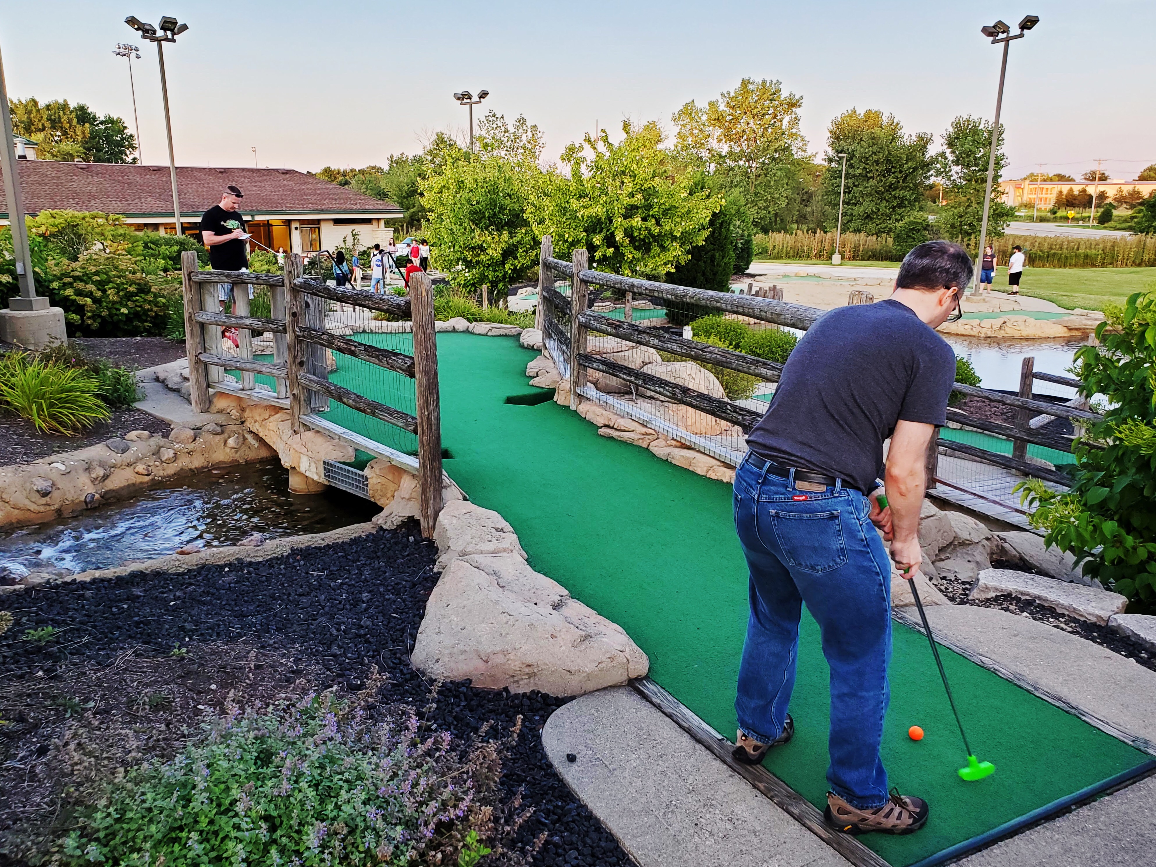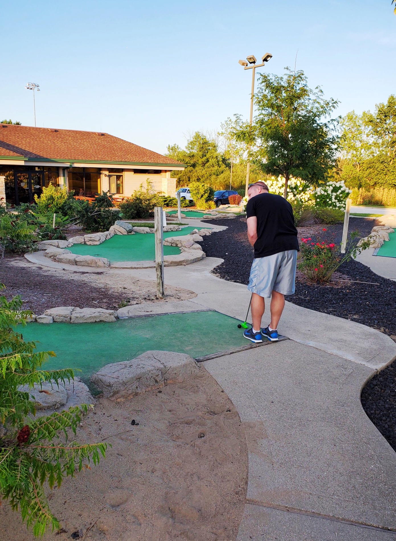 After a whole day on our feet, no food (not deliberately, but we just didn’t get around to eating), and almost 20,000 steps, we figured we would stay on our feet and squeeze in another round of mini-golf. Why not, right? This time we went to Aloha Falls, which Chris had found online, but it’s only open on weekends, so Saturday was the only chance we could go. This course was definitely newer and in better shape than Lighthouse, but it was more challenging for sure. We still had fun, even if I did come in last place (despite winning the back nine!).