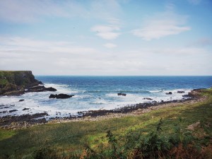 From the castle, we moved on to Bushmills Distillery, where they make Irish whiskey. As we established in Edinburgh, neither of us drinks whisky (or whiskey, though we’re happy to learn about it), so this wasn’t exactly an important stop for us. Thankfully though (for us), our day trip didn’t include a tour of or samples from the distillery (though you could choose to buy whiskey samples from bar, if you so desired), but it was our lunch stop either way. We were originally going to eat in the distillery’s cafe, but there was a long line and the food didn’t seem to be anything special, so we opted to pick up something quick from the market across the street. That was also not fancy or special, but the sausage rolls and jambons (which are like savory turnovers) we got were really tasty. Since we still had time after that, we were going to walk through the town of Bushmills, but it started to rain, so we just went back to the distillery and relaxed for a bit before boarding the bus for our next destination.