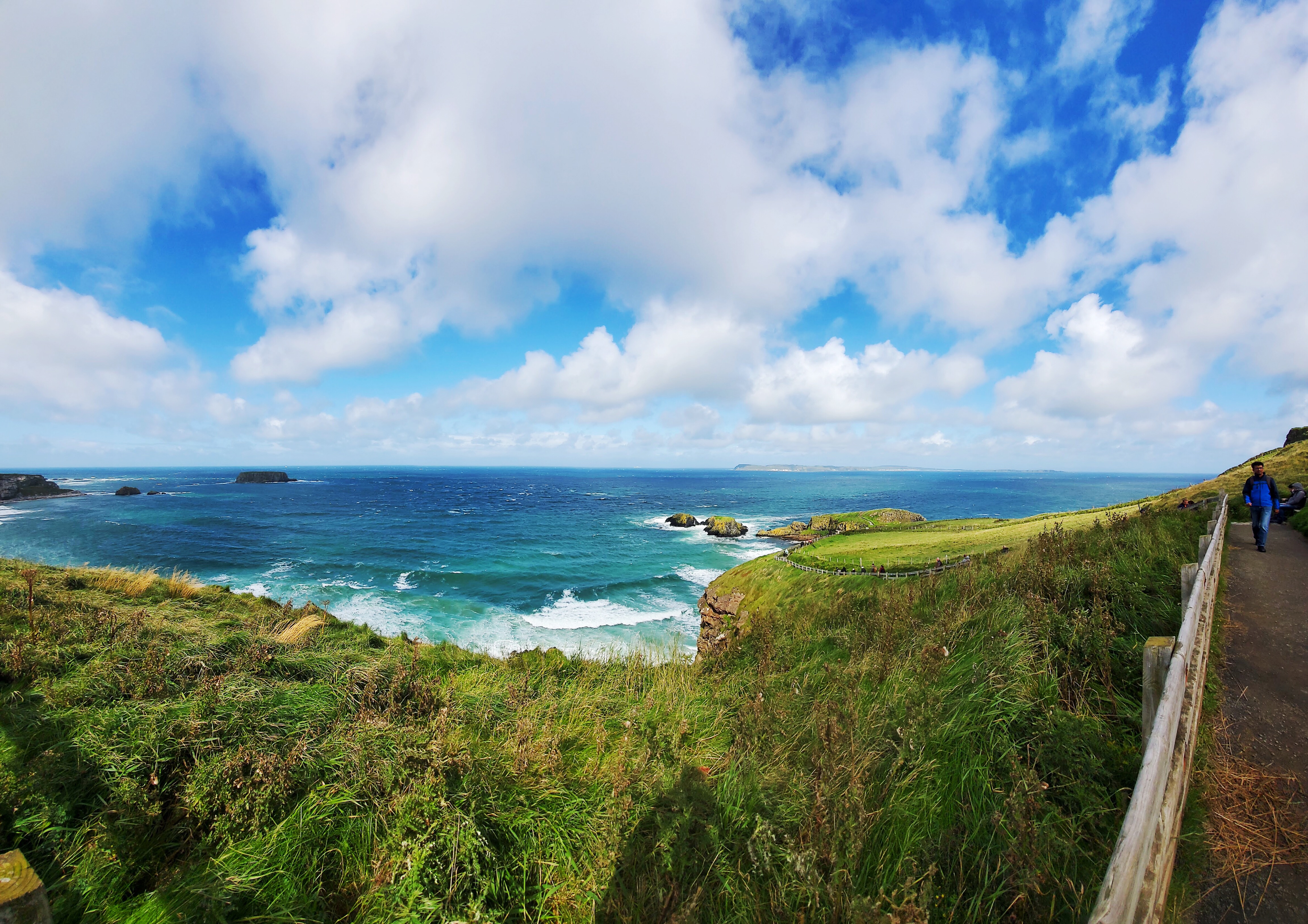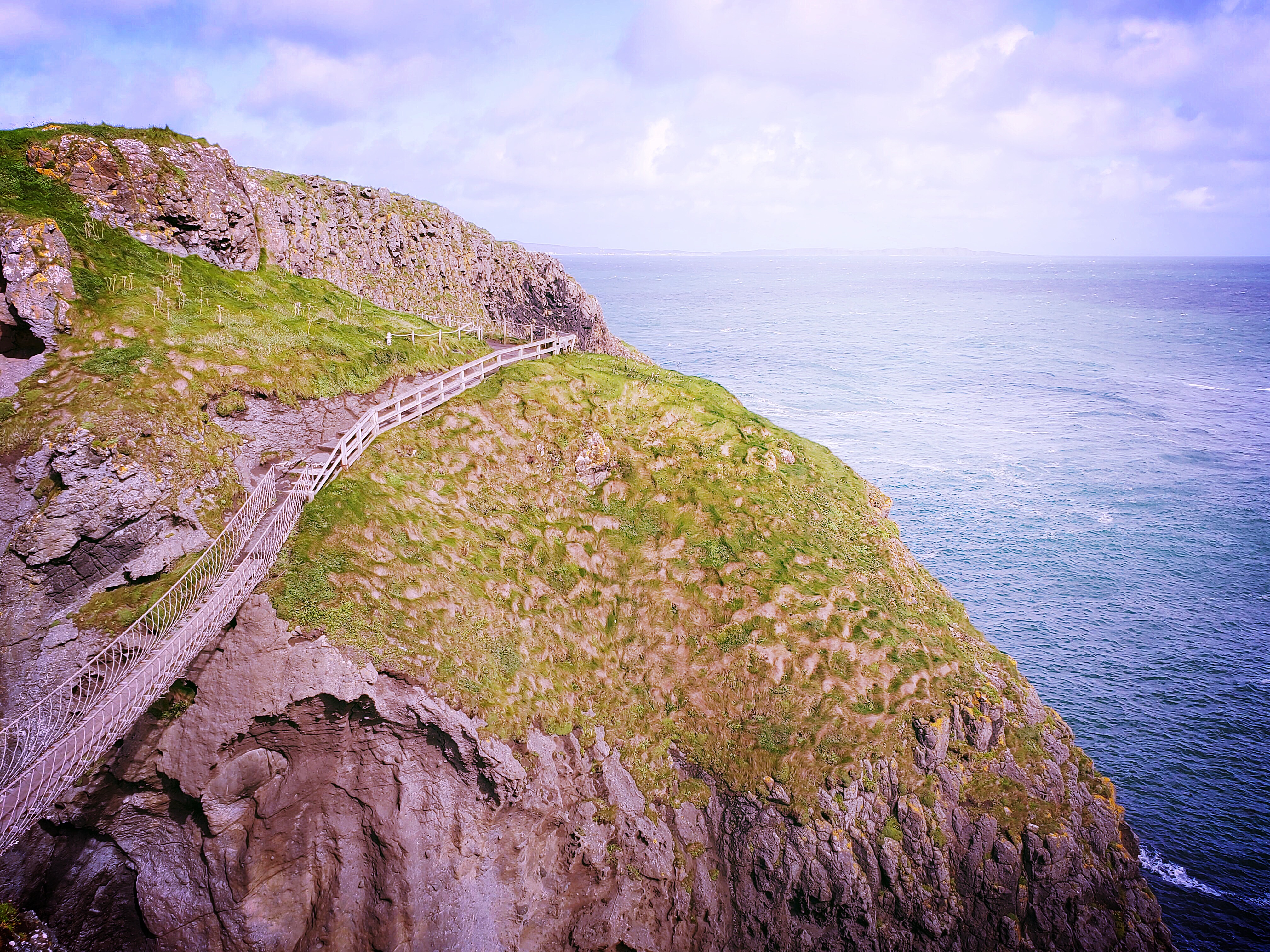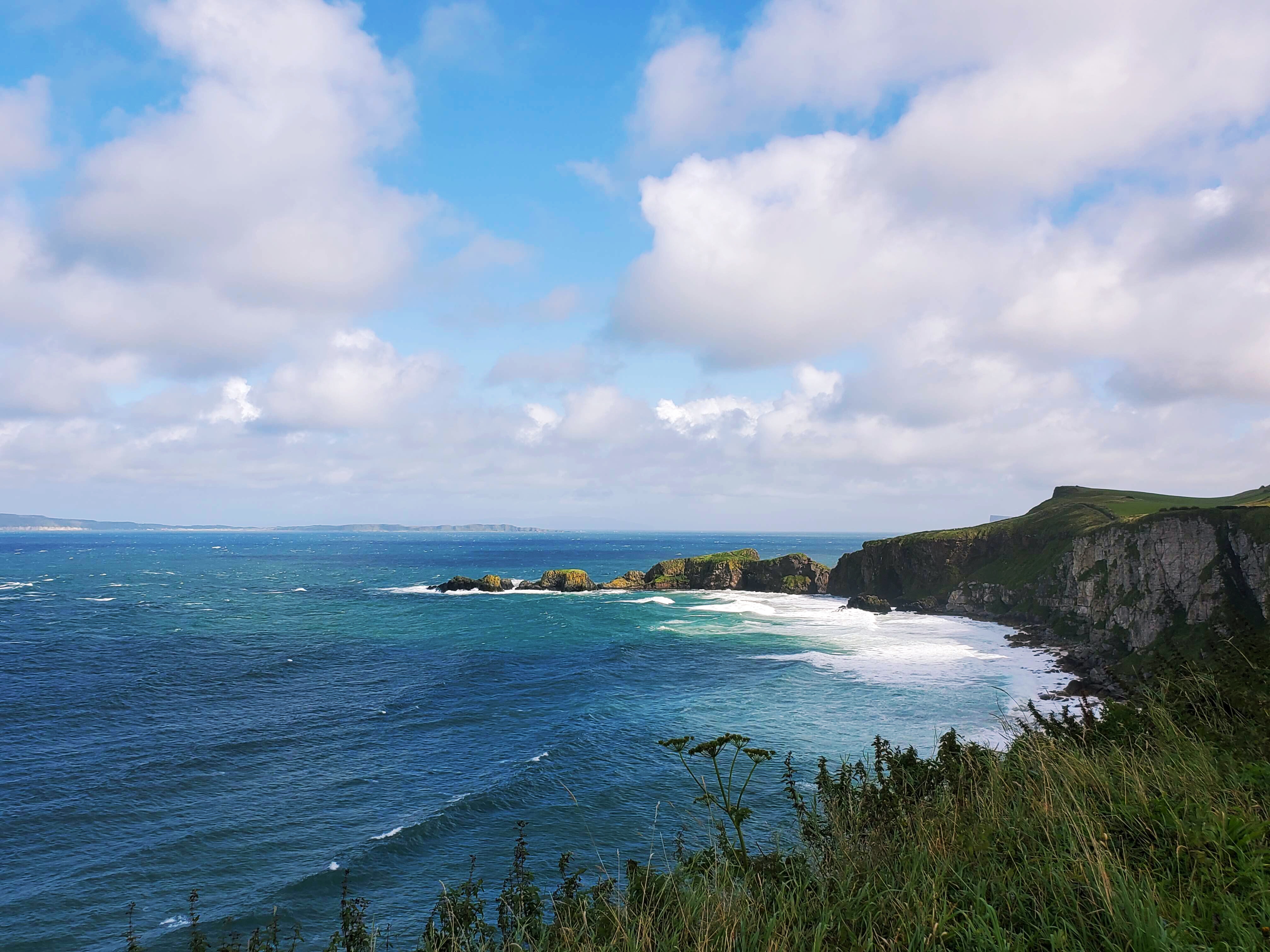After the distillery, it was time for our other big stop, the Carrick-a-Rede rope bridge. This is exactly what it sounds like – a rope bridge that crosses over the water and leads to a lookout point. It was originally built as a way for fishermen to drop their nets and easily catch salmon as they were spawning, but Stephen told us the last time a fish was caught there was in 2002, so today it’s just a tourist attraction. As mentioned above, we didn’t get to actually walk across the bridge due to the high winds, but as with the causeway, we had a nice, leisurely (and windy) walk from the bus to the bridge with more amazing scenery, so not getting to actually cross the bridge didn’t feel like a huge loss. Yes, it’s just a rope bridge and yes, it would have been nice to have done it to say we’ve done it, but I don’t think we missed out on a whole lot. We were told there are some days where the winds are bad enough that visitors aren’t even allowed to walk up as close as we did, so I’m glad that wasn’t the case today!
