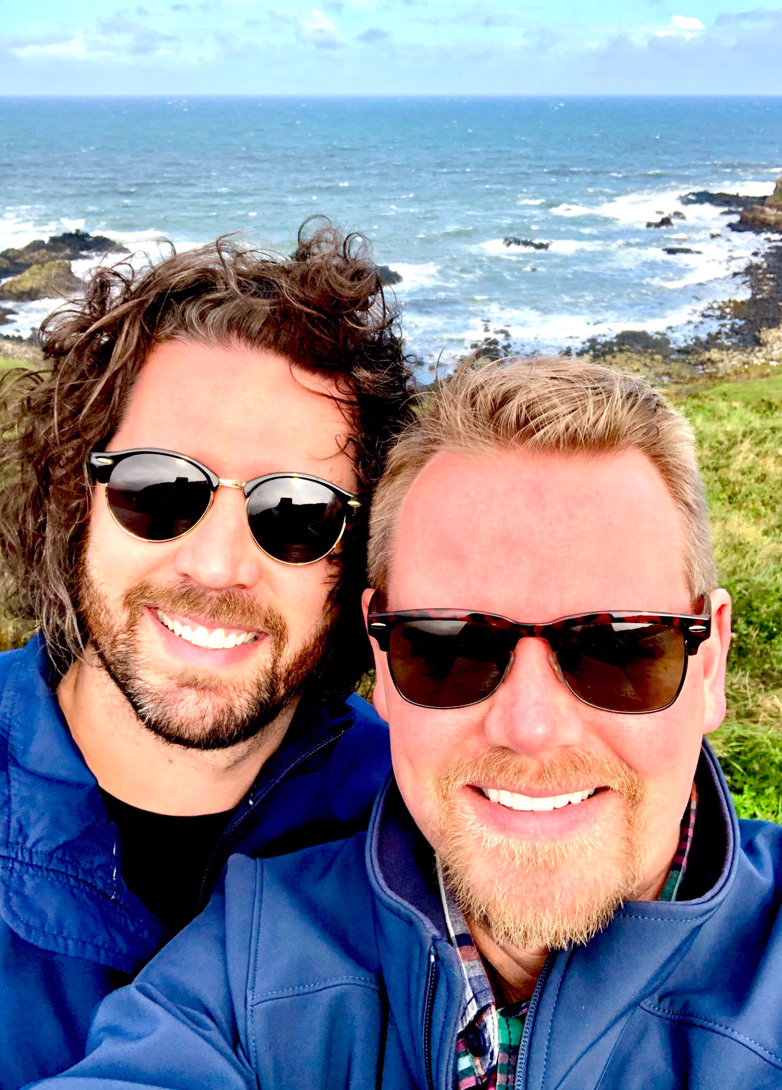 Let’s get a little bit of unpleasantness out of the way first – weather. After a glorious day yesterday, today’s weather was a bit more iffy and ended up causing us to not be able to cross the Carrick-a-Rede bridge. Being a rope bridge, it’s closed when winds exceed 35 MPH and because it’s right on the coast, completely exposed to the elements, it’s not unusual for winds to reach those speeds, even if it’s not that windy slightly more inland. And when we first reached Giant’s Causeway, it started to rain (it had already been cloudy, but wasn’t yet raining), which was a downer. That said though, the rain stopped just as we were getting off the bus at the causeway and IT DIDN’T COME BACK ALL DAY!! So yes, we did have a lot of wind at times, but the actual air temperature was really nice and we had at least some sun for most of the day. It was a bummer that we didn’t get to cross the rope bridge, but on the plus side, we still got to visit it and take lots of pictures, the scenery was BEAUTIFUL, and as a nice bonus, we got a couple of little consolation prizes (a coaster and a magnet – apparently they hand them out to visitors who can’t cross the bridge due to closure) and we also found out we would get a partial refund, since our day trip cost included entry to the bridge (and I already contacted Viator and they have already issued the refund). Considering what the weather was like here on Wednesday (and Stephen confirmed the rain and wind we experienced in the city paled in comparison to what the group on this same tour on Wednesday had to deal with), I think we were really lucky to get the relatively good weather we had today. So I’m not complaining!