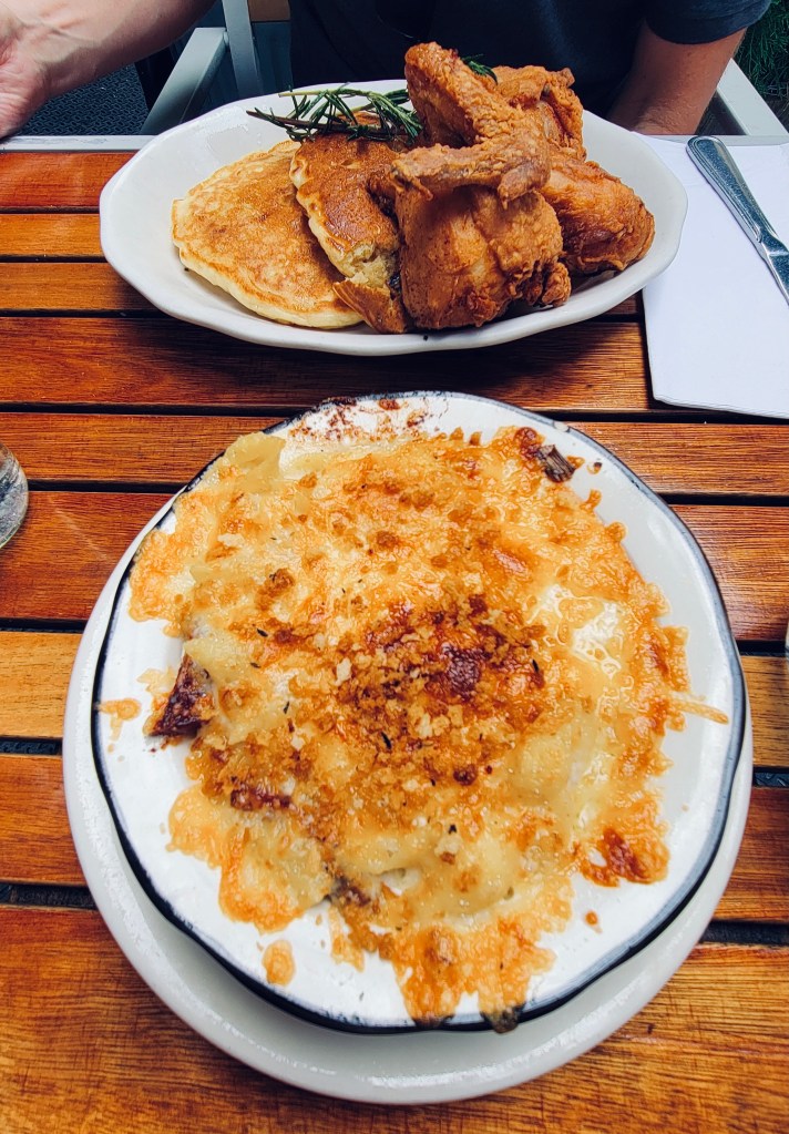 I don’t always love eating outside, but we were in the shade, so it wasn’t hot, plus the hustle-bustle of passers-by made for a good atmosphere. Oh, and the food was pretty delish, too! With solid COVID protocols in place, we scanned a QR code on our table to view the menu (the staff were all in masks, too – there was also a sign outside saying vaccinations were required to eat inside) and quickly landed on biscuits and gravy with breakfast potatoes (for me) and chicken and pancakes (for Scott), plus some bacon mac-and-cheese (to share). Did we need all that deliciousness? Not really, especially when we saw how big the portions were, but it was all so good! Scott’s pancakes could have used a little more syrup (but it was a bourbon maple syrup, so more of it may have overpowered the sweetness of the pancakes), but we were very satisfied overall. I will say it was a little bit on the pricey side, with our meal coming to ~$85 with tip, but the quality and quantity of the food are pretty worth it.