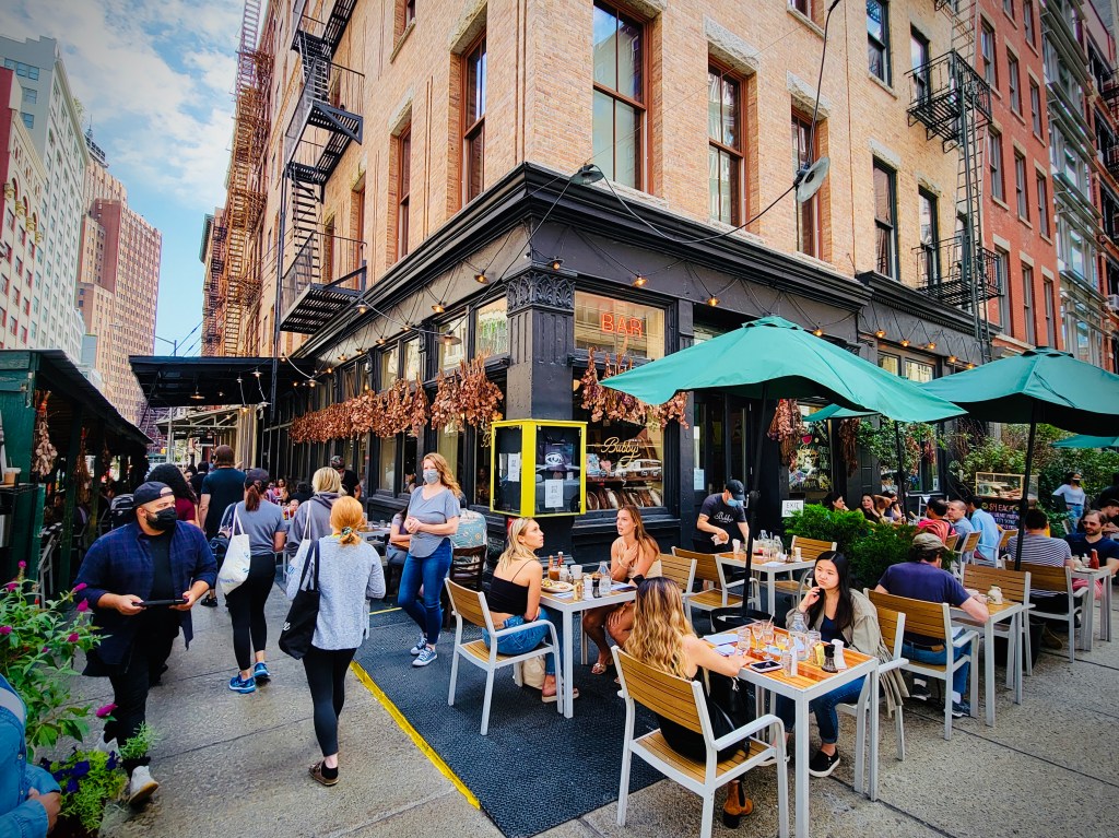 It will probably come as NO surprise to learn that the only thing we wanted to do was grab some brunch. Although we did make reservations for some meals, we didn’t have any booked for today, so we decided to walk to Bubby’s, about two miles away, in Tribeca. This was a new restaurant to me, but Scott had been there on a previous trip and really enjoyed it (well, he actually went to a location that was in the Meatpacking district, but seems like that has since closed). Although they DO take reservations generally, they DON’T take them for weekend brunch (8-4p both Saturday and Sunday), but we decided to chance it and hope that there wouldn’t be much of a wait. Thankfully, there wasn’t! After a lovely walk to get there (perfect in the shade, but maybe just a little too hot in the sun), we were pleasantly surprised that, although the restaurant was busy, there were open tables both inside and outside, so we were seated within about two minutes. Perfect!