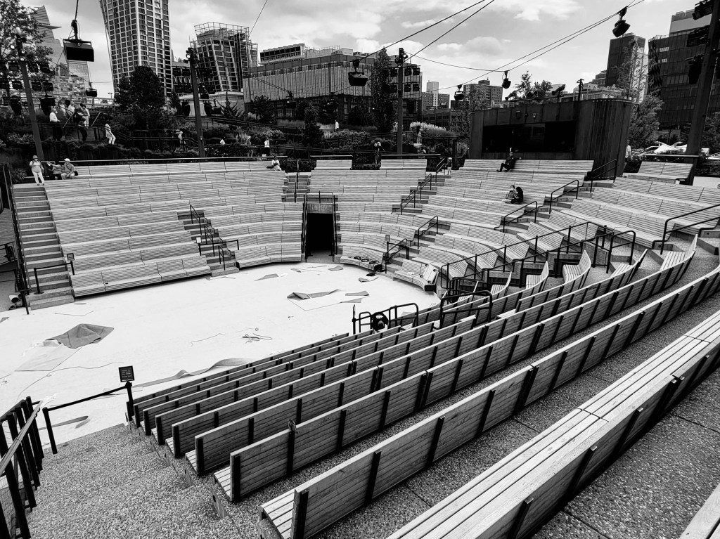 With bagels for fuel, we made our way to our second (and final) stop for the day, Little Island, which is an artificial island park. It’s very new, having just opened in late May 2021, so we thought it would be fun to check it out. You don’t often get to visit a floating park, right?? Apparently, it was planned as far back as 2014, but delays and lawsuits slowed the process down, which is why it didn’t finally open until this year. At one point, those lawsuits and other issues even got the project canceled entirely, but after 43 days, the issues were worked out and the project moved ahead, with famous designer Diane von Fürstenberg and her husband, Barry Diller, providing a lot of the funding (they gave $260 million!!). With lots of green space and a couple of small-ish amphitheaters as well, it seems like it will be a neat space for the city. It sounds like there are already a lot of performances and events planned (presumably there were some over the summer, since an outdoor space like this is perfect for socially-distanced, pandemic-friendly gatherings), so hopefully New Yorkers and tourists alike will enjoy it. It’s free to visit and, as long as you go before noon on weekdays or on non-holiday weekends, no ticket is needed. On holidays and weekends, no tickets are needed from 6a-12p, but a free ticket is required for entry after that to better monitor the number of visitors. If you get a chance to visit or attend a performance there, do it!