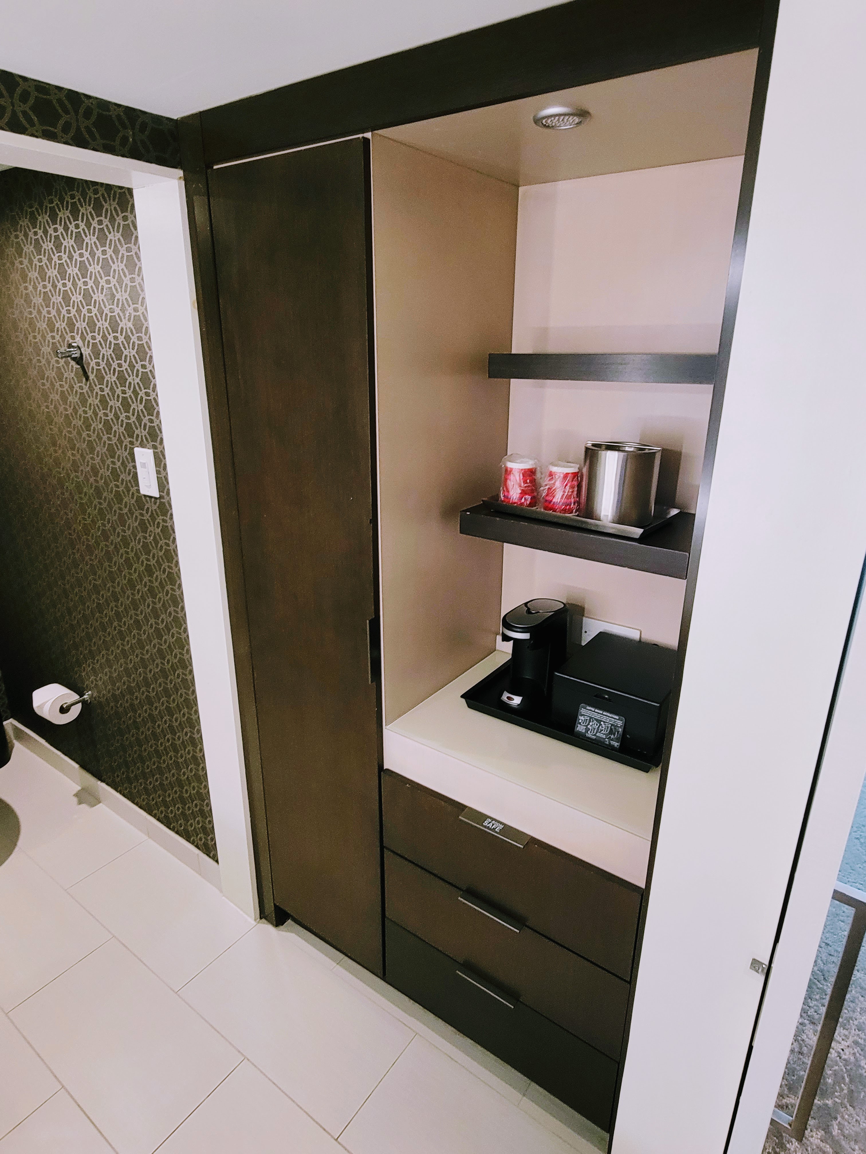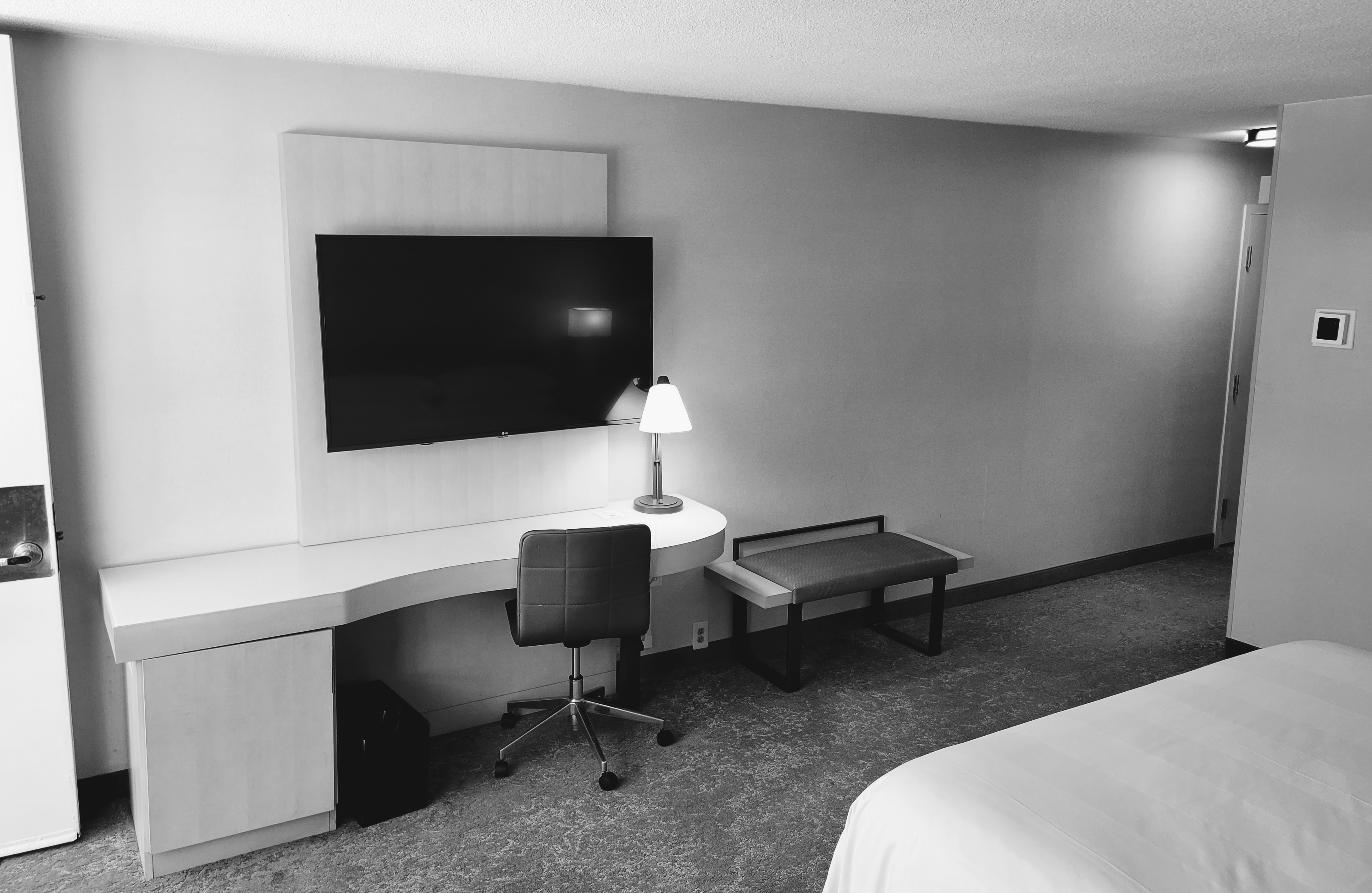 Because it was only around 11 AM when the shuttle reached the hotel, I knew my room might not be ready, especially as I always make arrangements to have adjoining rooms with friends, so I often need to wait for my specific room to be ready (plus, 11 AM is several hours before the official check-in time anyway). This year, we had a run of three rooms, with me in one and my friends Bill and Felicity in their own rooms. Felicity had arrived on Tuesday and was out enjoying a spa day, but she had the foresight to add me to her room so I could get a key and stash my stuff there if my room wasn’t ready yet. Unsurprisingly, it wasn’t, but the hotel was super nice and said they would get it ready right away as it wasn’t occupied anyway. So I only had to kill about a half-hour in Felicity’s room before I got a call from the front desk that my room was ready. Perfect! I grabbed a key and moved my stuff allllll the way from her room to mine (you know, through the connecting door) and, before I knew it, I was all settled in for the long weekend.