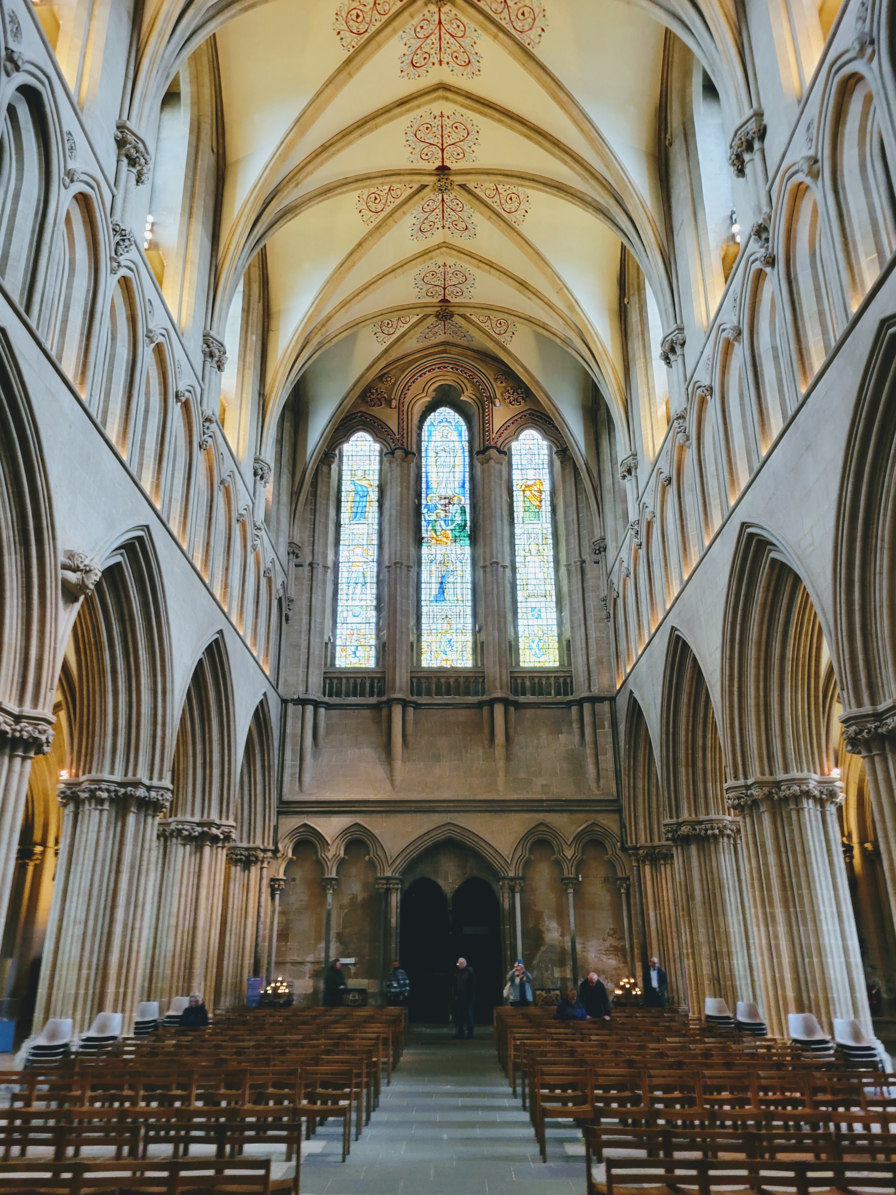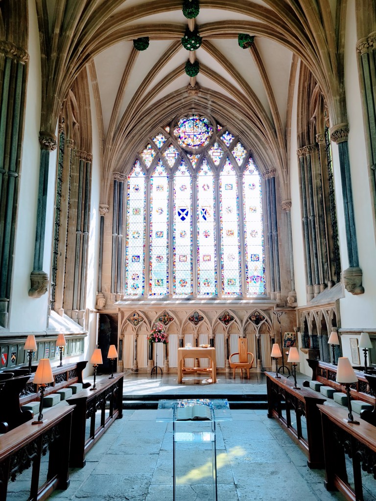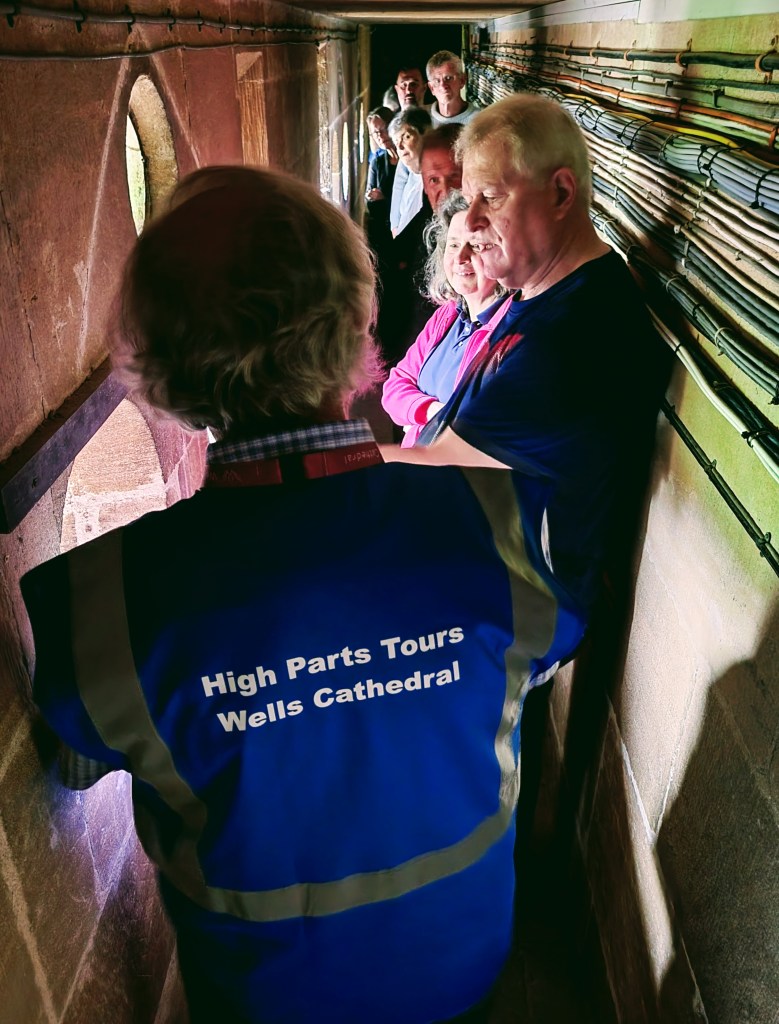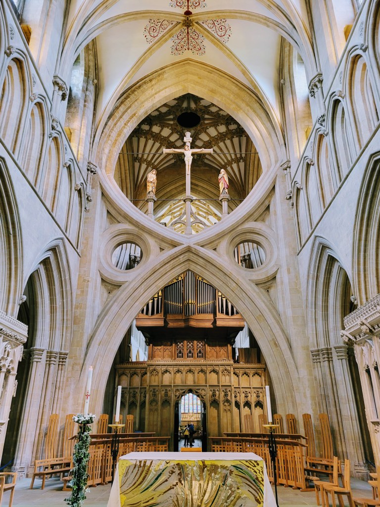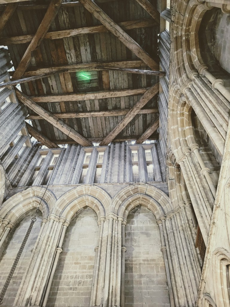 I didn’t actually have much time to look around the exterior though as I had to get inside for my tour! This wasn’t just any ol’ tour though – it was the High Parts Tour which, I can say now, is a really unique way to explore any building, but especially one as old and storied as this cathedral. Rather than a standard tour around the building, the High Parts tour focuses on the hidden, behind-the-scenes stuff. We got to go behind the Wells clock to see its workings, we got to stand behind the holes where the choir would have sung on Easter Sunday to welcome the dean and the congregation, we got to walk on top of the nave (not outside the building, but in the space between the top of the nave and the roof), and more. Such a cool experience! It’s one that does require a fair amount of stair climbing (up and down) at times though and some of the spaces are a bit tight, so keep that in mind if you’re considering this tour. If you do it though, you’ll definitely experience 90 minutes of interesting, well-presented information! And at £15/$18 USD, you won’t have to pay a lot for it! I think this tour is fairly popular though, so definitely book early to avoid disappointment. I booked mine probably six weeks before my trip and even at that point, I think there were only 3-4 spots left (there were ten or so people on my tour, which I assume is the maximum).