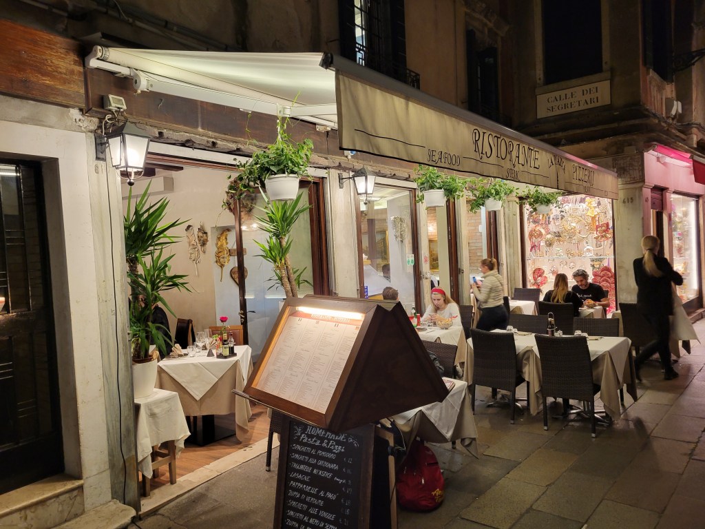 Since it was already evening by the time we got our stuff unpacked, we just chilled in the hotel for a bit before making our way to La Piazza for our dinner reservation. We could walk there in about ten minutes, so we got to experience Venice at night (Halloween night, to be precise!) and more crowds of people. There were definitely some people in costumes, mostly kids (to be expected) and it seemed like some trick-or-treating was happening, mostly with local shops. We sat outside for dinner and it definitely looked like some kiddos were stopping by businesses to get treats. While it doesn’t seem like Halloween is the BIG thing it is back in the US, it was interesting to see how the Italians handle it.