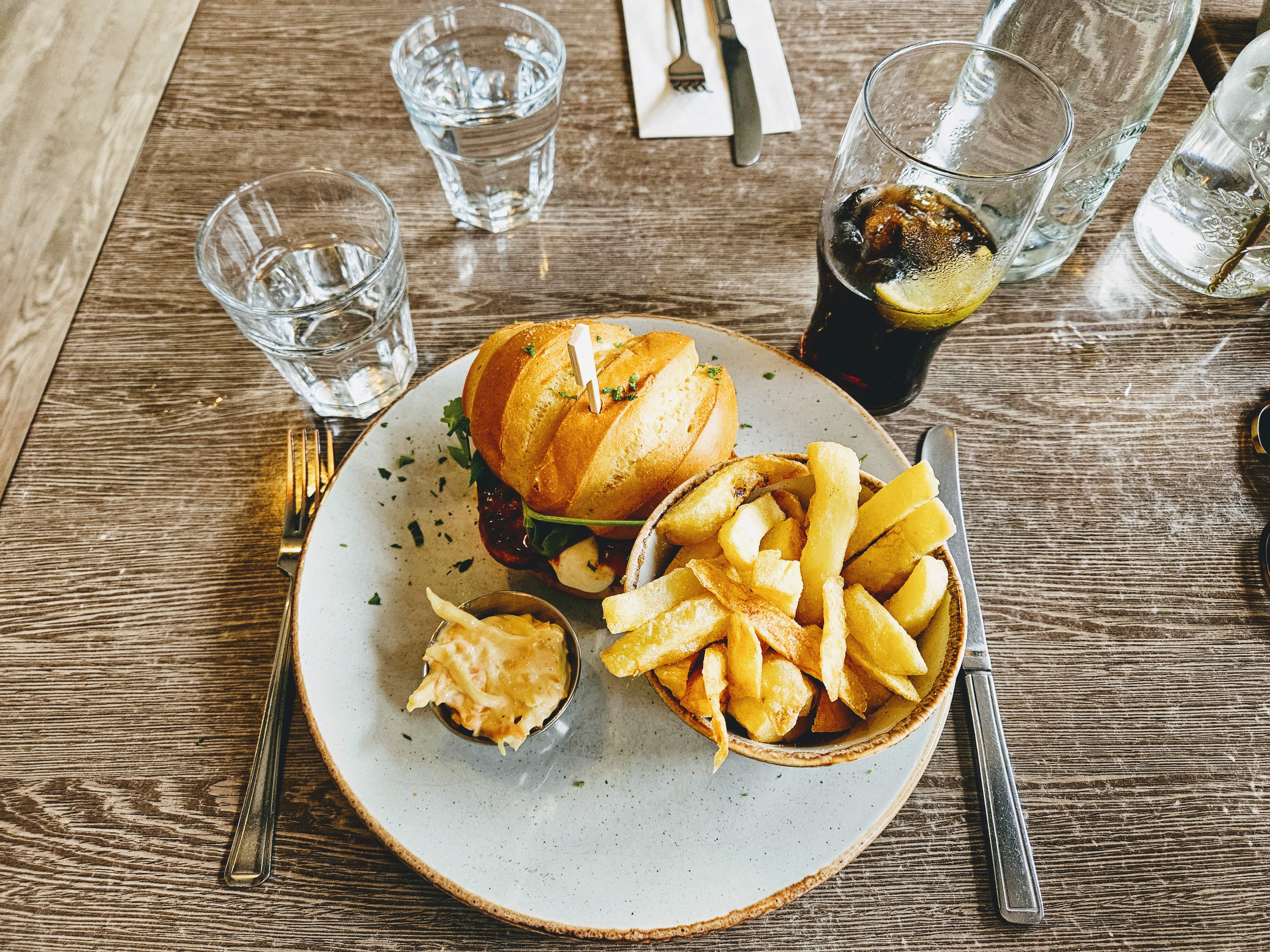 With the castle explored and our one hour of free parking expiring, it was time to move on. You know what’s really fun to do after exploration castle ruins? Eating a good meal, of course! At first, we were going to try and park elsewhere so we could walk around The Mumbles a bit, but the next parking lot we visited didn’t have any open spots, so we decided to skip straight to food. 🙂 Matt happened to spot an interesting-looking place on our way to the castle, so we headed back there to see if they were open and if they might have a table for us (having already been turned away from a London restaurant on Thursday, we weren’t sure if Saturday lunch would prove easier) and thankfully they did. Our friend Christopher joined us a little while after we arrived for what turned out to be a REALLY tasty meal. He and Felicity both had a Welsh chicken dish, while Matt had chili (with rice, as chili is always served here), and I had a super delicious Cajun chicken and chorizo burger. Thank you to the West Cross Inn for such good eating!