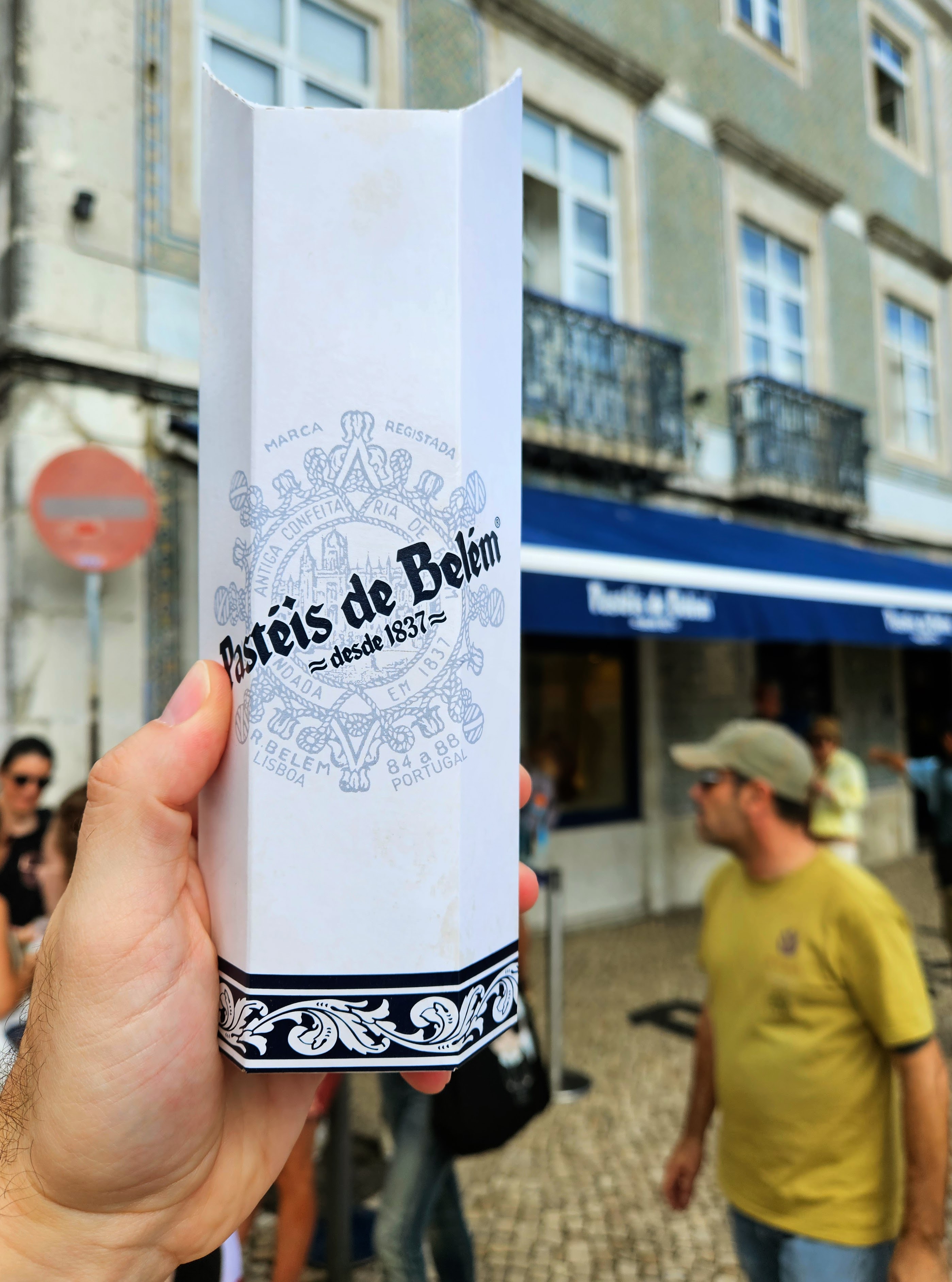 So what’s special about BelĆ©m? It’s a bit of a museum district and happens to be home to some cool things to see. Is that what we started with though? Erm, no – we opted to make our first stop at PastĆ©is de BelĆ©m, which is the original home of the famous egg tarts that are so ubiquitous around Portugal (well, certainly around Lisbon, as we see signs for them everywhere). You may read “egg” and think that it’s a savory treat, but in this case, it refers to egg custard, so these lil’ tarts are actually sweet treats. You can eat them as they come, but it’s also normal to sprinkle them with powdered sugar and cinnamon, both of which I find pretty tasty. Because this restaurant (well, more of a bakery, I suppose) is famous for having the original recipe for these goodies, it’s always busy, but they have a good system in place to deal with that. Namely, they have two different entrances – one for takeaway service, which just allows you to buy the tarts, and another for table service, where you can come in, order more of what they offer, and sit down and eat it. It looked like table service could take awhile, so we opted for takeaway. Although there were ~20 people ahead of us, the line moved very quickly (easy to do when the only choice you have to make is how many of the one available item you want), so we soon had our treats in-hand. We were going to get two (one each) and then thought we might get four (two each), but then saw they had a convenient six-pack (three each?!), so we opted for that. And then we quickly realized we’d like to have a place to sit and eat them! Thankfully, there’s a Starbucks next door, so we decided to squat there. To be fair, I did go in and buy a bevvie, even though I don’t like coffee (neither does Scott), but I can always find a non-coffee drink at a coffee shop.