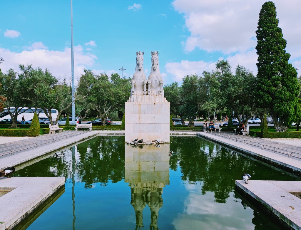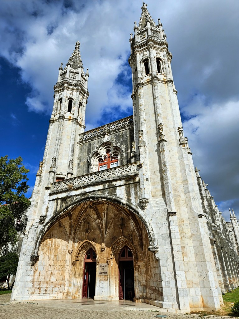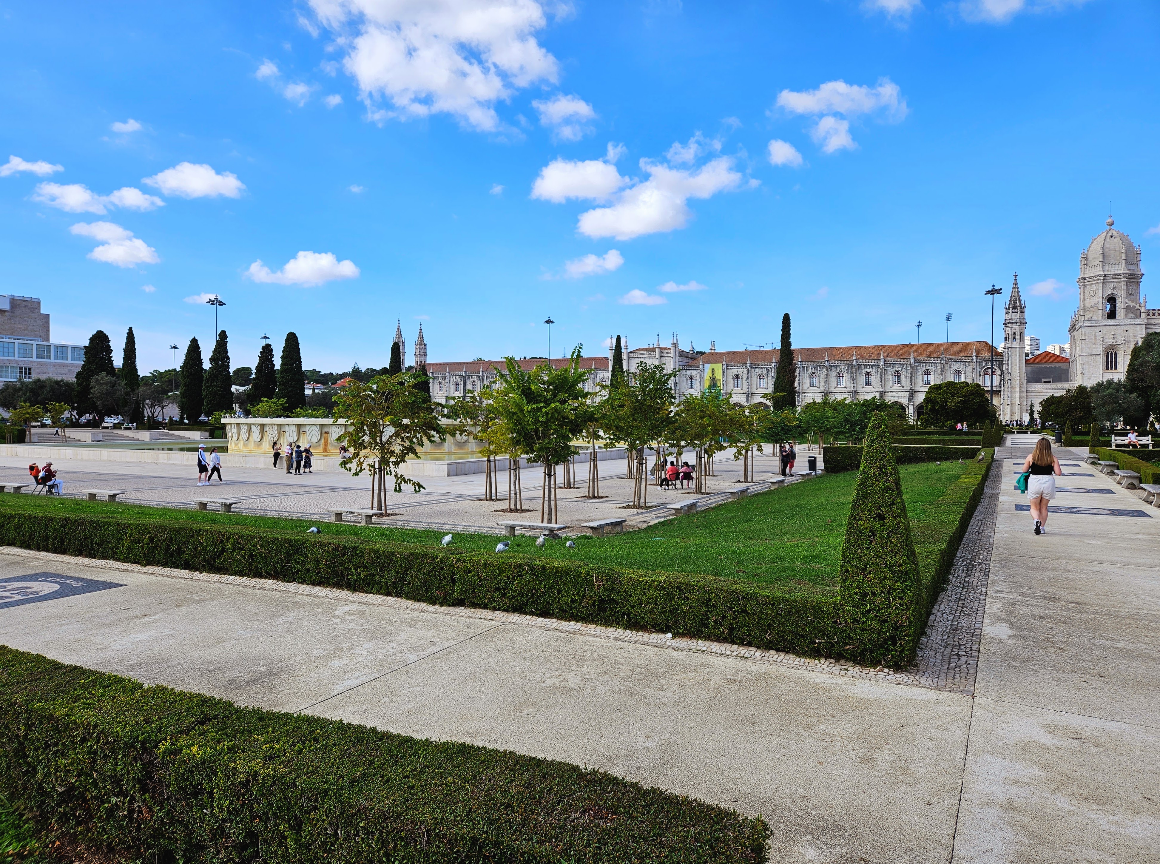 With treats consumed, we moved on down the line (literally) to just a little further down the street, where we saw the Jerónimos Monastery. It’s actually not actually a monastery anymore, as it was secularized in the early 1800s, but it’s still a really imposing building, not to mention quite old, as it was built in the 1500s. Every time I see buildings like this, I stop and think how ridiculous it is that people hundreds of years ago were even able to design and construct them! Although we’re usually down to visit churches (or in this case, church-adjacent, since it’s no longer a monastery), we opted not to go inside this one as the mood wasn’t hitting us. We still got a sense for how impressive it is from the outside, as you can see below. Also below are a couple of photos from the PraƧa do ImpĆ©rio (Empire Square), a square and park across the street from the monastery that we wandered through as we continued down the street. And yes, I mean that literally – all these famous sites are on the same street!