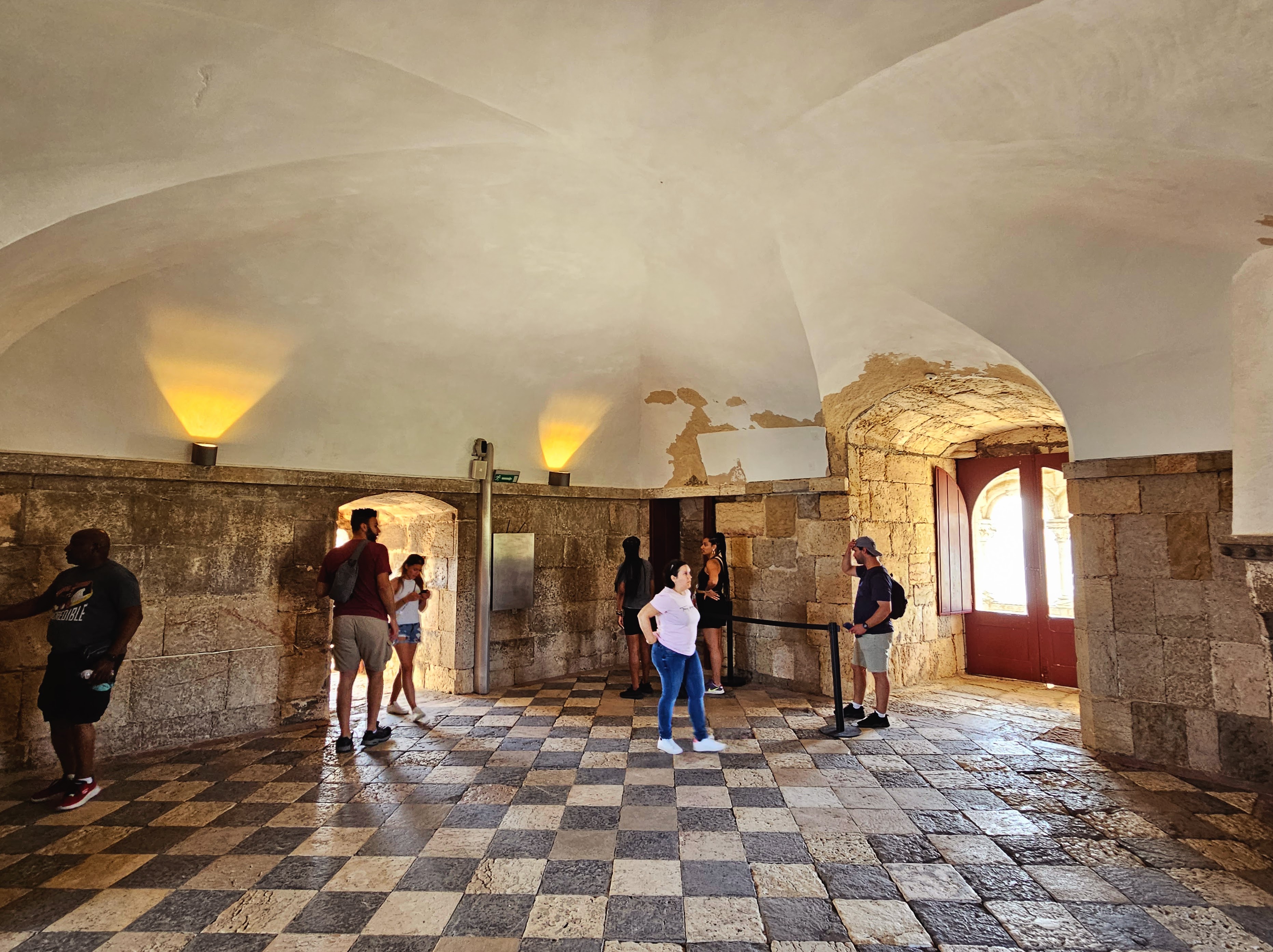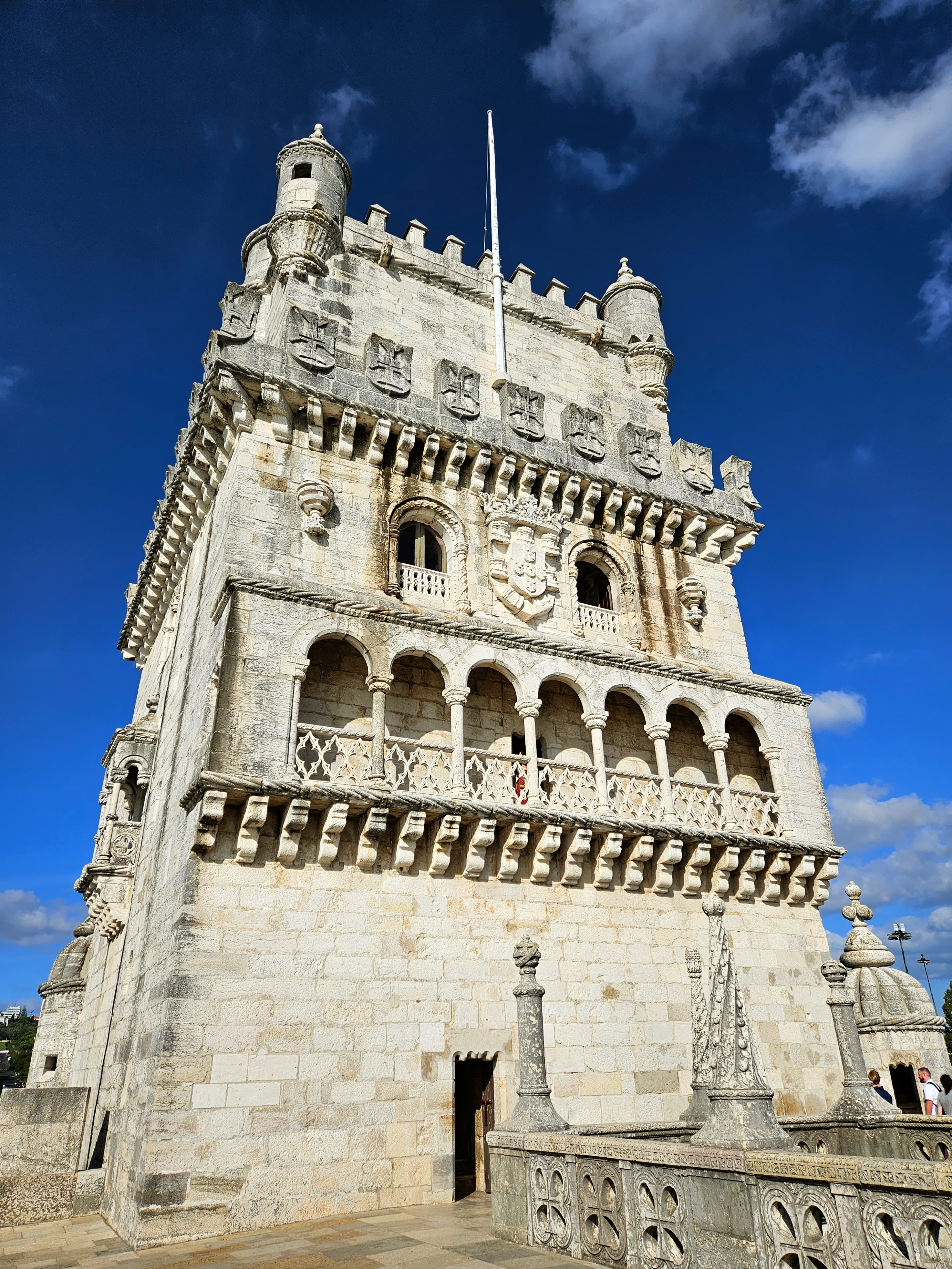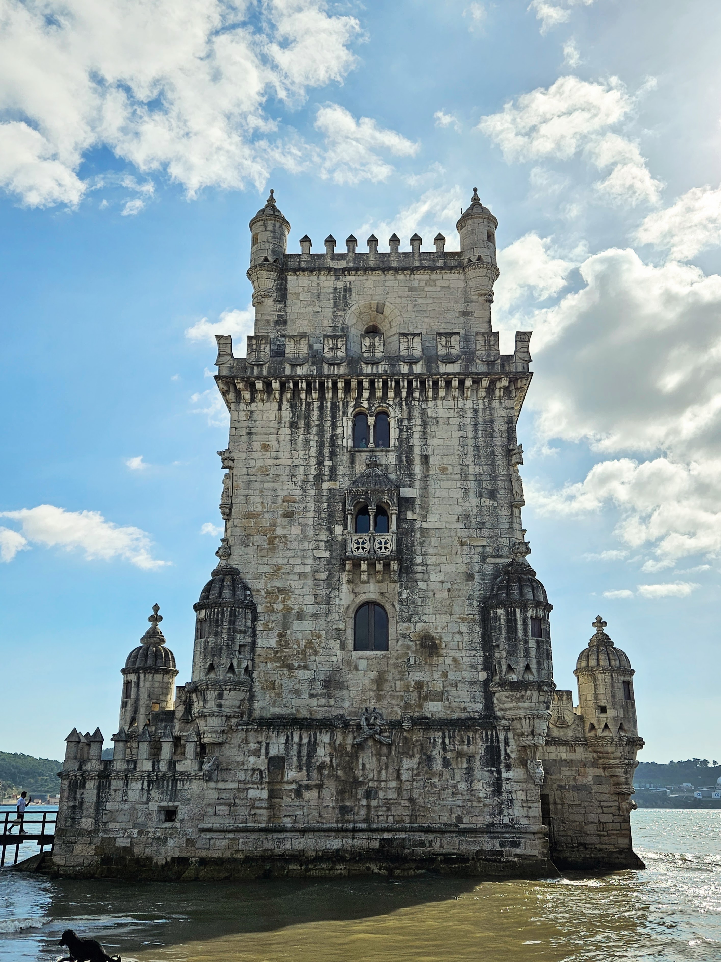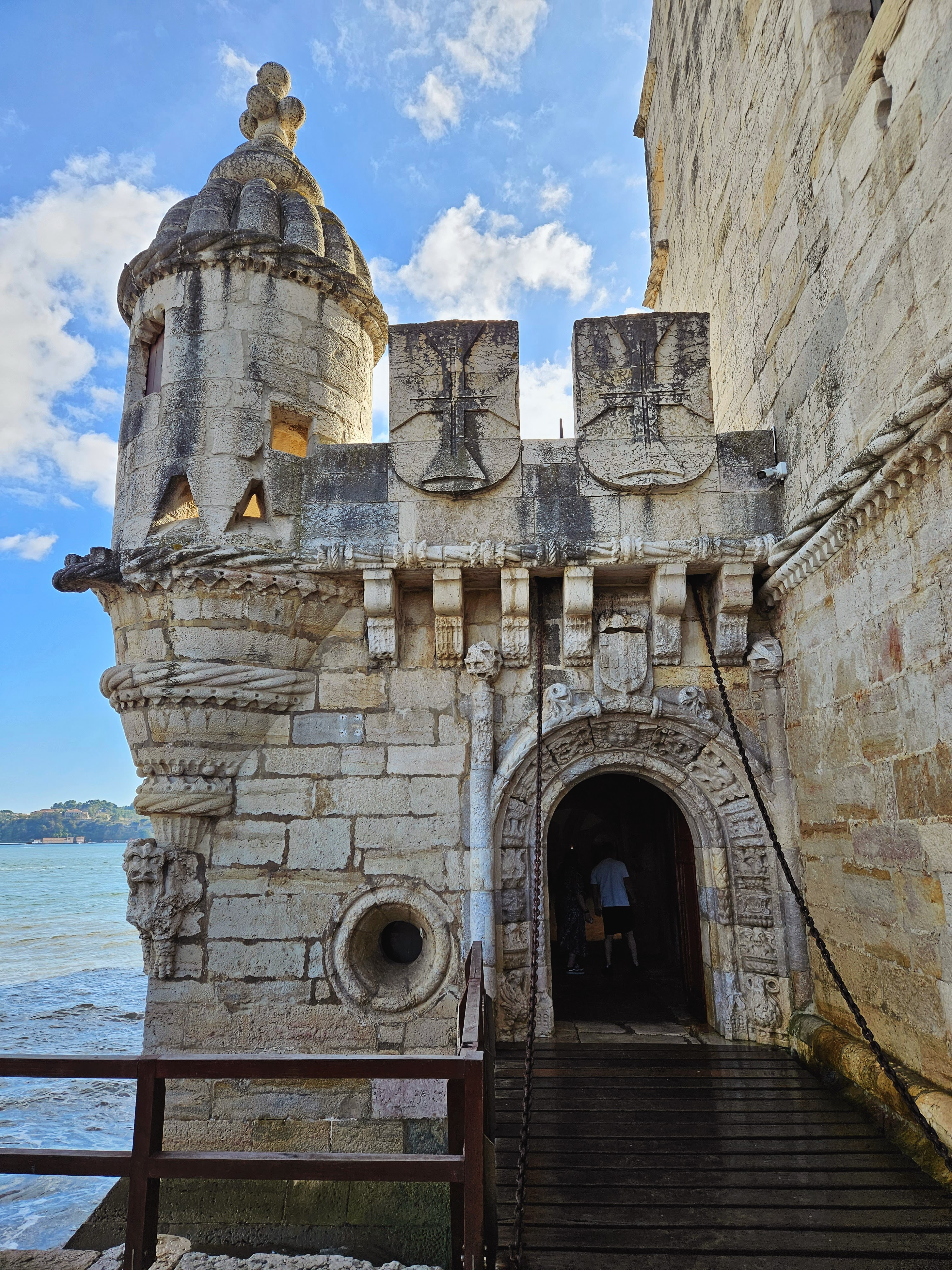 Okay, I promise we’re going to actually walk through the next cool monument we find! Well, to be fair, we walked by one that we DIDN’T go in (see below), but then we walked to the Torre de BelĆ©m (BelĆ©m Tower), which is a cool, tall, imposing structure. It was built in the 1500s and served as a point of embarkation and de-embarkation for explorers and also functioned as a “ceremonial gateway” to Lisbon. In my mind, those are a lot of words to say that it was a mostly decorative structure. š We had a bit of an odd experience with this one because, although we had decided that we wanted to go inside it, we hadn’t yet purchased tickets, thinking we’d just get them there. You can see the line of people in one of the photos below, but at the front of that line was a notice saying tickets were sold out. That was a bummer, since we’d skipped the monastery thinking we’d still get to walk through this cool building, but I looked online and saw that I was able to buy same-day tickets (they aren’t timed to a specific slot, just general admission for that date), so I went ahead and booked them and then we got in the line. It wasn’t the fastest-moving line, though it chugged forward steadily at first, but then seemed to stop. According to the ticket-taker, only 60 people are allowed inside at once, but we must have seen 20 people come out (they exit where we had to enter, so you couldn’t miss them) and no one was being let in. Maybe they only let people in in batches or something, but either way, we finally got in after ~20 minutes in line. It was a bit warm out, but other than that, the wait was pleasant enough. At least it wasn’t raining!