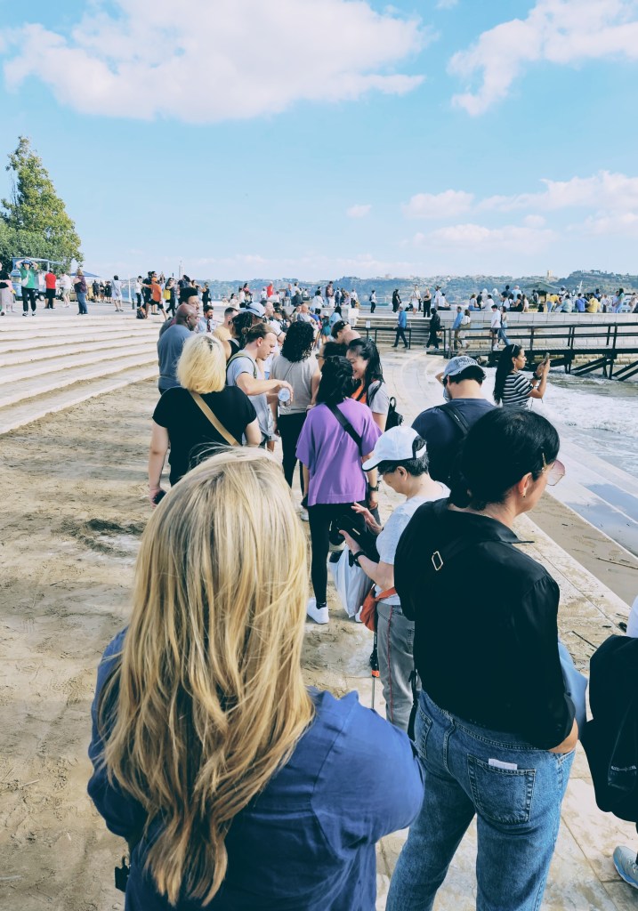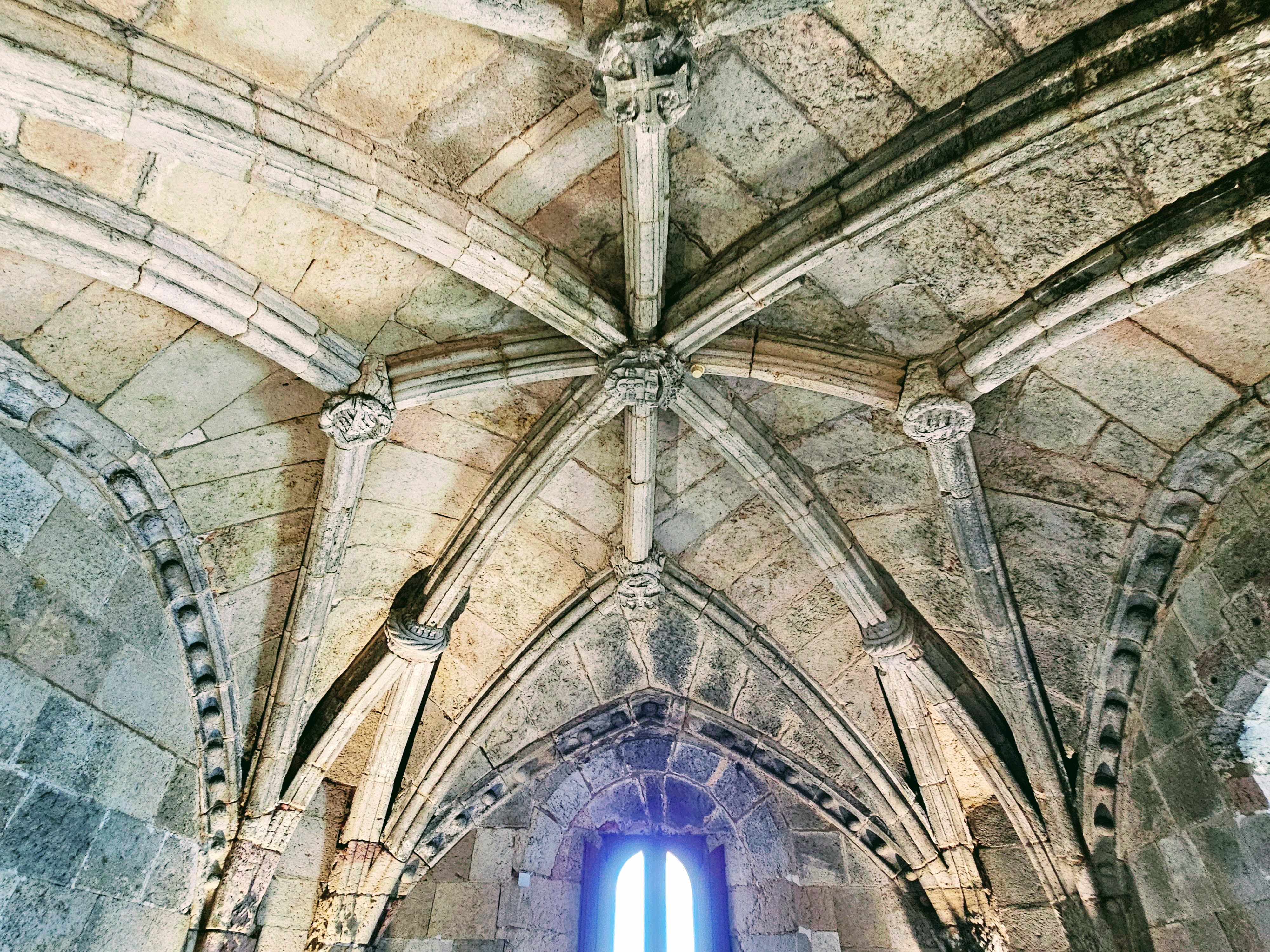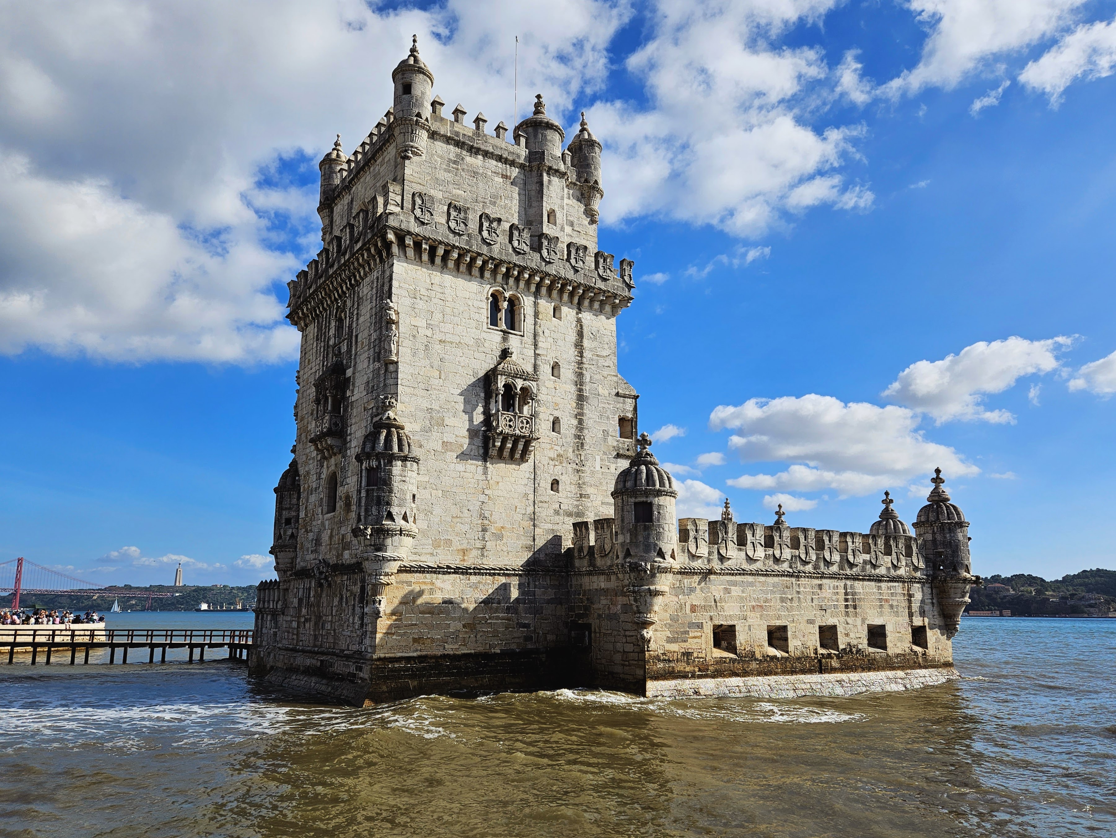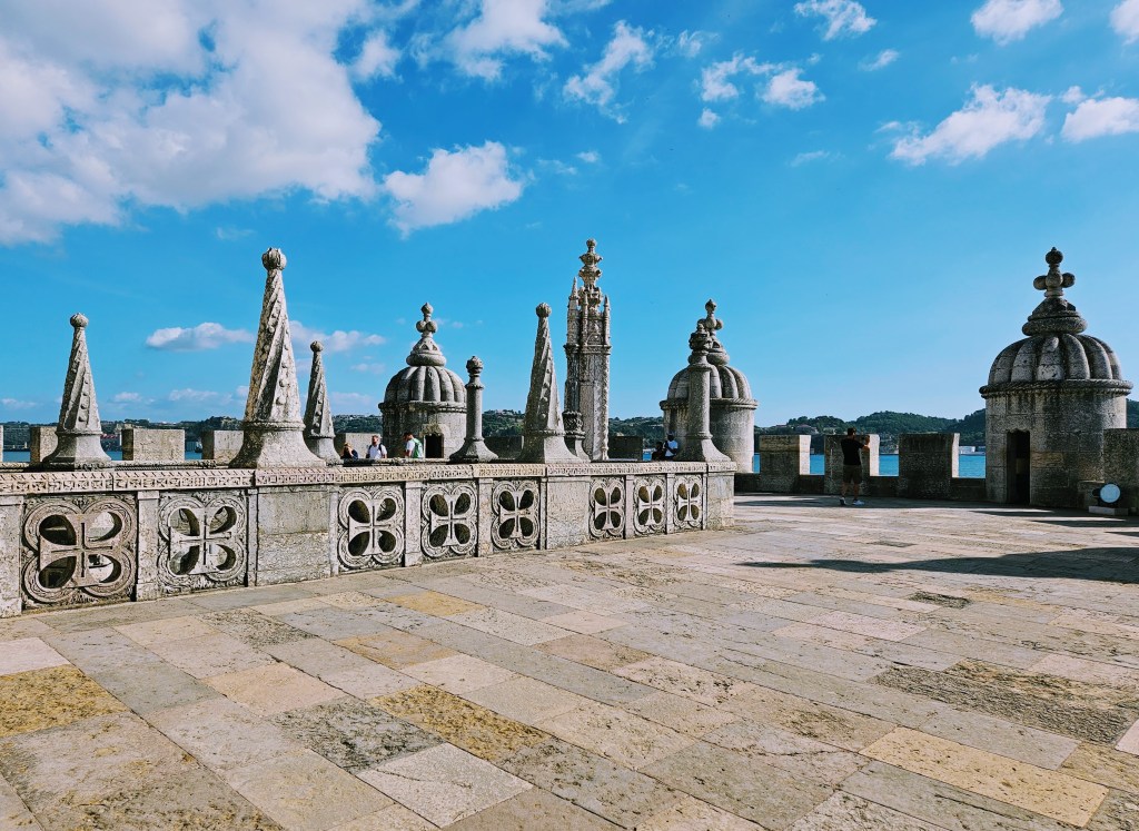 Okay, I promise we’re going to actually walk through the next cool monument we find! Well, to be fair, we walked by one that we DIDN’T go in (see below), but then we walked to the Torre de BelĆ©m (BelĆ©m Tower), which is a cool, tall, imposing structure. It was built in the 1500s and served as a point of embarkation and de-embarkation for explorers and also functioned as a “ceremonial gateway” to Lisbon. In my mind, those are a lot of words to say that it was a mostly decorative structure. š We had a bit of an odd experience with this one because, although we had decided that we wanted to go inside it, we hadn’t yet purchased tickets, thinking we’d just get them there. You can see the line of people in one of the photos below, but at the front of that line was a notice saying tickets were sold out. That was a bummer, since we’d skipped the monastery thinking we’d still get to walk through this cool building, but I looked online and saw that I was able to buy same-day tickets (they aren’t timed to a specific slot, just general admission for that date), so I went ahead and booked them and then we got in the line. It wasn’t the fastest-moving line, though it chugged forward steadily at first, but then seemed to stop. According to the ticket-taker, only 60 people are allowed inside at once, but we must have seen 20 people come out (they exit where we had to enter, so you couldn’t miss them) and no one was being let in. Maybe they only let people in in batches or something, but either way, we finally got in after ~20 minutes in line. It was a bit warm out, but other than that, the wait was pleasant enough. At least it wasn’t raining!