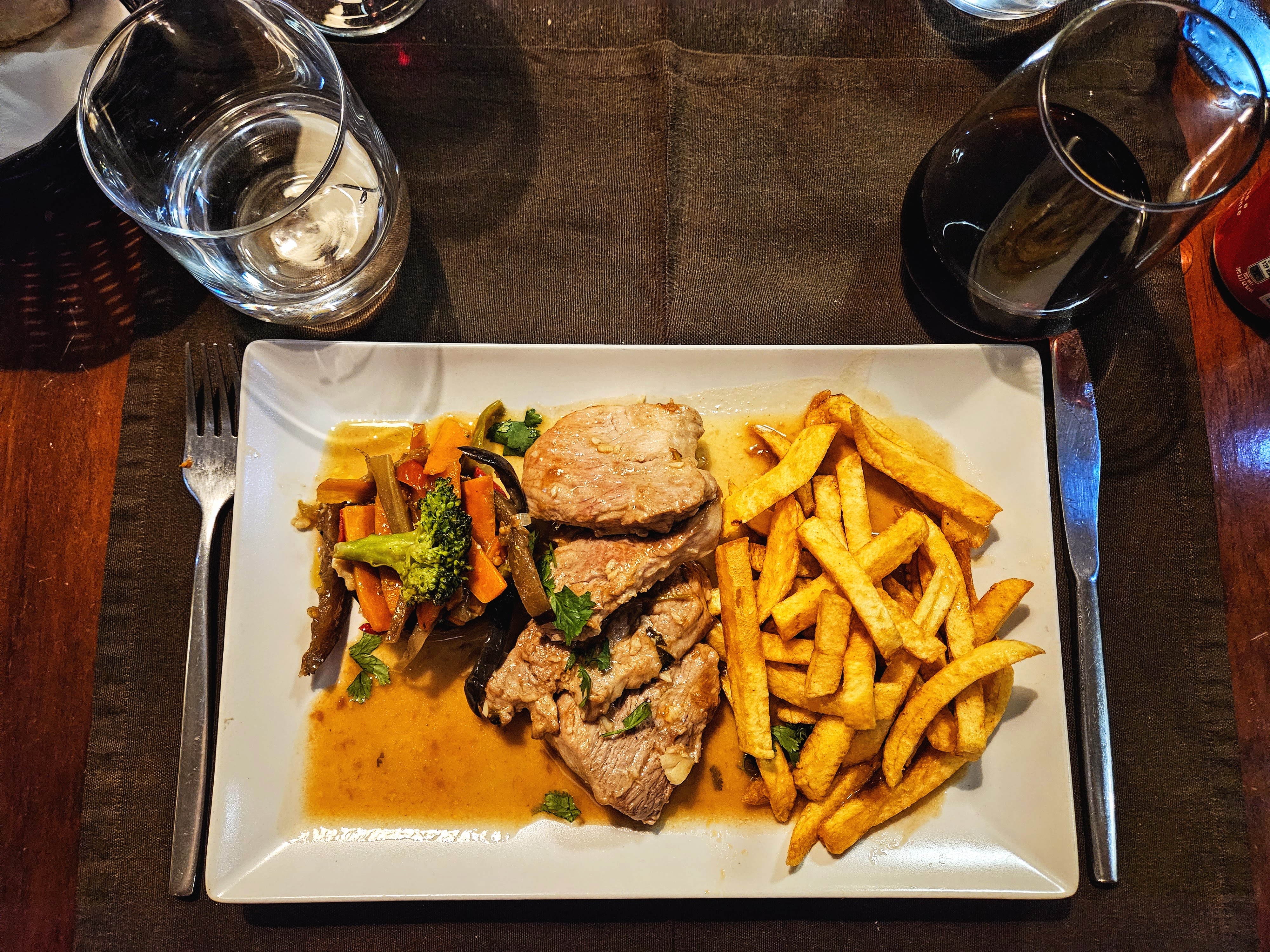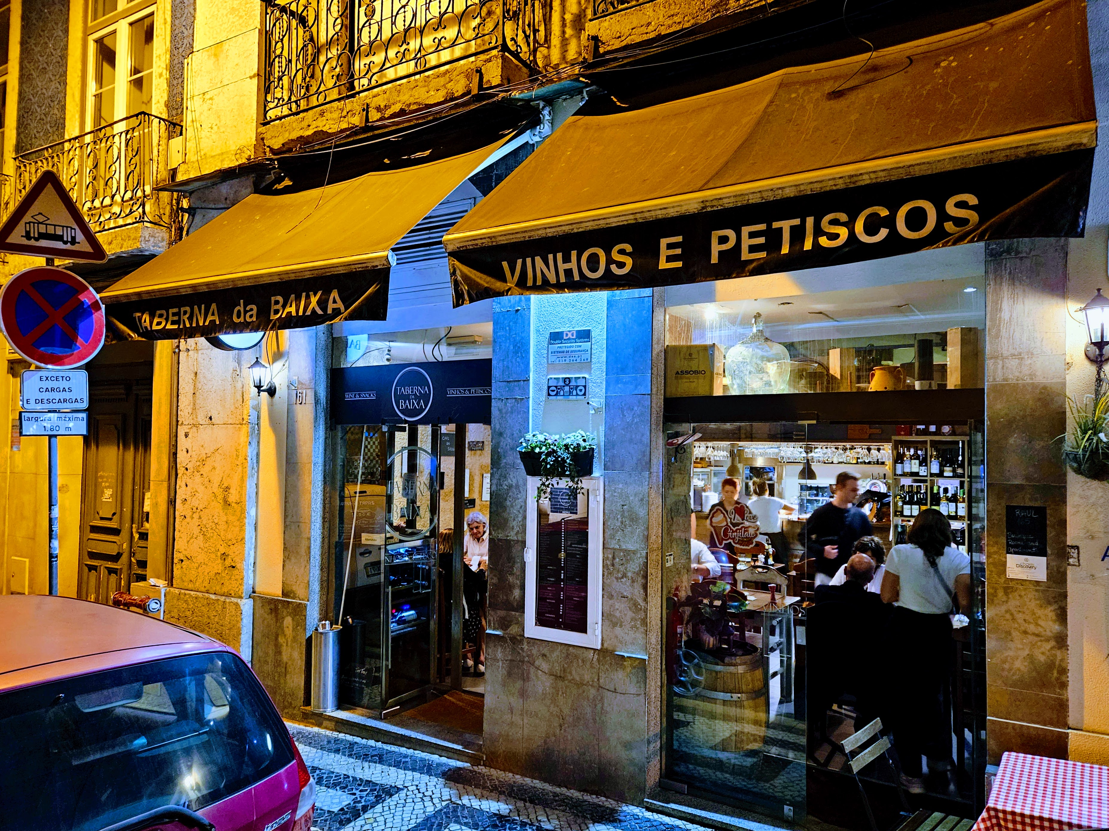 The rest of our evening was enjoyable and low-key. We chilled at the hotel for a bit and then decided we wanted to have some Portuguese food for dinner, so we asked the folks at the front desk where they would go for that. They recommended Taberna de Baixa, which is a short walk from our hotel, so we made our way there and had a nice meal. Although it was late for us to be having dinner (nearly 8 PM), we knew it was kind of early for Portuguese folks to be eating, so weren’t surprised to see the restaurant only half-full when we arrived. Happily though, it filled up nicely by the time we left, so it seems like it is a popular place for more than just tourists. We enjoyed our meal, too, which consisted of a few tapas to start (chicken, beef, tuna, and chickpea salad) and then a seafood rice dish for Scott and a pork dish for me, along with apple crumble (Scott) and caramel pudding (me) for dessert. Oddly, the server specifically took Scott’s spoon away, giving him a larger serving spoon instead, which made it difficult to eat the rice as it was pretty saucy. It had lots of seafood in it though, so he was able to do just fine with a fork. š
