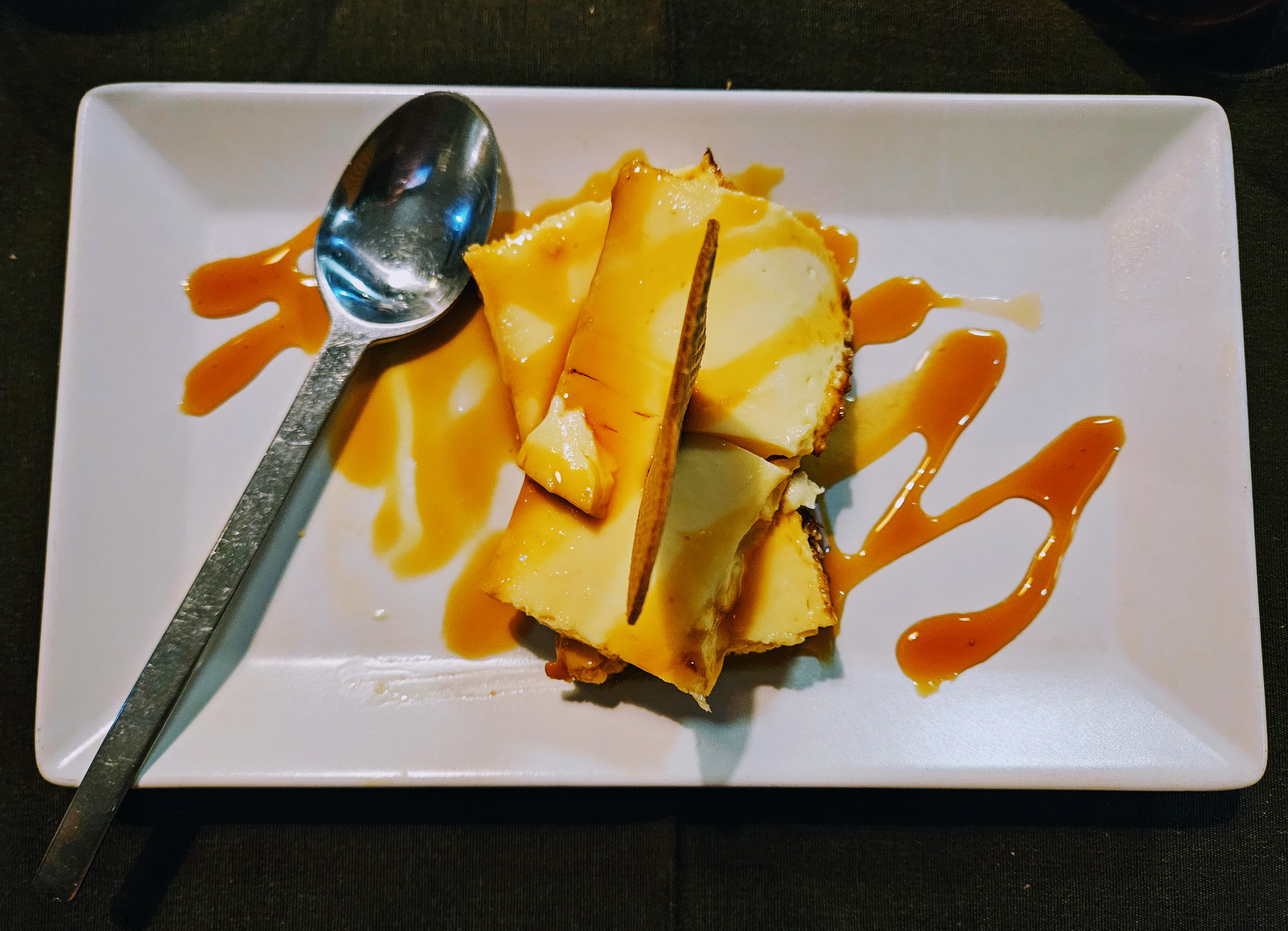 My pork dish was served in a tasty sauce with some really nice veggies. I was surprised to see fries included, but I noticed them on most people’s plates, so they’re quite common. And they’re actually sweet potato fries. On the right, my caramel pudding was like a flan, which I enjoy, though I know that texture isn’t for everyone.