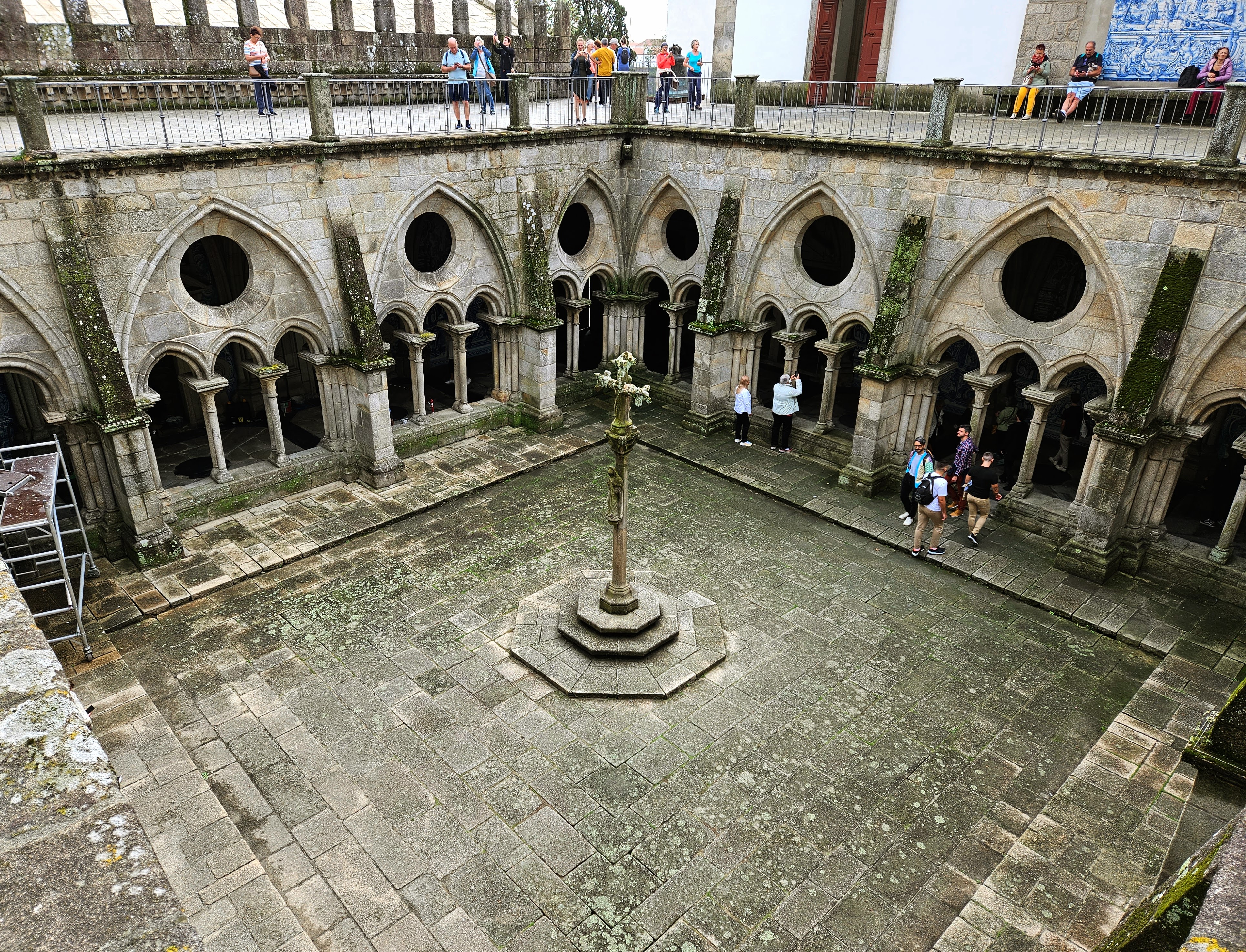 Walking along the path above the cloisters and looking down into them (on the left) and up towards the tower we would soon visit (on the right).
