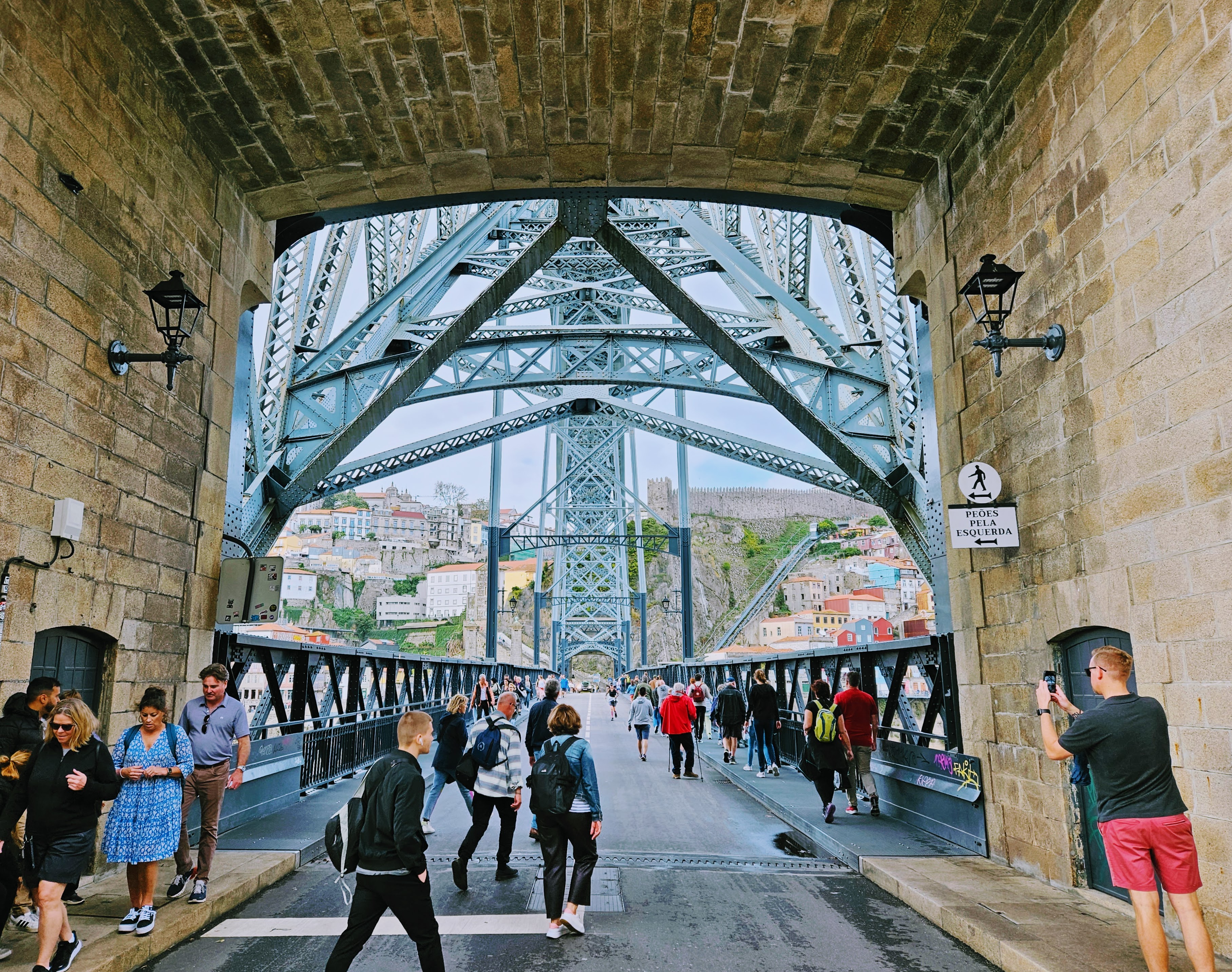 The rest of our day offered us no more churches, but definitely some more outstanding views of the sights around Porto. If you’ll recall, Dom LuΓs I Bridge is very near our hotel, so we saw it every time we went outside. We wanted to see it up close though, so we decided to head back towards the hotel and walk across the bridge, as there are pedestrian paths both across it and below it. The sun really was back in full force (well, at least in part of the sky), which made for a pleasant walk and some very nice photos, as you can see below. It was definitely WINDY though, so don’t underestimate the importance of hanging onto handrails and watching where you’re going so you don’t get blown away! Thankfully, we didn’t. π