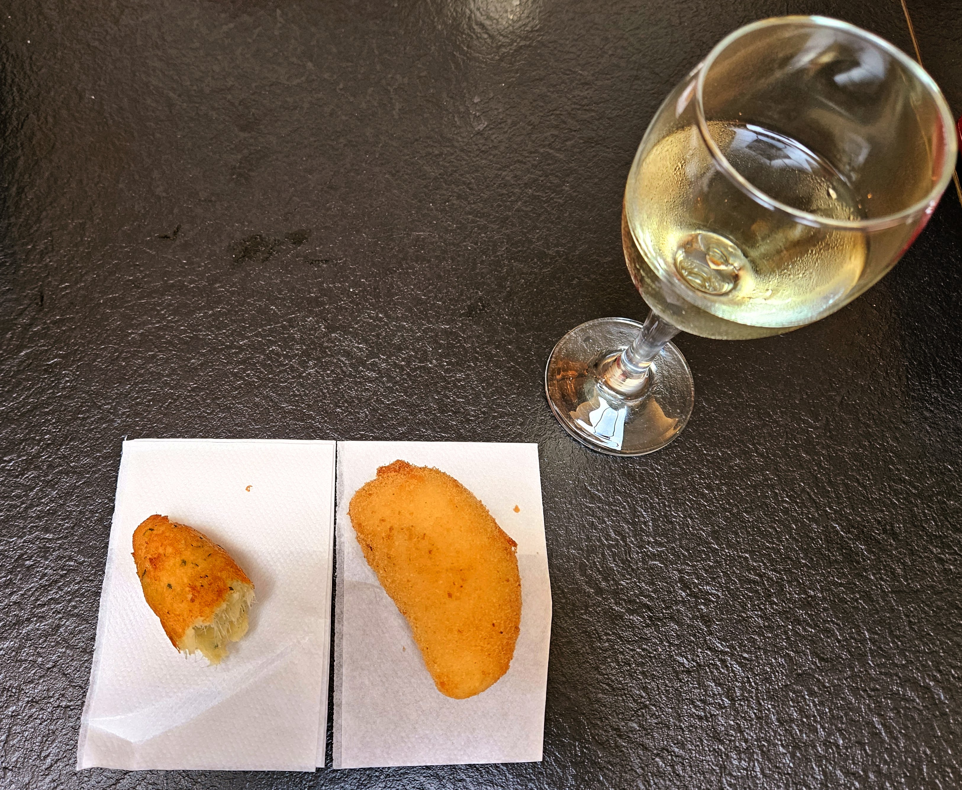 - Bolinhos de bacalhau (codfish cakes) and green wine at Confeitaria Império. Okay, so maybe this food tour was more duplicative of Lisbon’s than I thought because both the food here and the food at the start were also on our tour there. But hey, it was still tasty! And we were having nice conversations with our fellow travelers, too.