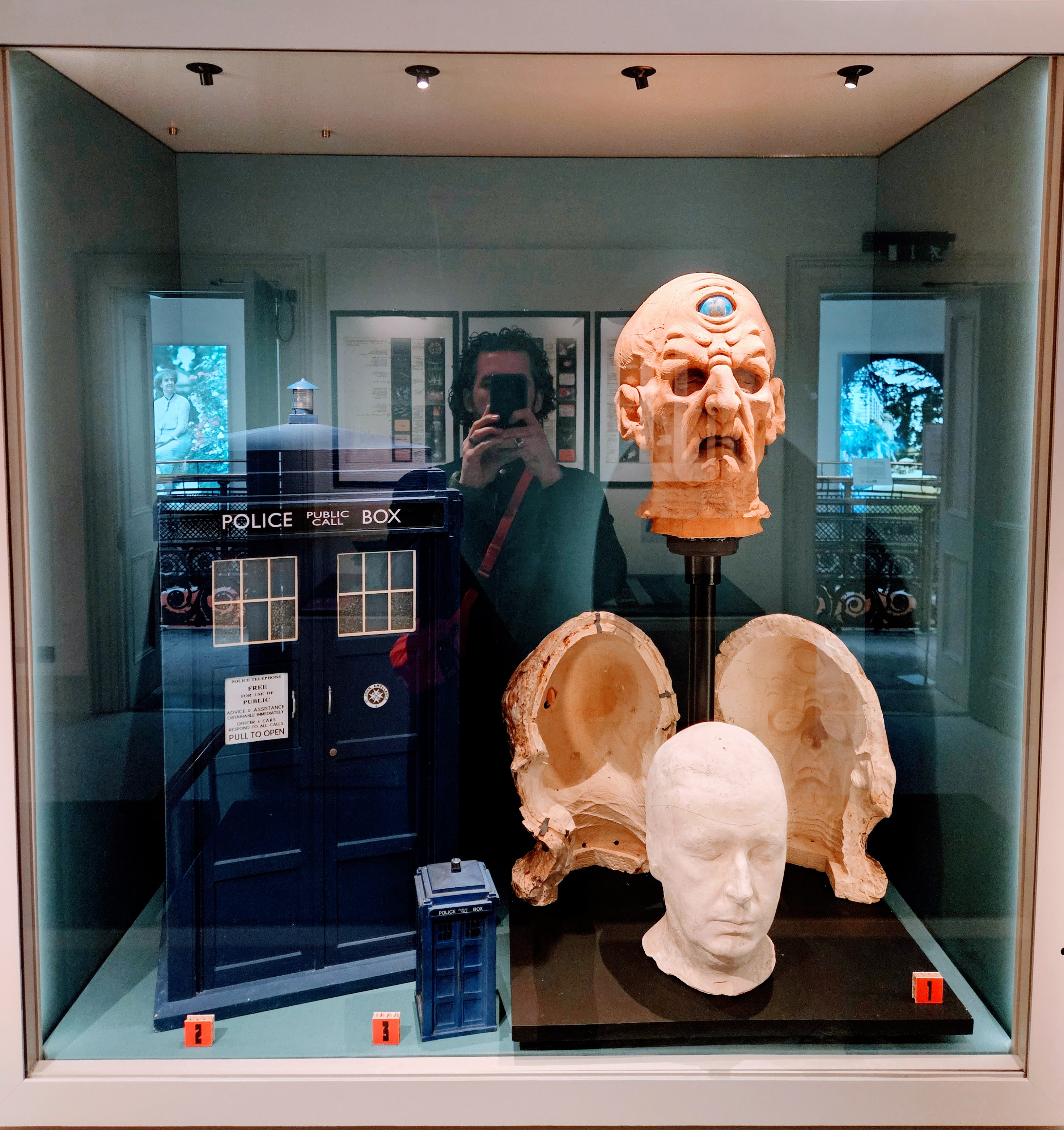 Another case featured screen-used props and visual effects items, including a couple of TARDISes and a mask worn by actor Terry Molloy when he played Davros (creator of the Daleks). This small TARDIS was used in the 1993 Doctor Who charity special Dimensions in Time.