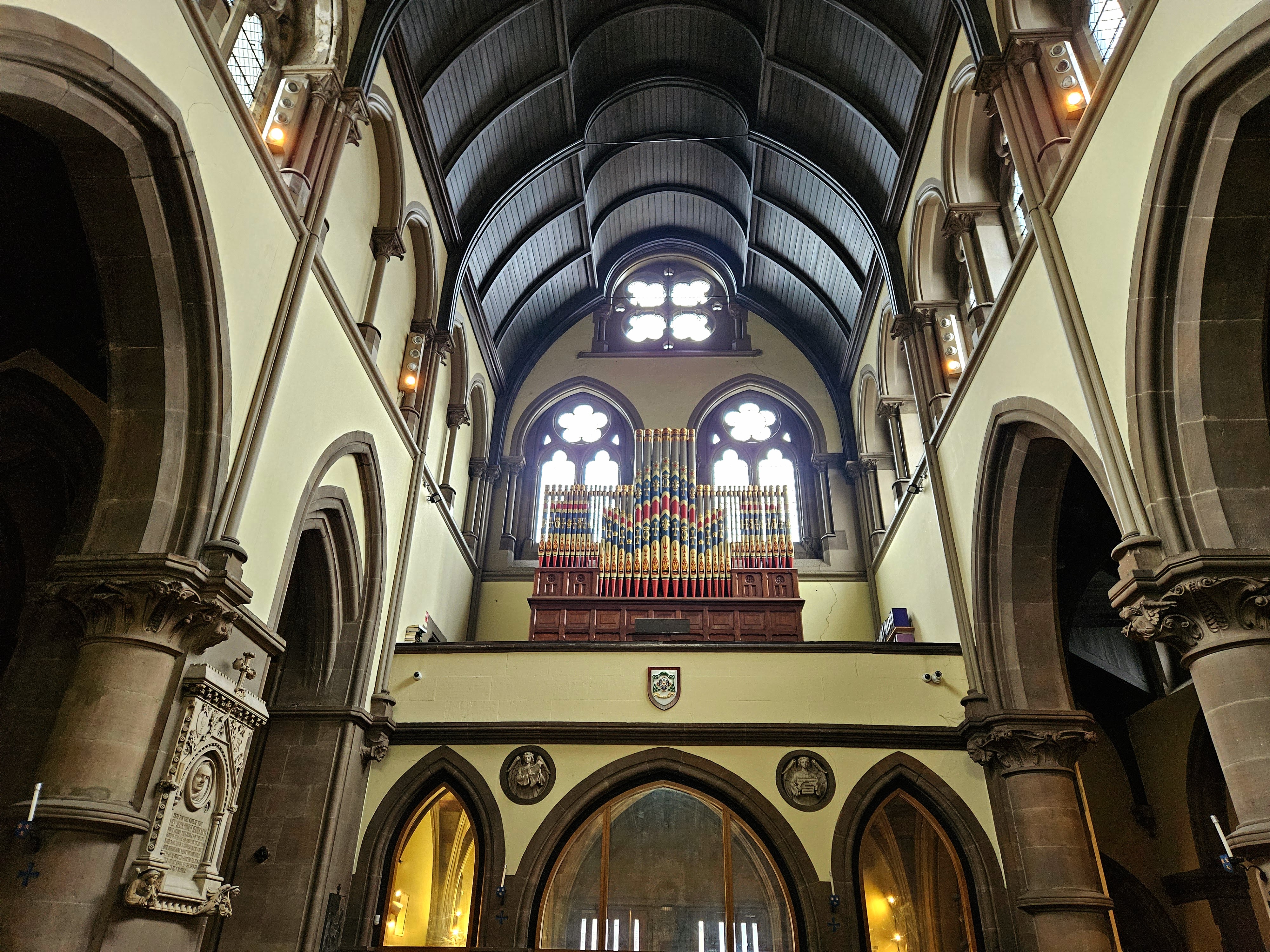 The Shrine of Our Lady of York (left) and a view of the church’s organ (right). The statue of Mary in the shrine was carved in Oberammergau, Germany, which Scott and I visited a decade ago.