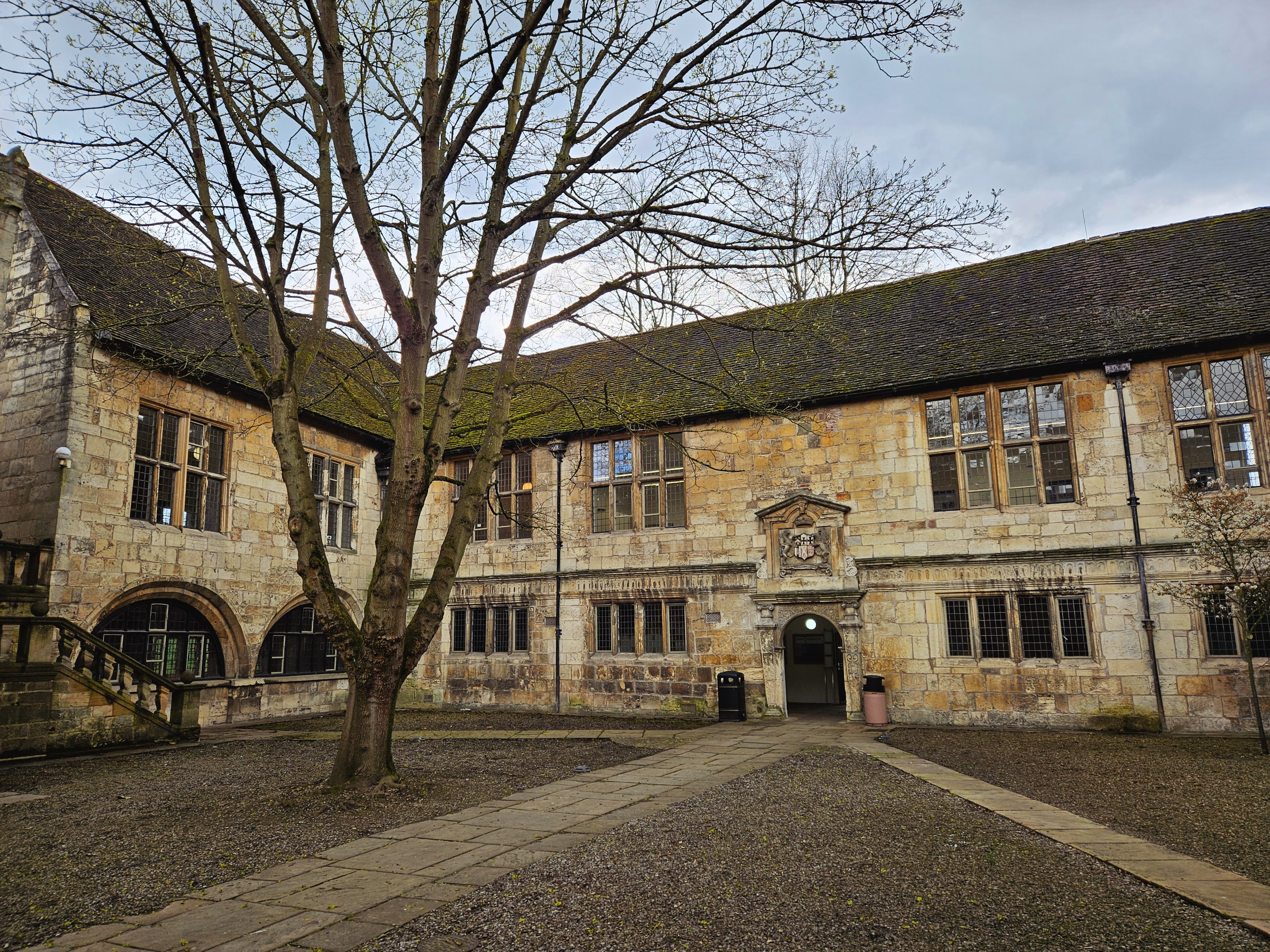 Zooming in on the coat of arms over the entrance to the King’s Manor as well as a courtyard just inside of it.