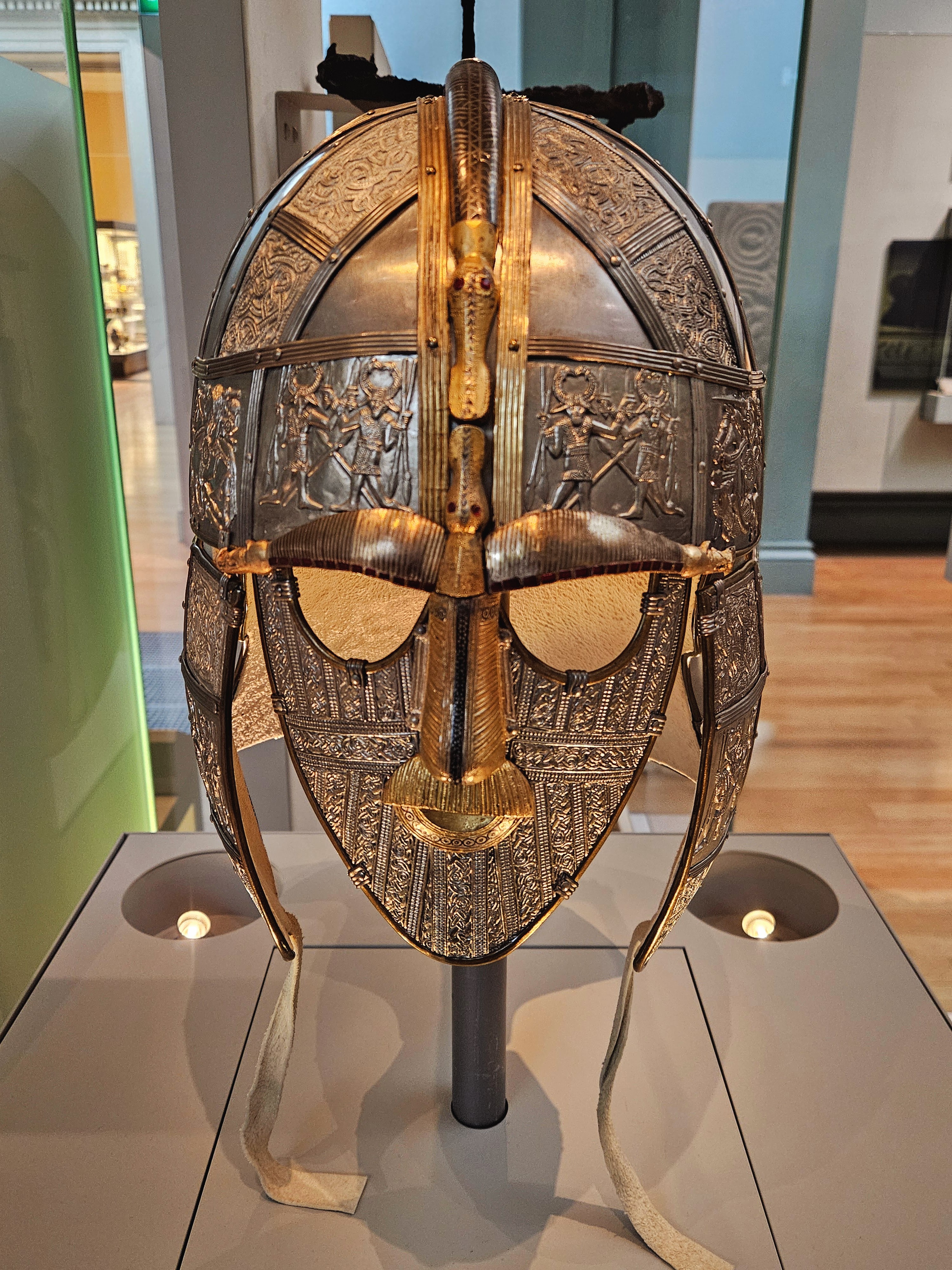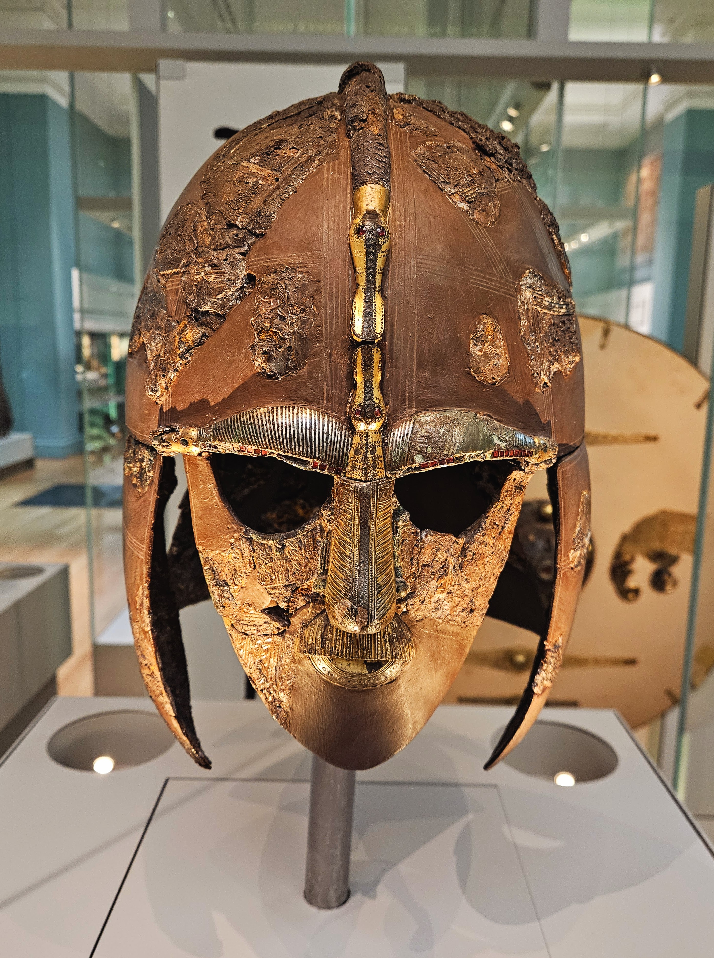 The Sutton Hoo Helmet was found in England in 1939 and dates back to around 620 AD. The picture on the right is of a modern reconstruction that shows what it likely looked like all those centuries ago.