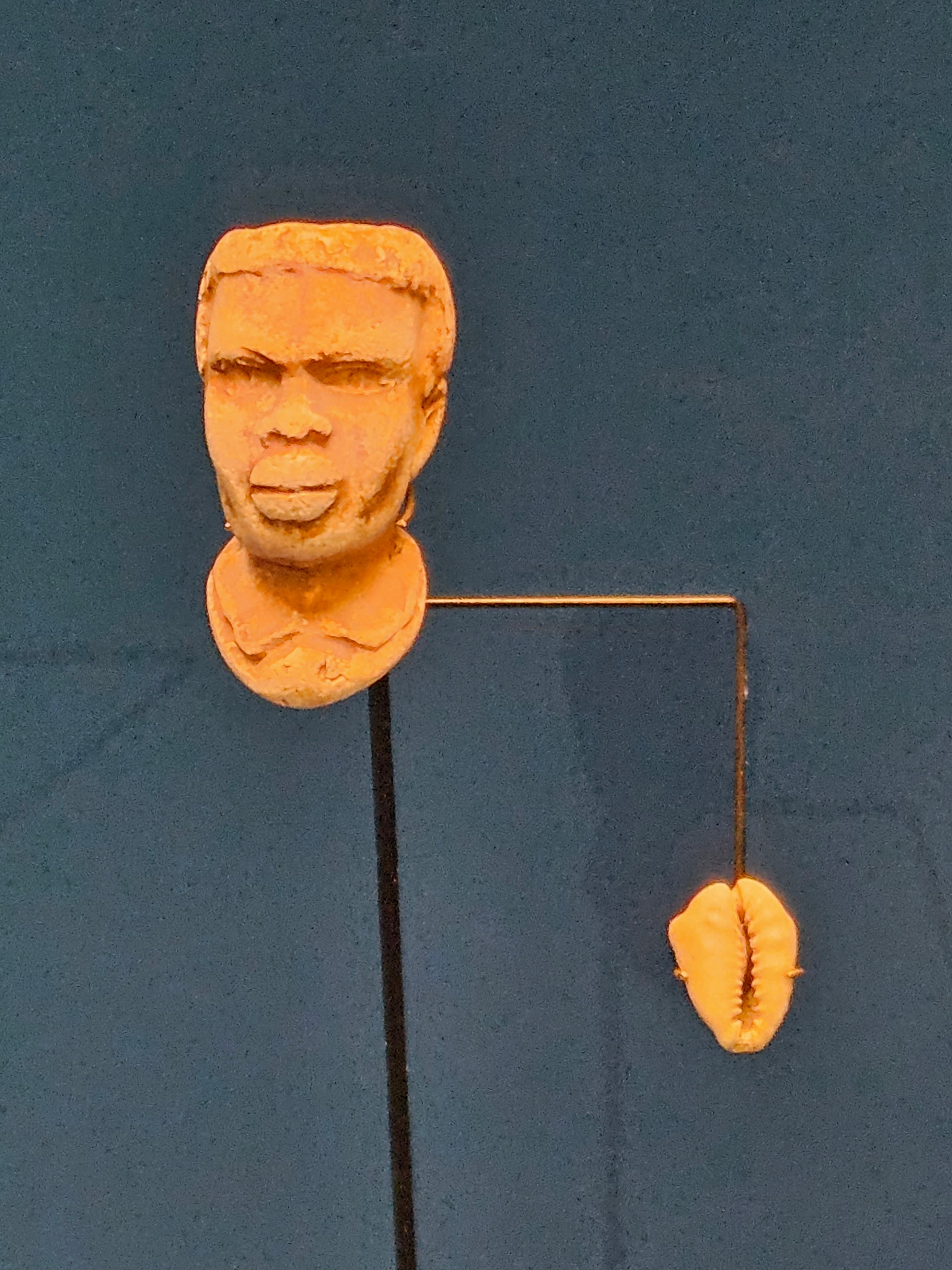 The items on the left are a small tobacco bowl (the top of his head is open to place the tobacco in) and a small shell used as a form of currency in Africa. The item on the right may look like simple rope, but it’s actually tobacco twisted together for shipping, along with a pipe.