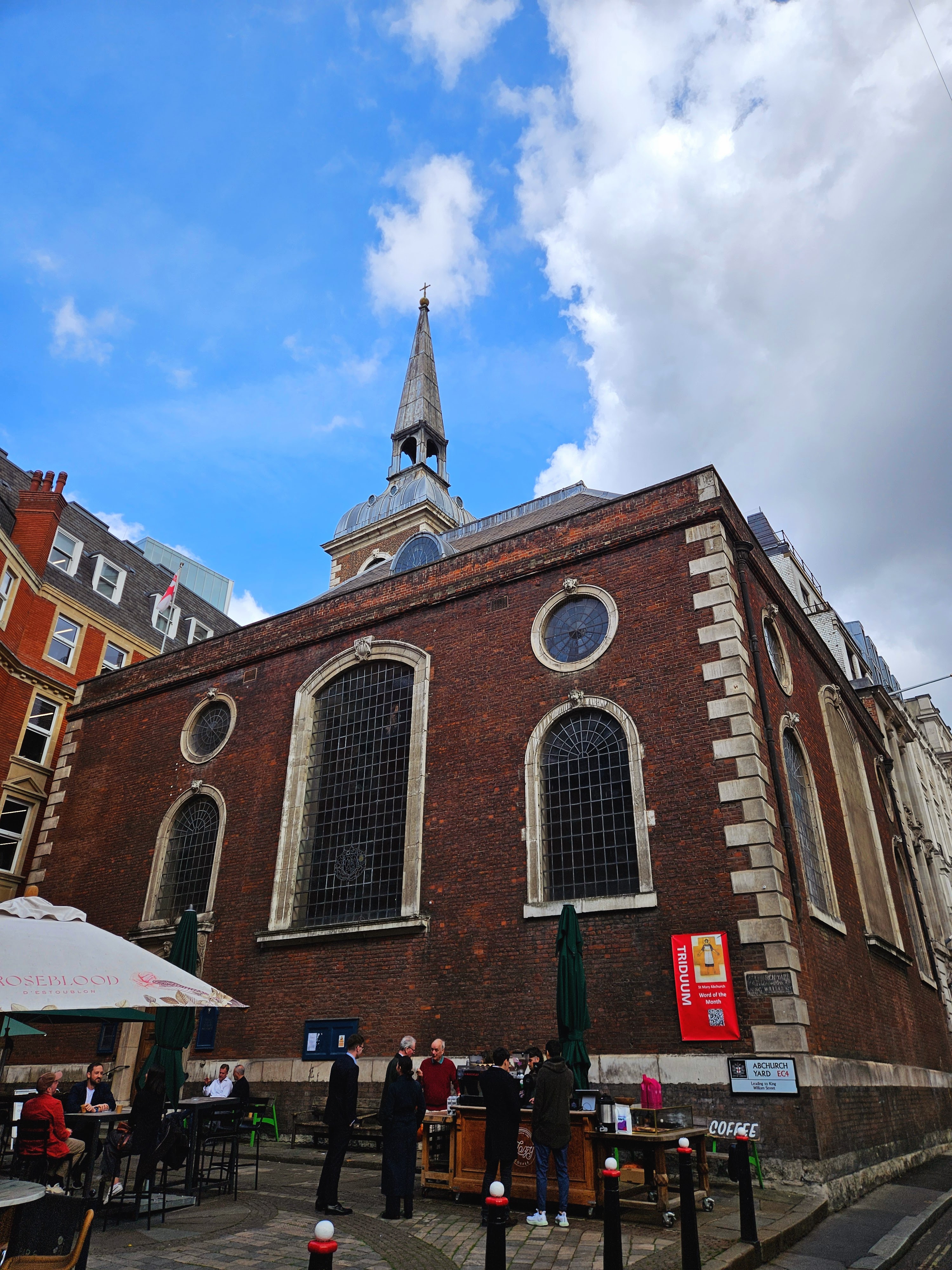 So how was the tour itself? At around two hours long, it was full of good information, both about the specific sites we visited and the City of London in general. Right off the bat, we learned that, although 650k people WORK in the City of London (lots of businesses in all those tall buildings, after all), only about 9k people LIVE in it. That’s a pretty big difference, eh? Similarly, before the Great Fire in 1666, there were 87 churches in the City of London, while today, there are 46 (both numbers are pretty high, considering how physically small the area is). We did go to a couple of churches and learned that, because such a small number of people live in the area, most of these churches don’t actually have congregations, so if you show up on a random Sunday to attend a service, you’ll likely just find a locked church. Instead, your best bet to getting to see inside some of these historical churches and to talk to someone who’s passionate about their history and architecture is to visit when a volunteer from The Friends of the City Churches is there. This group is a charity “dedicated to preserving the beautiful and unique churches found within the square mile of the City of London” and a couple of their volunteers happened to be at the first church we stopped at, St. Mary Abchurch. Keep an eye out for them when you’re wandering around the City!