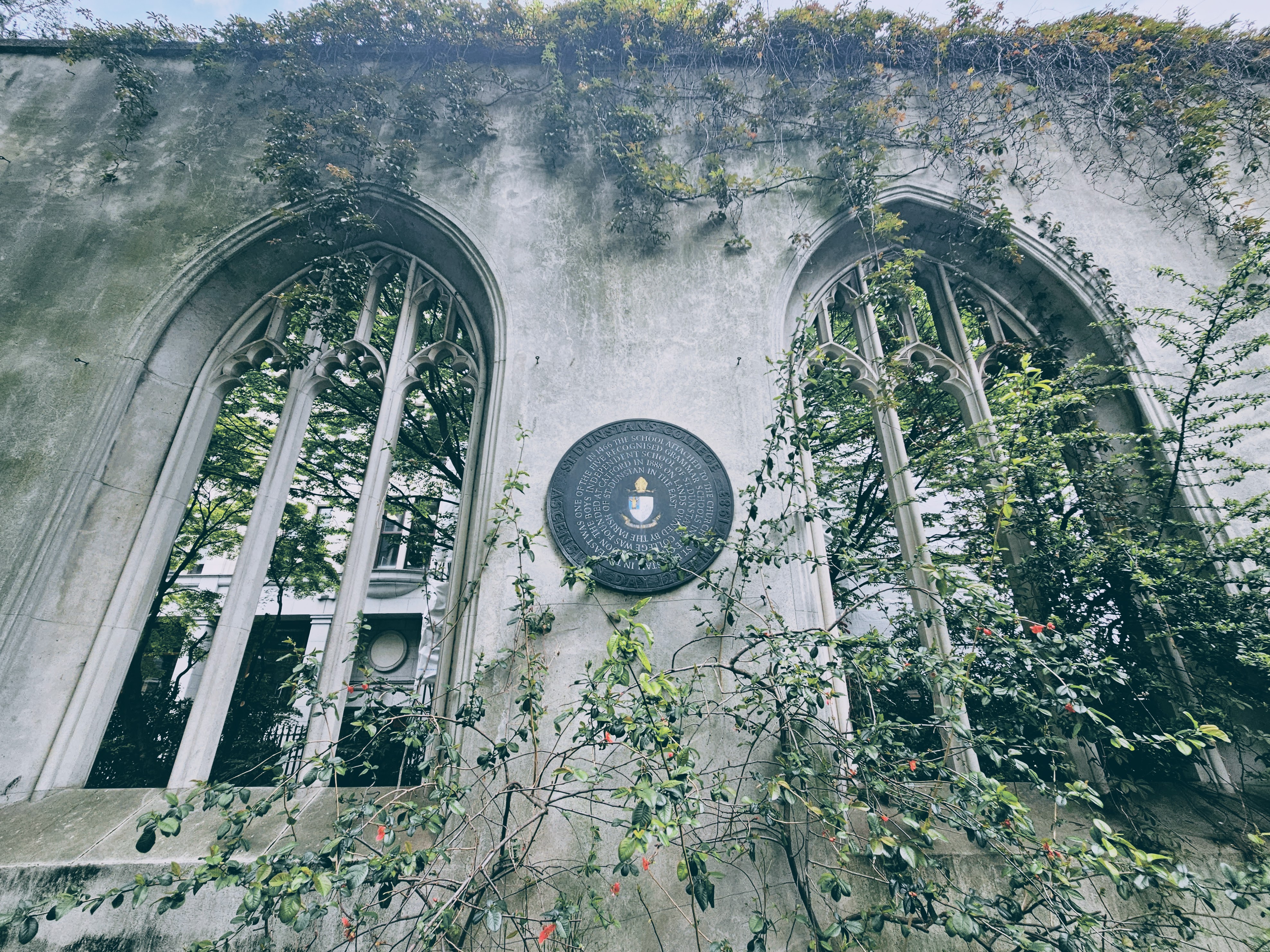 And that was the end of our tour! It was well done and informative, so I’m really glad we did it. And again, what great weather for a walking tour! We were going to stop in at The Black Friar for a drink and/or meal, since we’d ended the tour there anyway, but there was a bit of a wait, so we decided to soldier on. And by “soldier on” I mean that we caught the tube to a location that both Felicity and I kept seeing pop up on social media leading up to the trip – St. Dunstan in the East. This is a combination of one of those London green spaces and some cool ruins. You know, the kind of thing you just don’t see in the US! Originally built in the early 1100s and notably damaged in the Great Fire, it was ultimately (mostly) destroyed during the blitzes in World War 2. Although it could have been rebuilt again after that, the Anglican Church decided not to, so now it serves as a public garden/green space. And over the years, neither Felicity nor I had ever visited! There isn’t actually a lot to it, but it’s a cool space for sure, both for the ruins and for the greenery that grows within them, so it’s worth visiting.