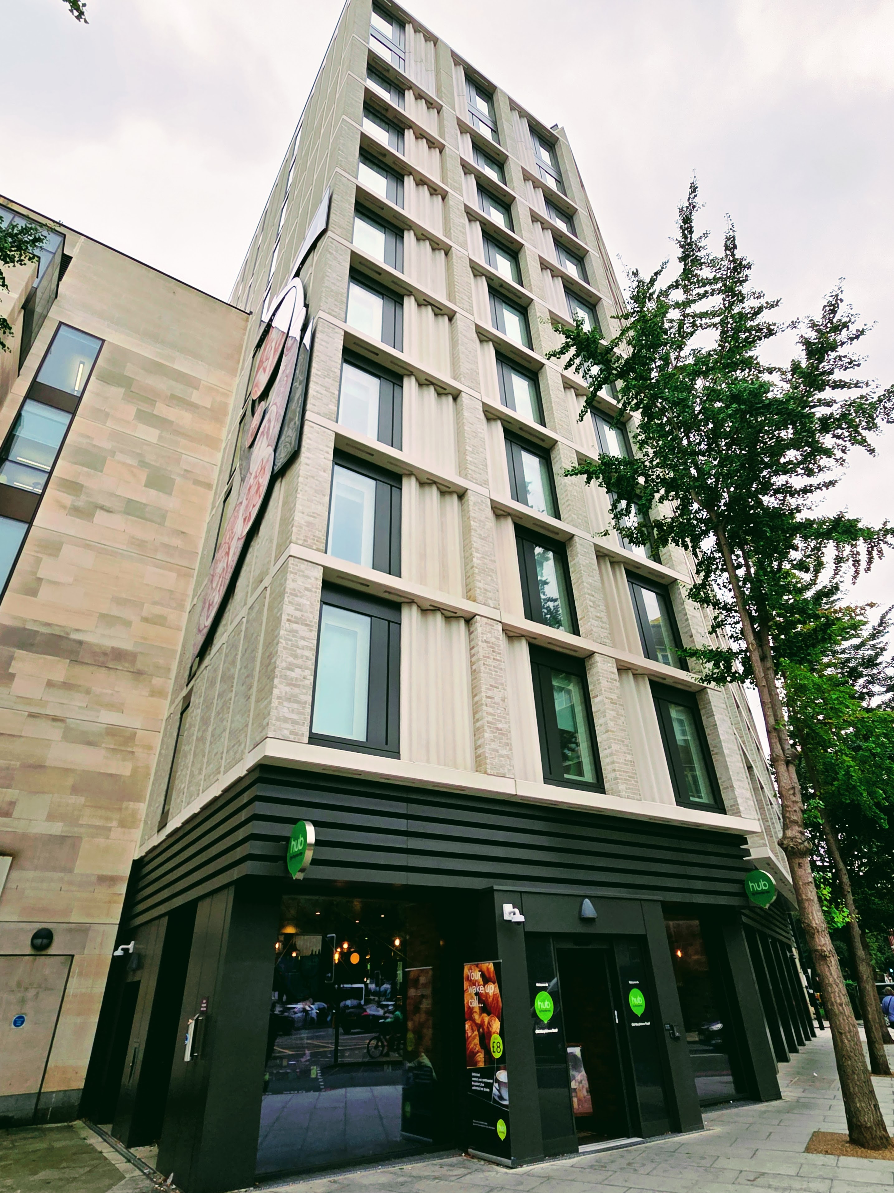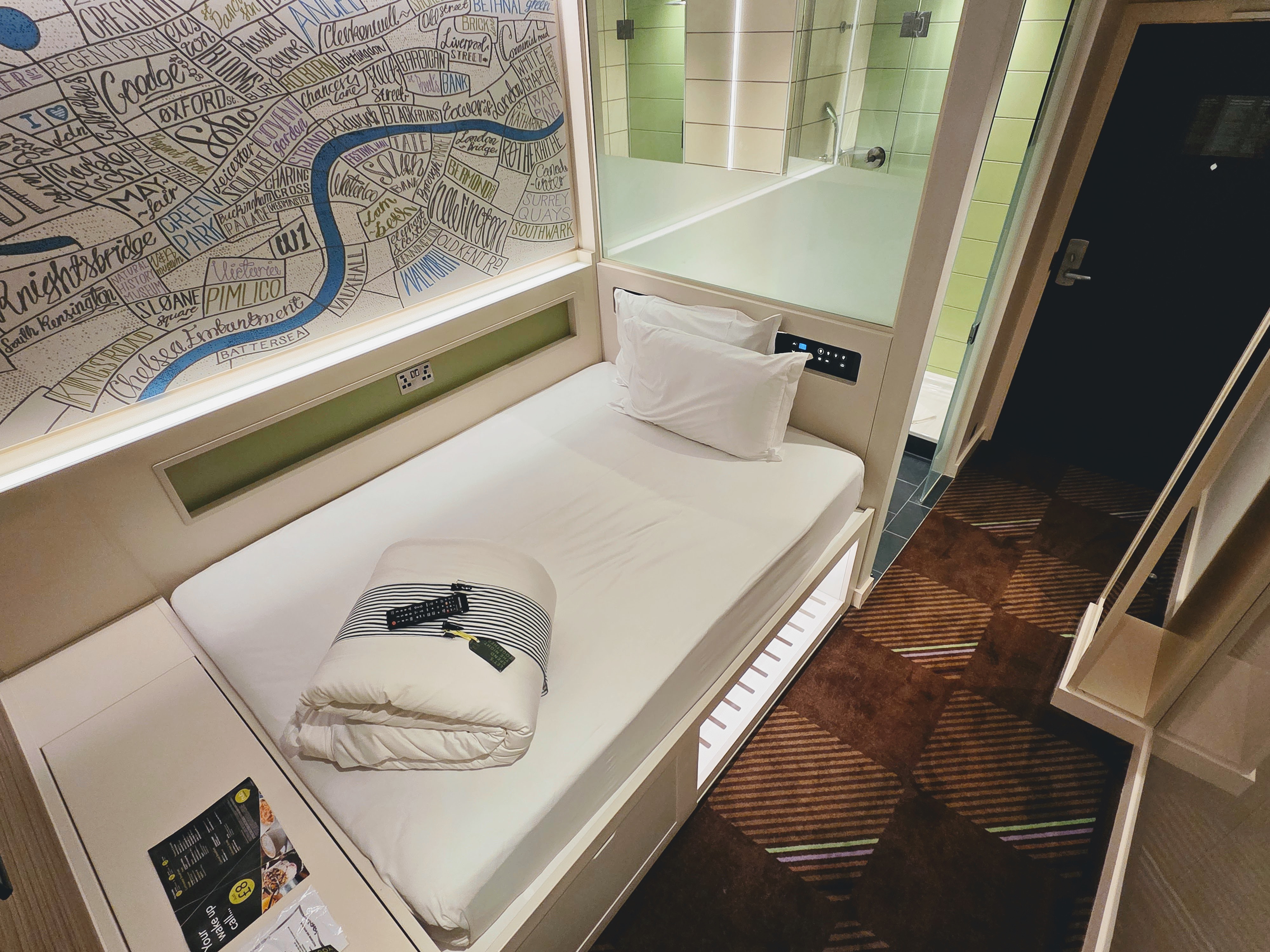 You already know what I’ve been up to thus far on the trip, since I wrote my first post just this morning! Since then though, I migrated from the Roxy Excel to the Hub by Premier Inn London Marylebone, which is shaping to be a perfectly cromulent home away from home for the next six nights. Regular readers will be familiar with these hotels because I’ve stayed at them on several London trips as they continue to be comfortable and reliable. Long may that continue! This is another new-to-me-branch and I’m actually in a ground floor room with no window (just a “simulated one”) this time, which I’ve never done before as I’ve always asked to be put in a room with a window on previous trips (I figure since I’m staying in these hotels for several nights at a time, it’s nice to get a little natural light), but this time, I just checked myself in via the kiosk in the lobby, so didn’t have anyone to ask about getting one. I like a really dark room when I sleep and you can’t get darker then a room with no ambient light, right?? Check out the (windowless) room below!