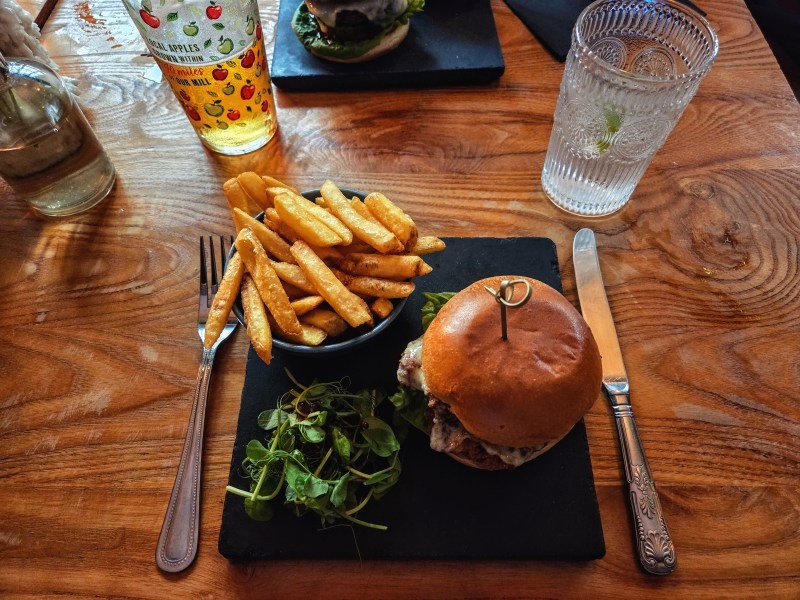 I actually wasn’t able to get into my room right away as it was only about noon when I arrived from my other hotel, but I knew I could have the hotel staff hold my luggage for a few hours, so I dropped it at the front desk. Although Bill is staying at the Moxy for the rest of his time here (and was enjoying sleeping in late, so didn’t make the journey with me), my other friend Felicity is staying at the Hub with me and she was just about to arrive after I got there. Our original plan was to all travel together, but as she was also flying standby, but from Chicago, her best shot to get to London was actually by connecting via Boston, which she did, with a several-hour layover in the airport there. She soldiered through it like a champ and landed in London around 6:30 AM – oof! While the plus side of that is that she had a whooooole day after arriving (nice to not have to burn a day due to travel), it also meant she had to stay awake that whole time as well. She filled her time with travel from the airport, walking around Regent’s Park, a croissant, and even a manicure, and then managed to sync up with my hotel arrival almost perfectly as I only had to wait about five minutes for her. A proper meal was her first priority, so we headed out to a nearby pub, The Thornbury Castle, to grab lunch. We had a nice meal of a bacon cheeseburger for her and a chicken sandwich for me, enjoying conversation, food, and a pretty quiet pub (it didn’t start getting busier until right before we left). While there was nothing stand-out about the experience, it was certainly fine and I’d go back there again!