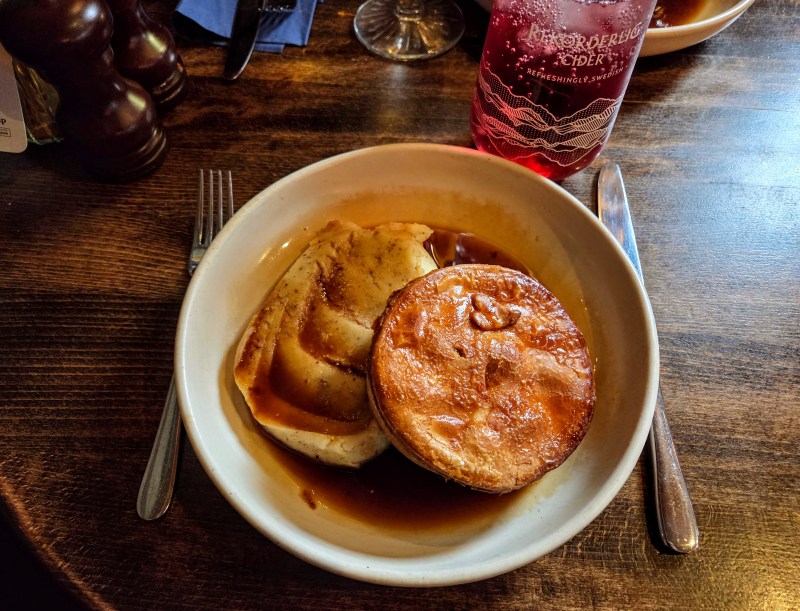With nothing else planned for the rest of the day, we did some wandering and decided to have a pub (late) lunch, so we were on a quest to find a good pub. We stopped by one, but they had just given their last available table to the small group that walked in ahead of us, so we walked a bit further on until we found The Clarence, which looked fine and, more importantly, had available seating. π I had some pie and mash, along with a fruity cider, all of which were very tasty!