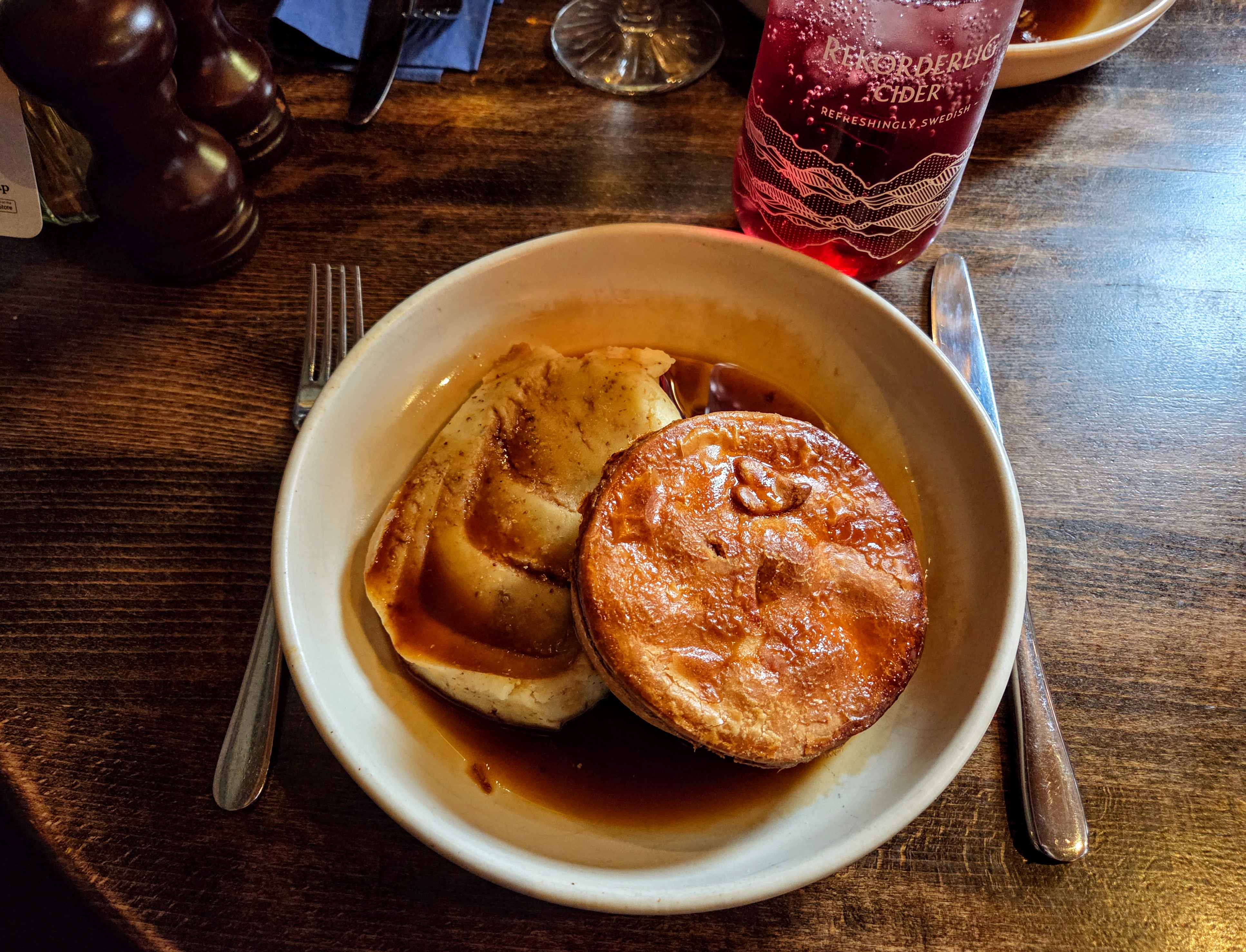 With nothing else planned for the rest of the day, we did some wandering and decided to have a pub (late) lunch, so we were on a quest to find a good pub. We stopped by one, but they had just given their last available table to the small group that walked in ahead of us, so we walked a bit further on until we found The Clarence, which looked fine and, more importantly, had available seating. π I had some pie and mash, along with a fruity cider, all of which were very tasty!