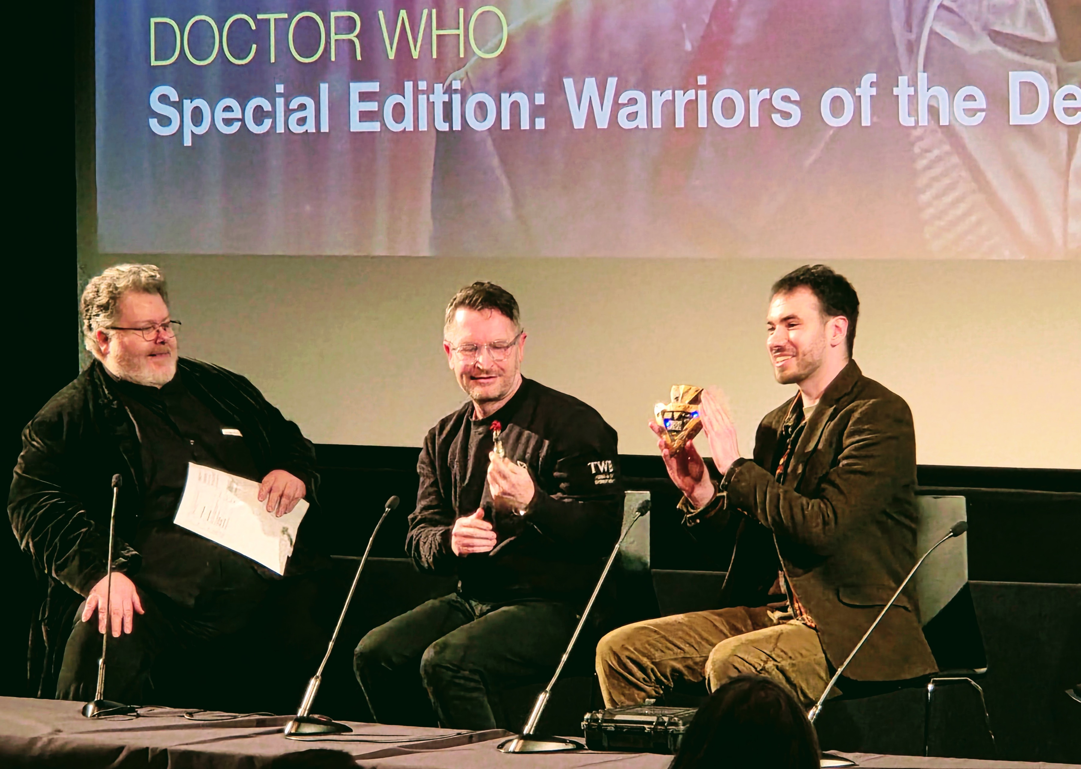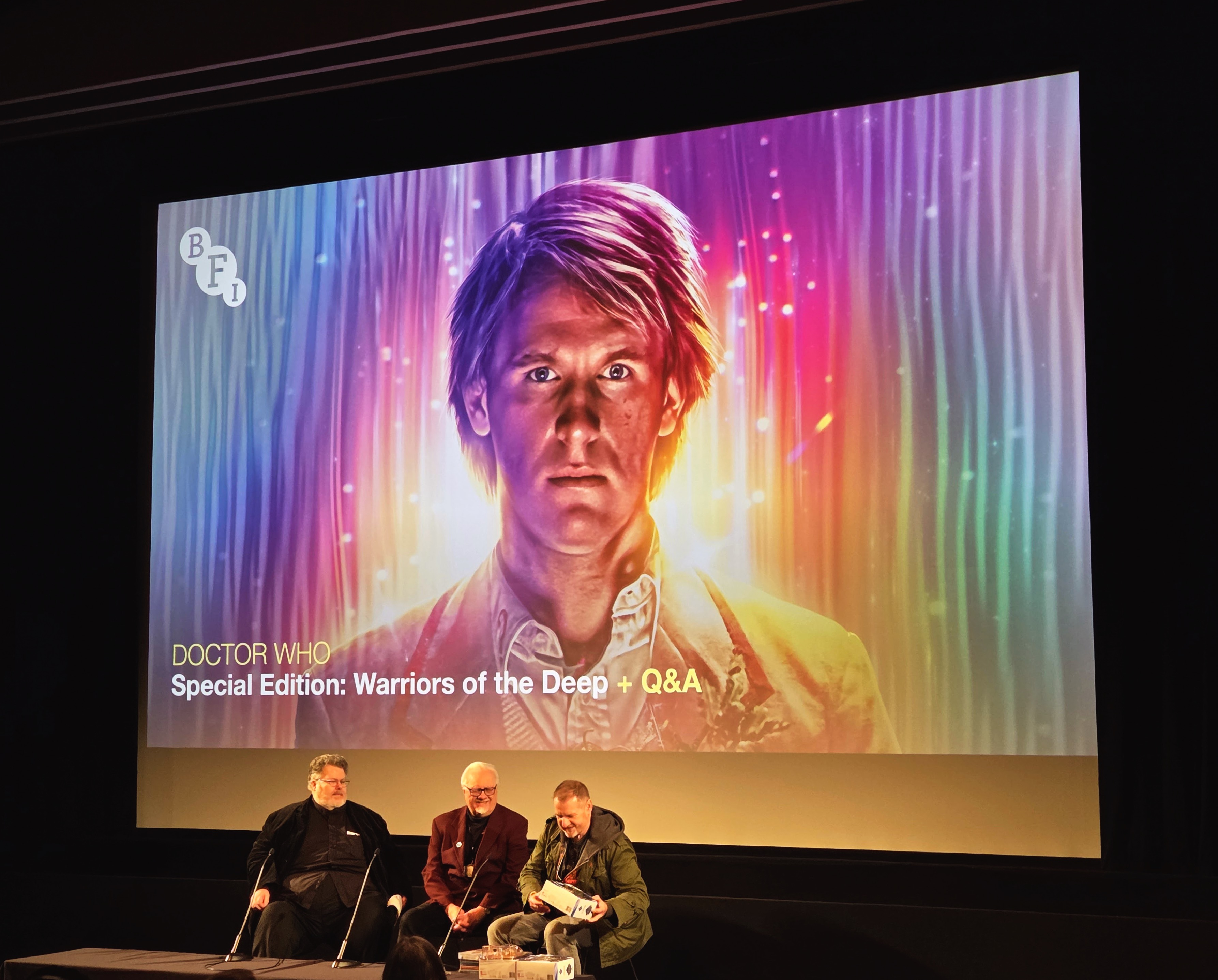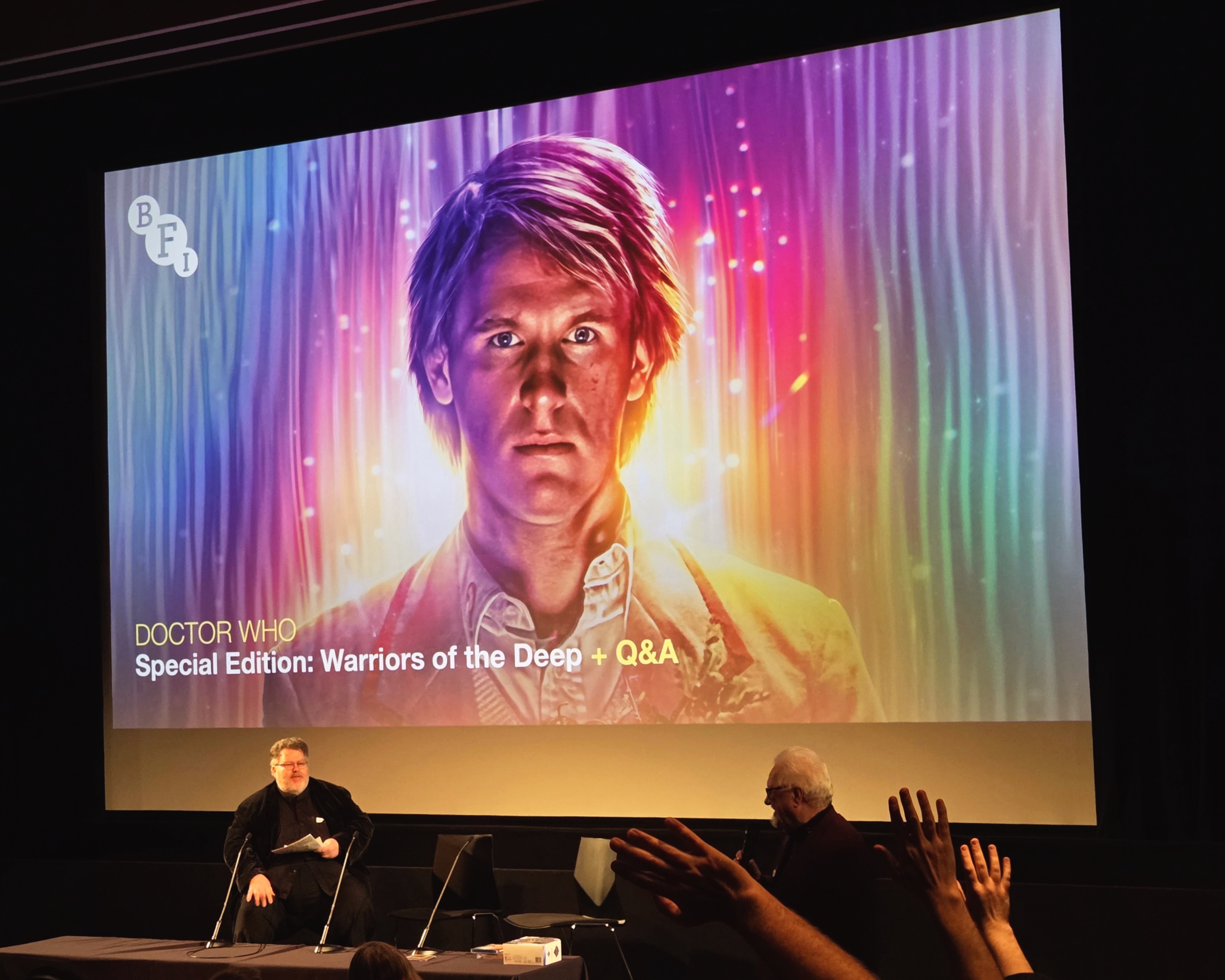 Justin and Dick from the BFI getting things started, followed by a quick conversation with Al Dewar from Character Options (the company that makes Doctor Who action figures, which will come into play momentarily), plus a shot of hands in the air during the short quiz.