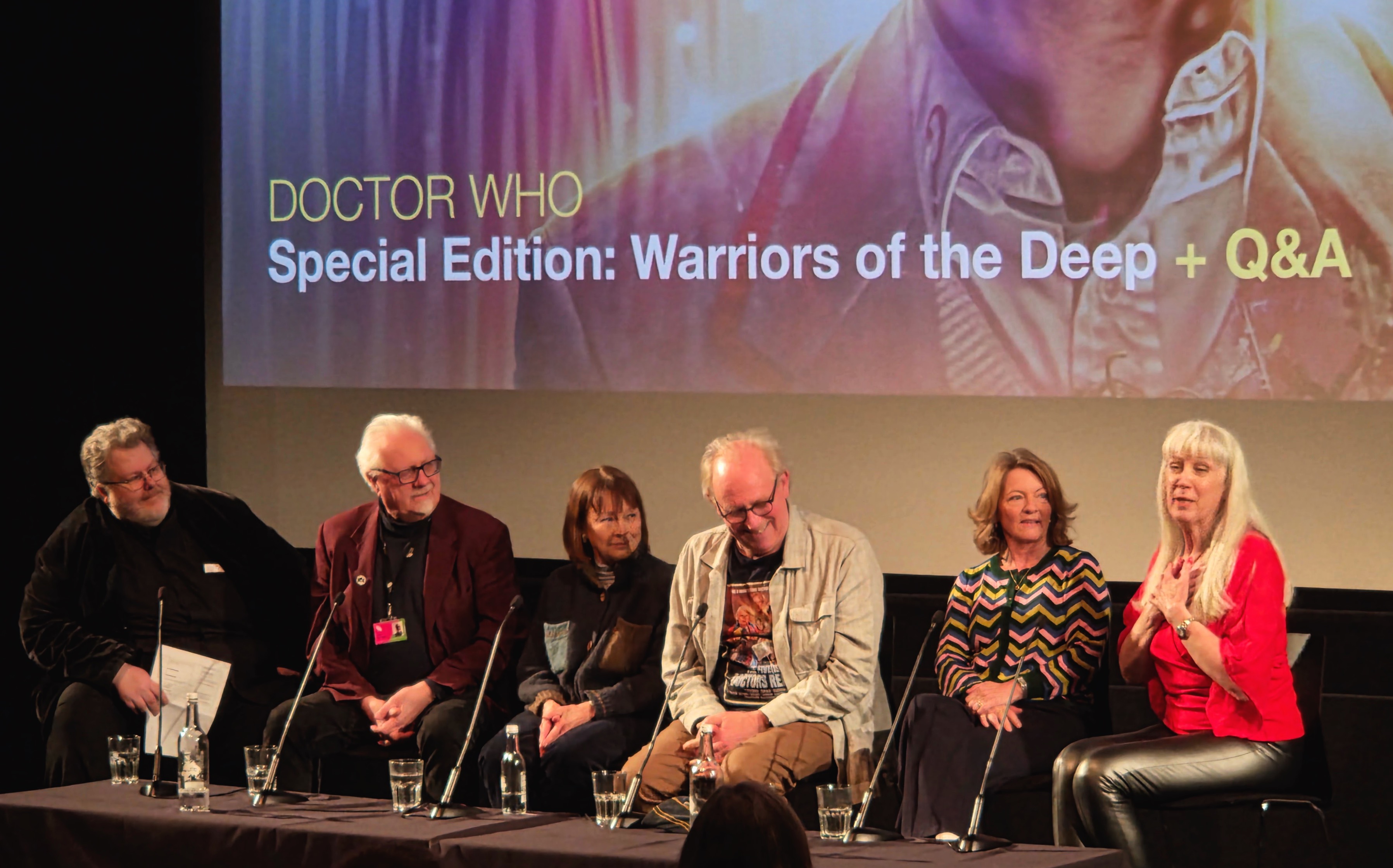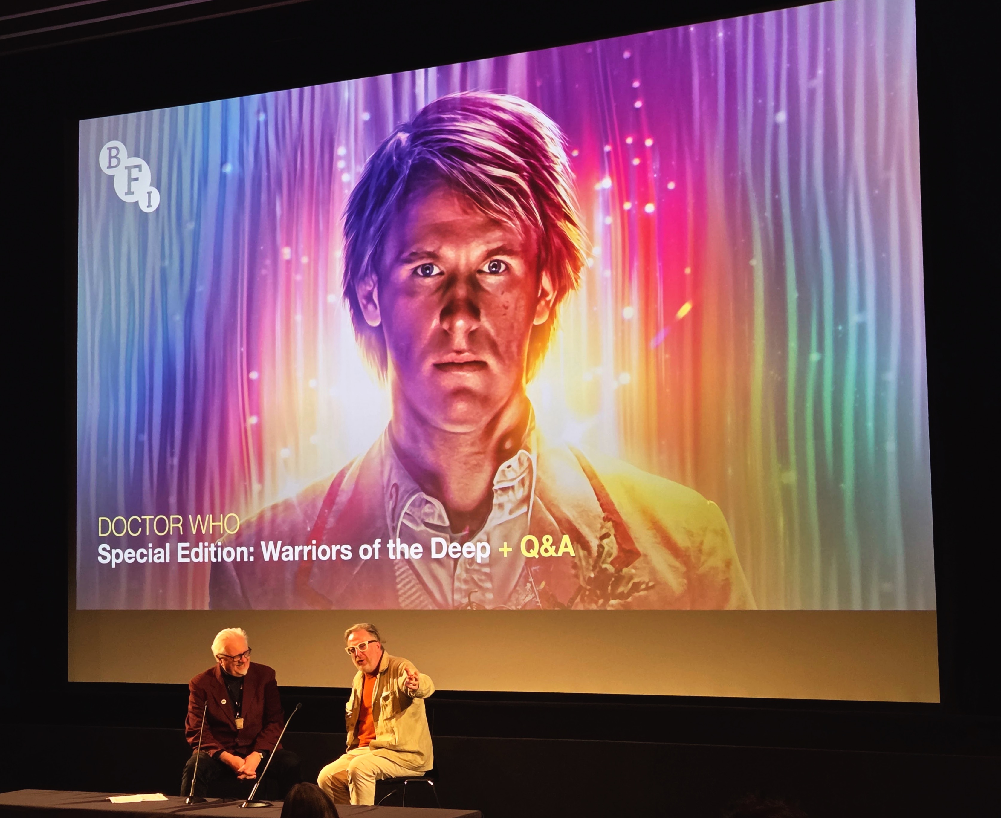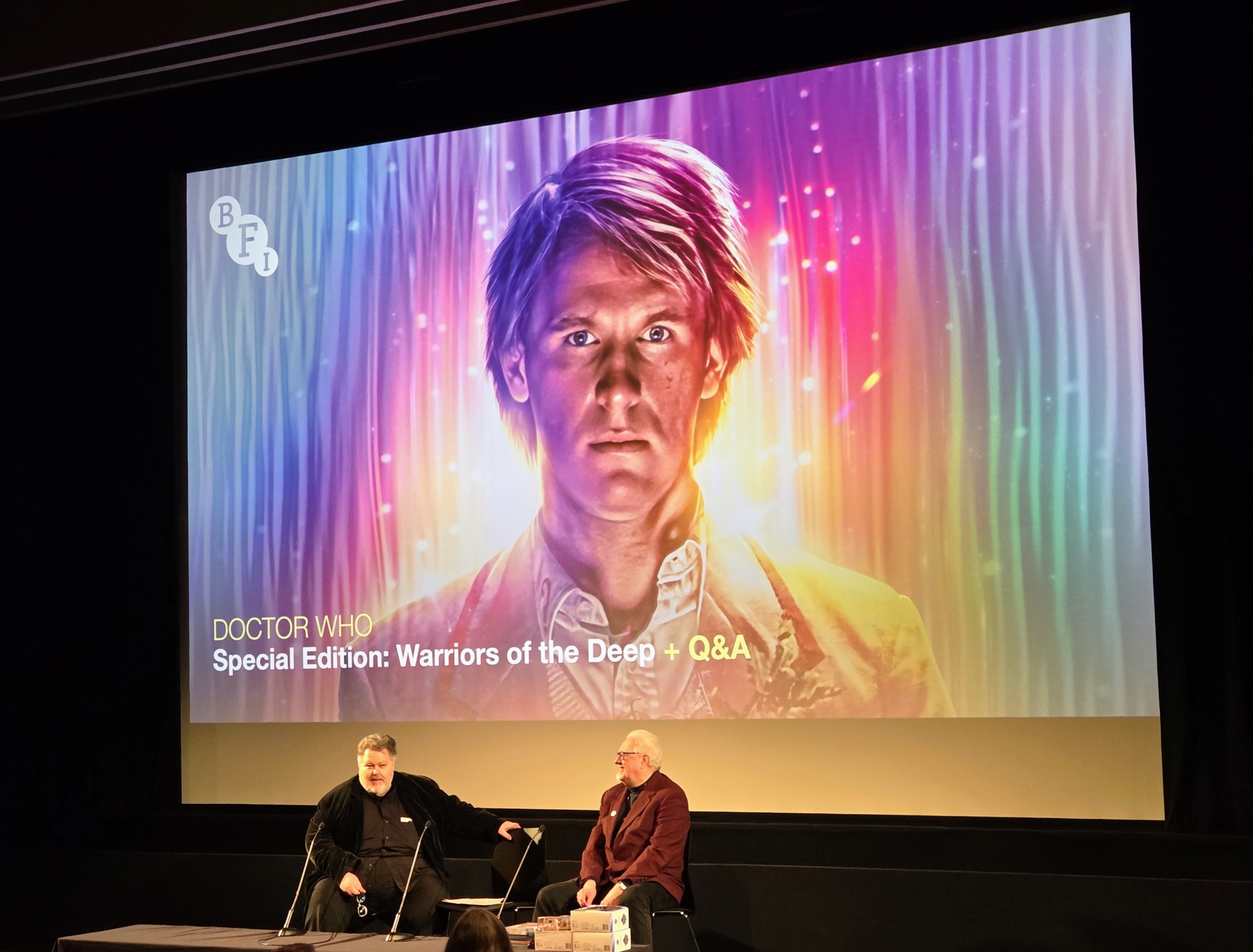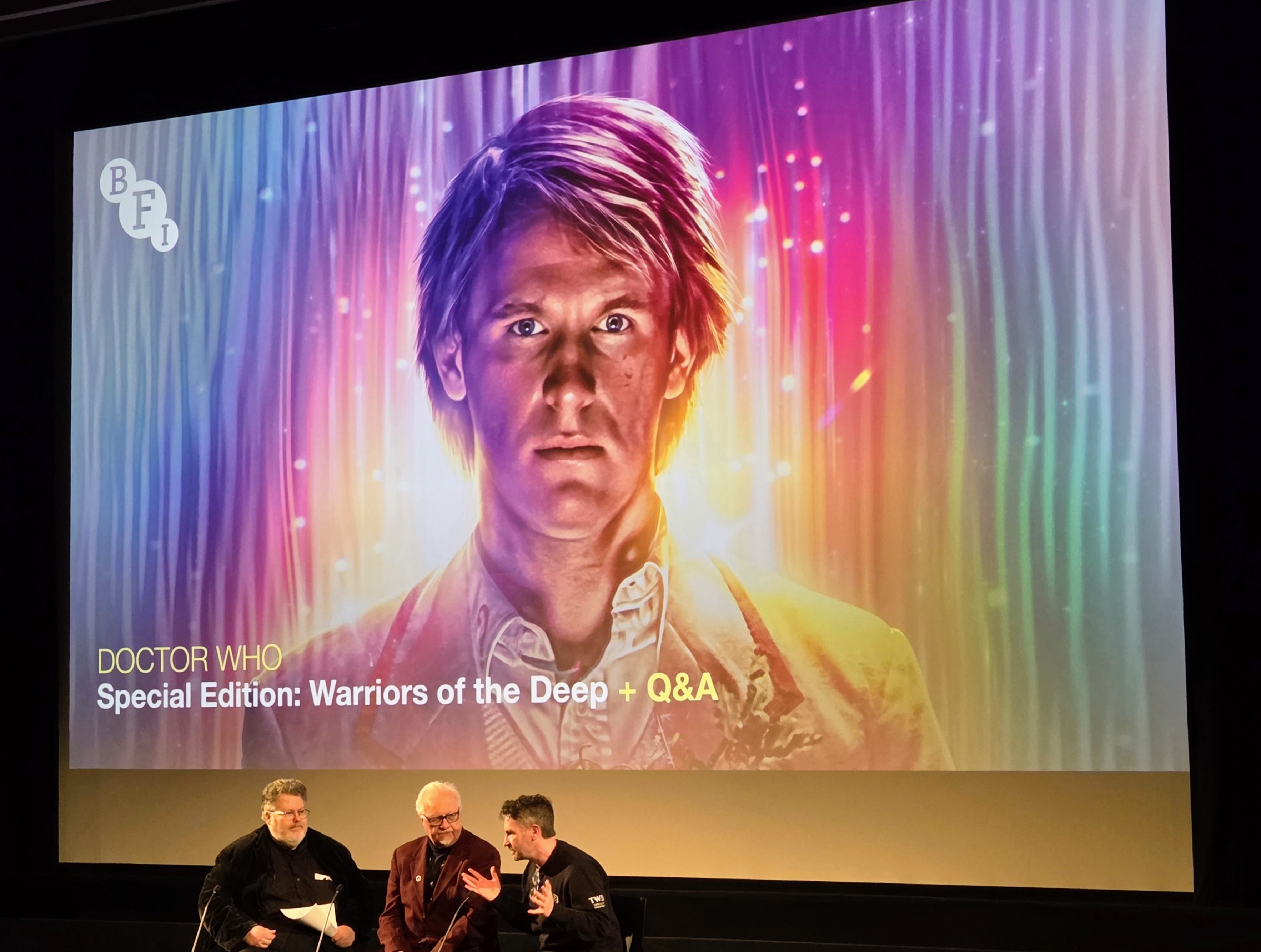 Justin and Dick from the BFI getting things started, followed by a quick conversation with Al Dewar from Character Options (the company that makes Doctor Who action figures, which will come into play momentarily), plus a shot of hands in the air during the short quiz.
